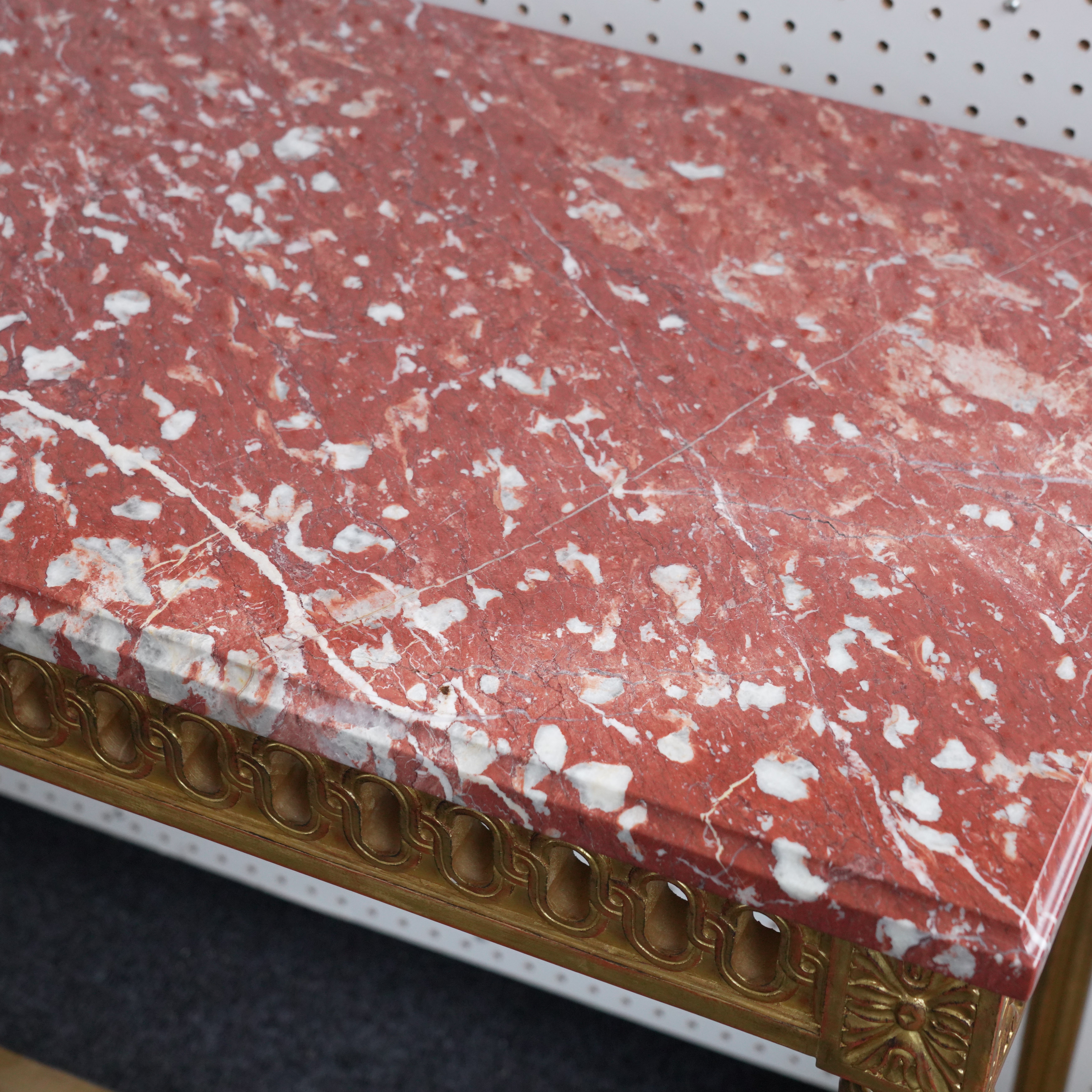 With rouge marble top over gilt base with pierced frieze on six fluted supports, 293cm wide 50cm deep; 91cm high