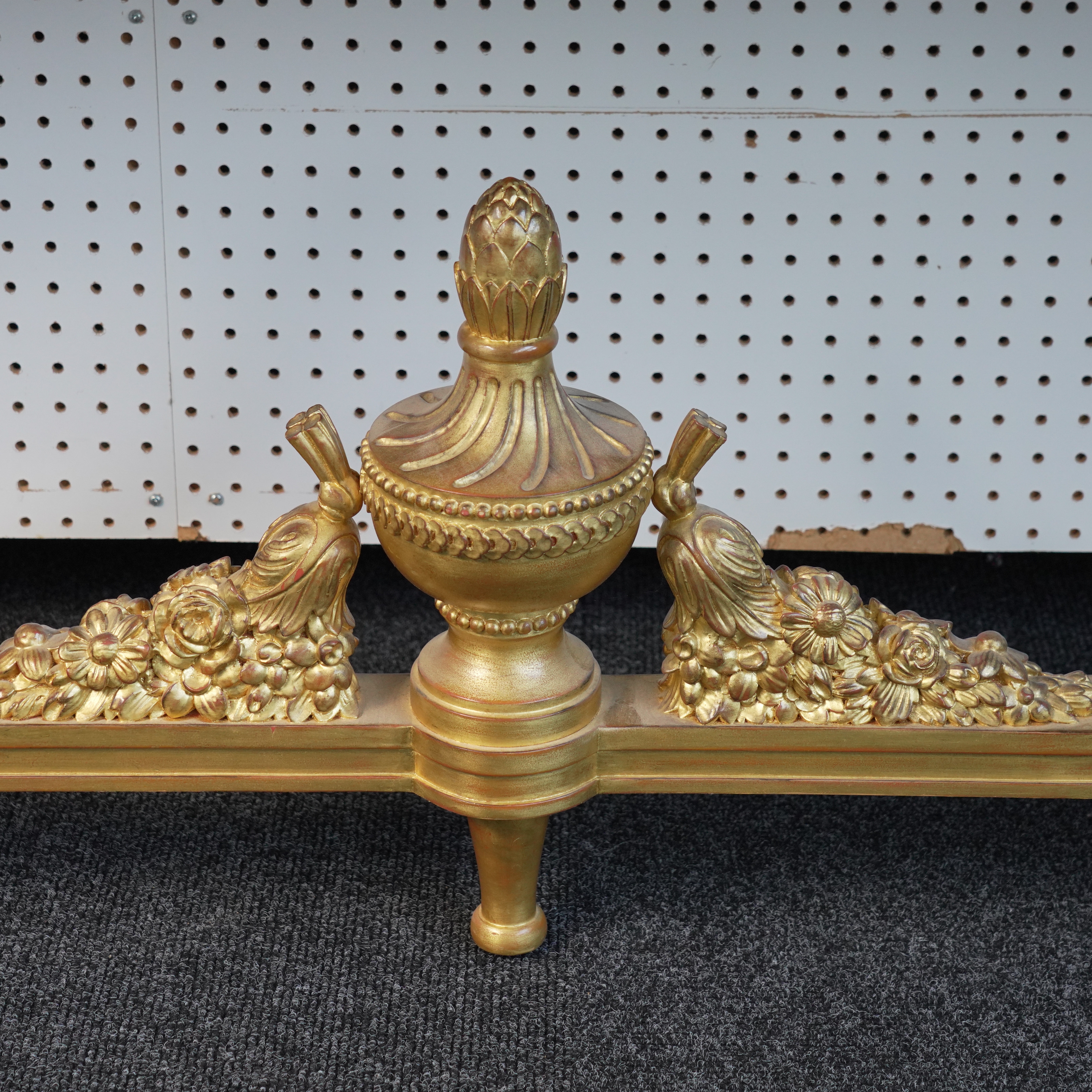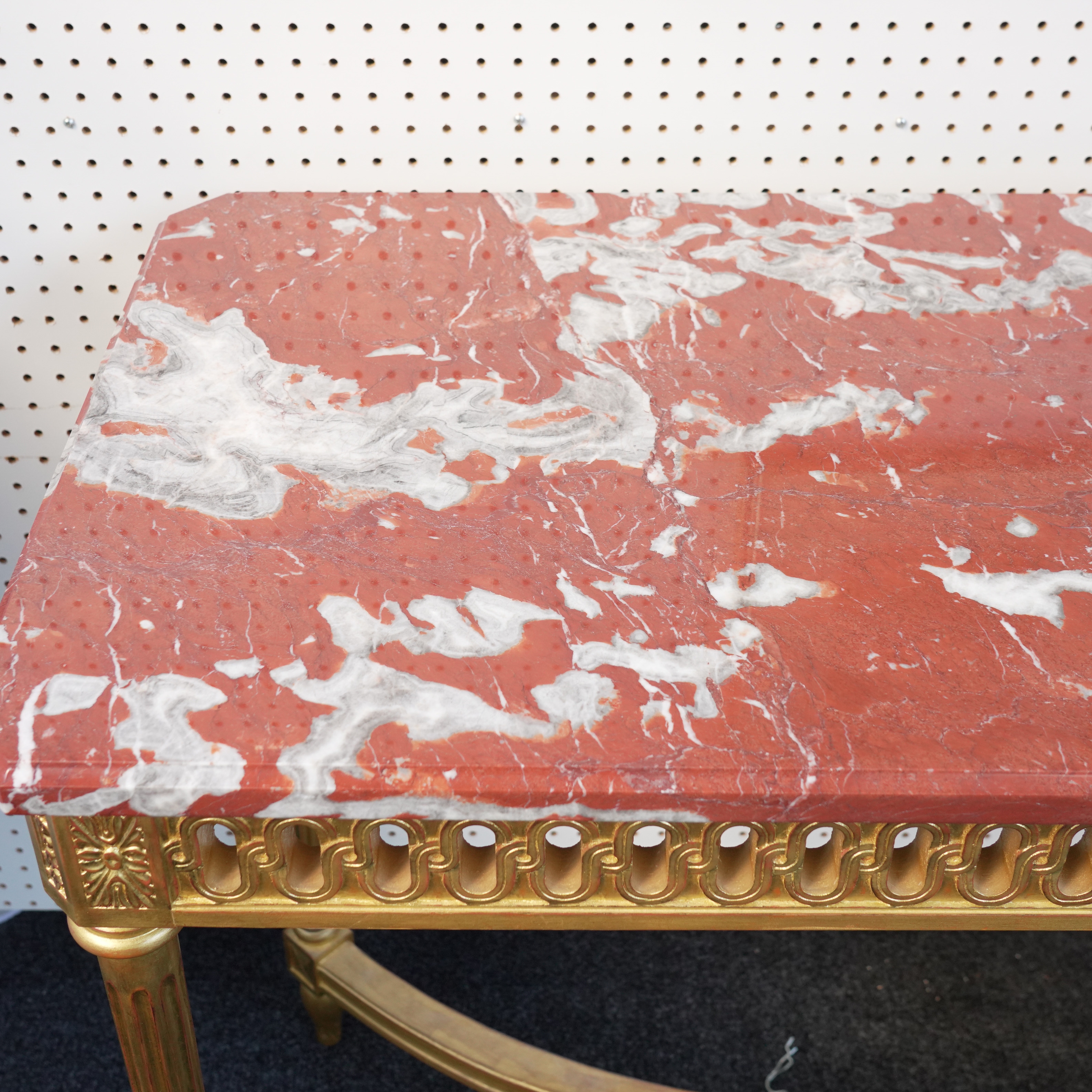 With rouge marble top over gilt base with pierced frieze on fluted supports united by urn stretcher, 200cm wide 55cm deep; 90cm high