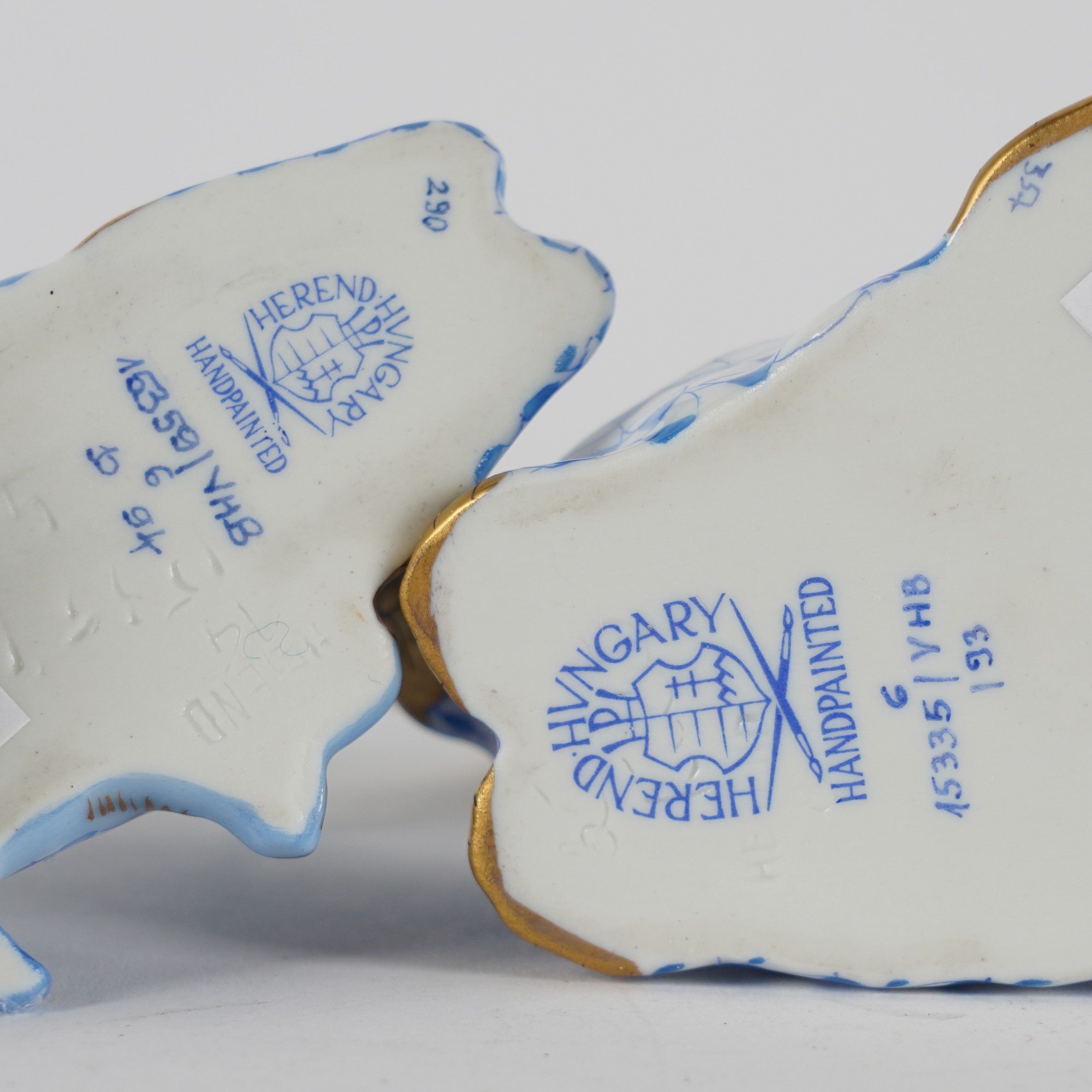 Comprising; a blue fishnet otter with oyster, 20cm length; a blue fishnet seated rabbit, 14cm high; a blue fishnet recumbent rabbit, 11.5cm length; a blue fishnet unicorn, 8cm length and a white glazed seated rabbit, 14cm high, blue printed and painted marks; also a Herend Queen Victoria pattern two-handled tureen and cover, blue printed mark, 18cm wide