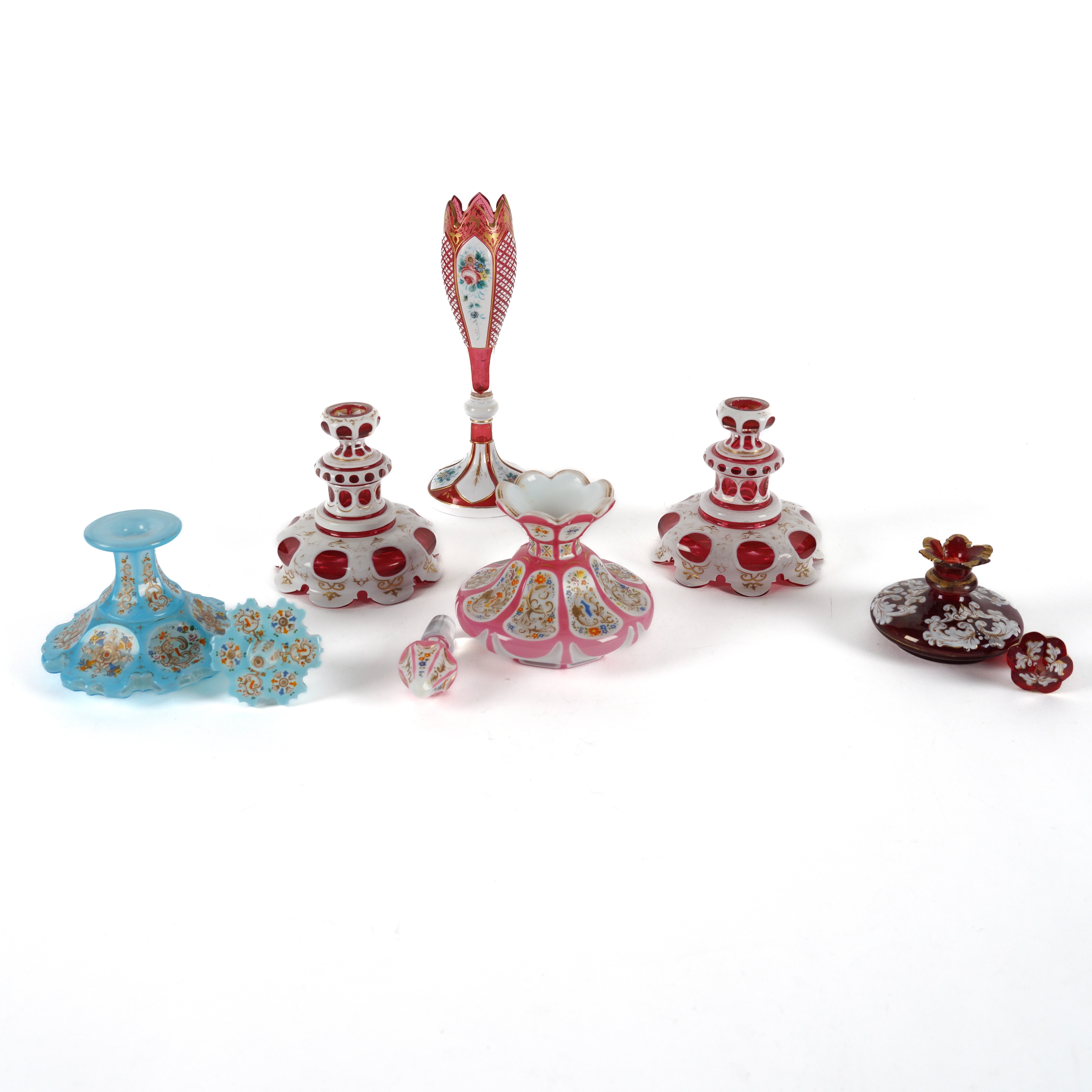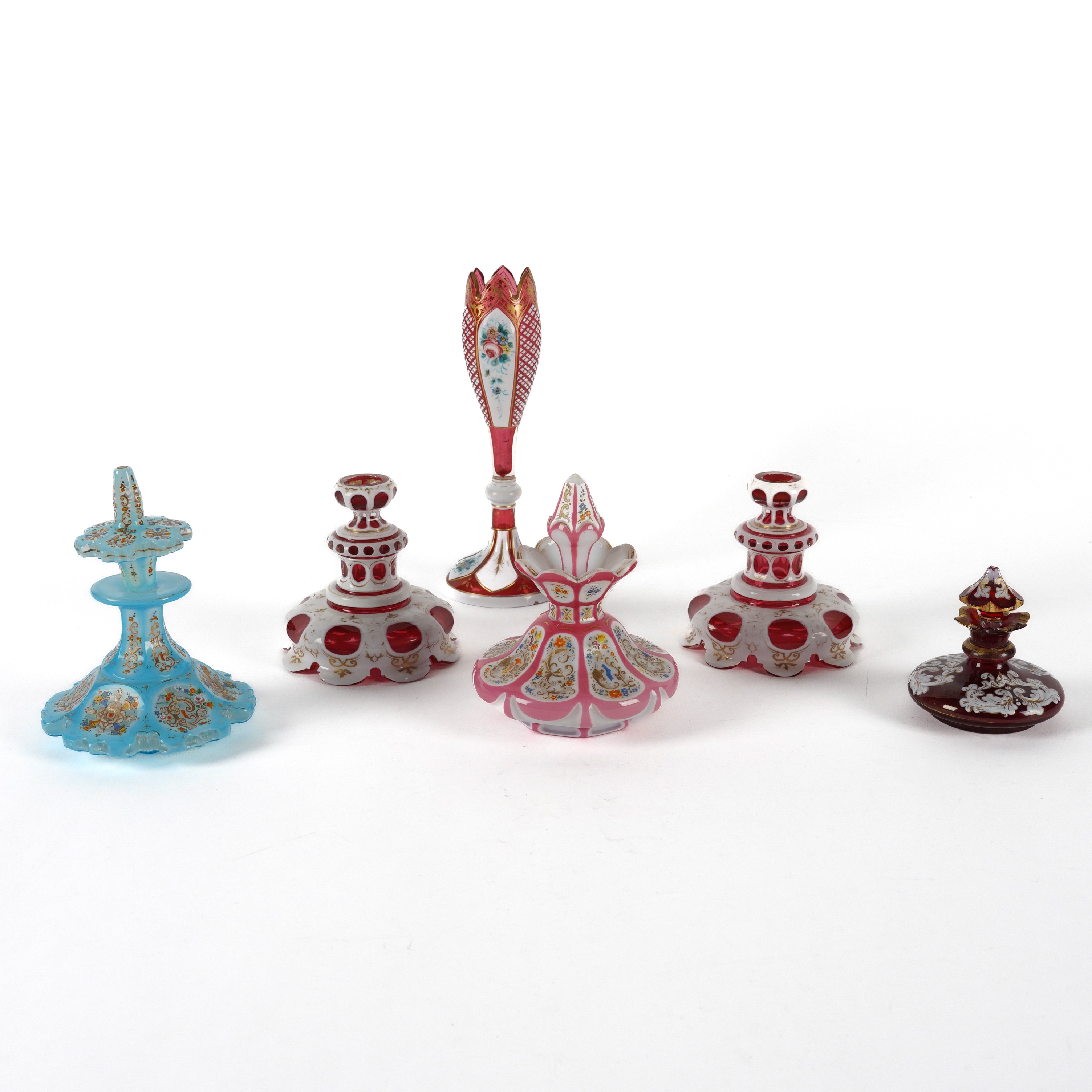 Overlaid in pink and enamelled and gilt with panels of flowers and scrolls, 14cm high; also a Bohemian blue overlay and enamelled glass scent scent bottle and stopper, 15cm high; a small ruby glass and white enamelled scent bottle and stopper, 9cm high; a white overlay ruby glass bud vase enamelled with flowers, 21.5cm high and a pair of white over ruby glass stands, 11cm high