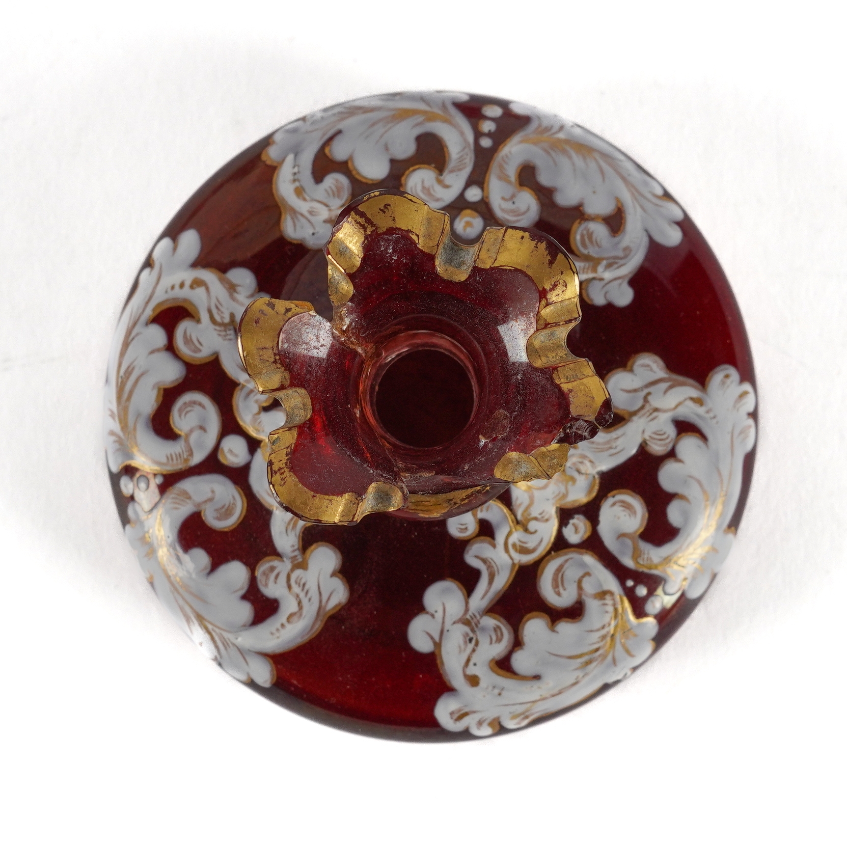 Ruby glass bottle- large chips and glued repairs to the rim and neck of the bottle. Glued repair to the stem of the stopper and a chip to the tip of its top. Some wear to the gilding