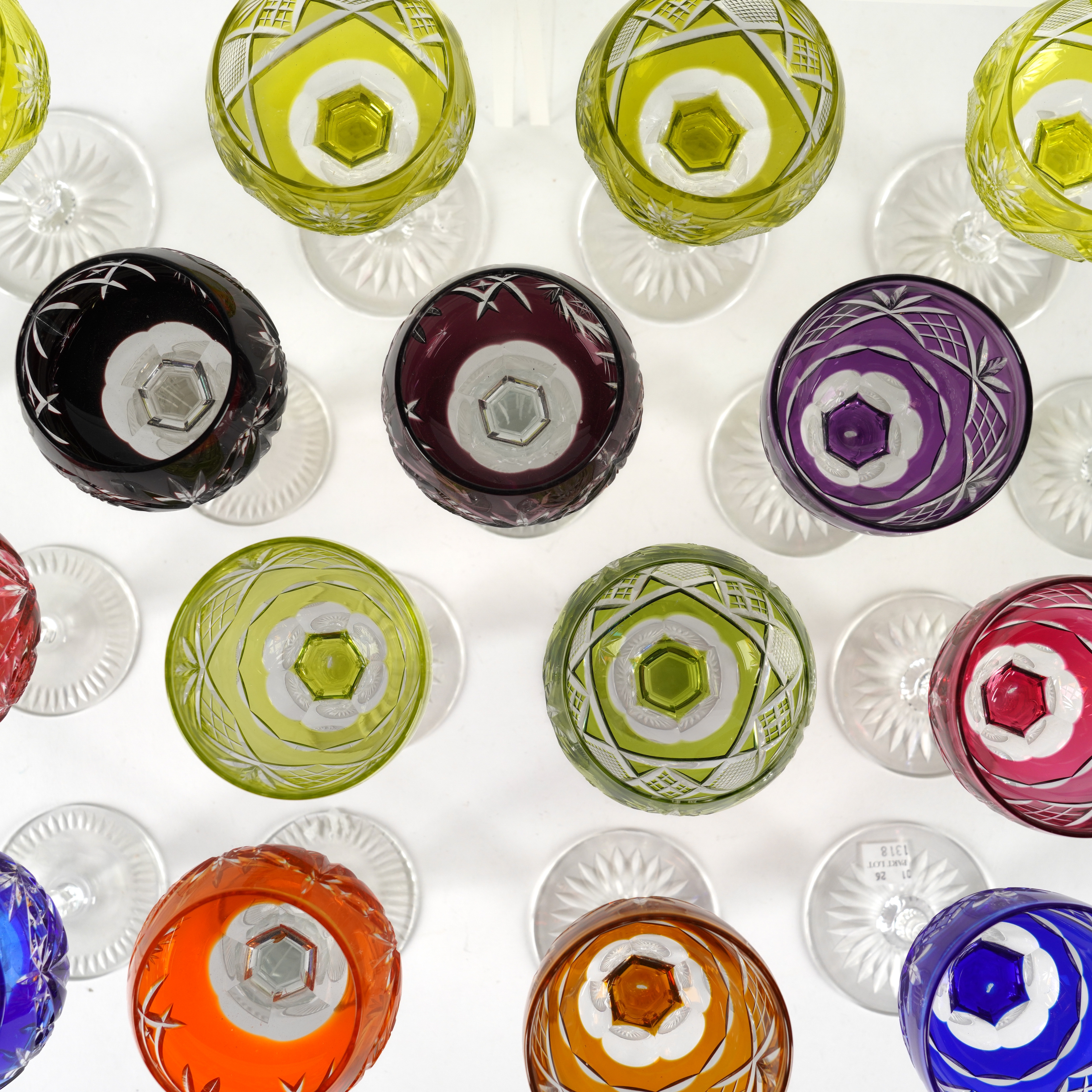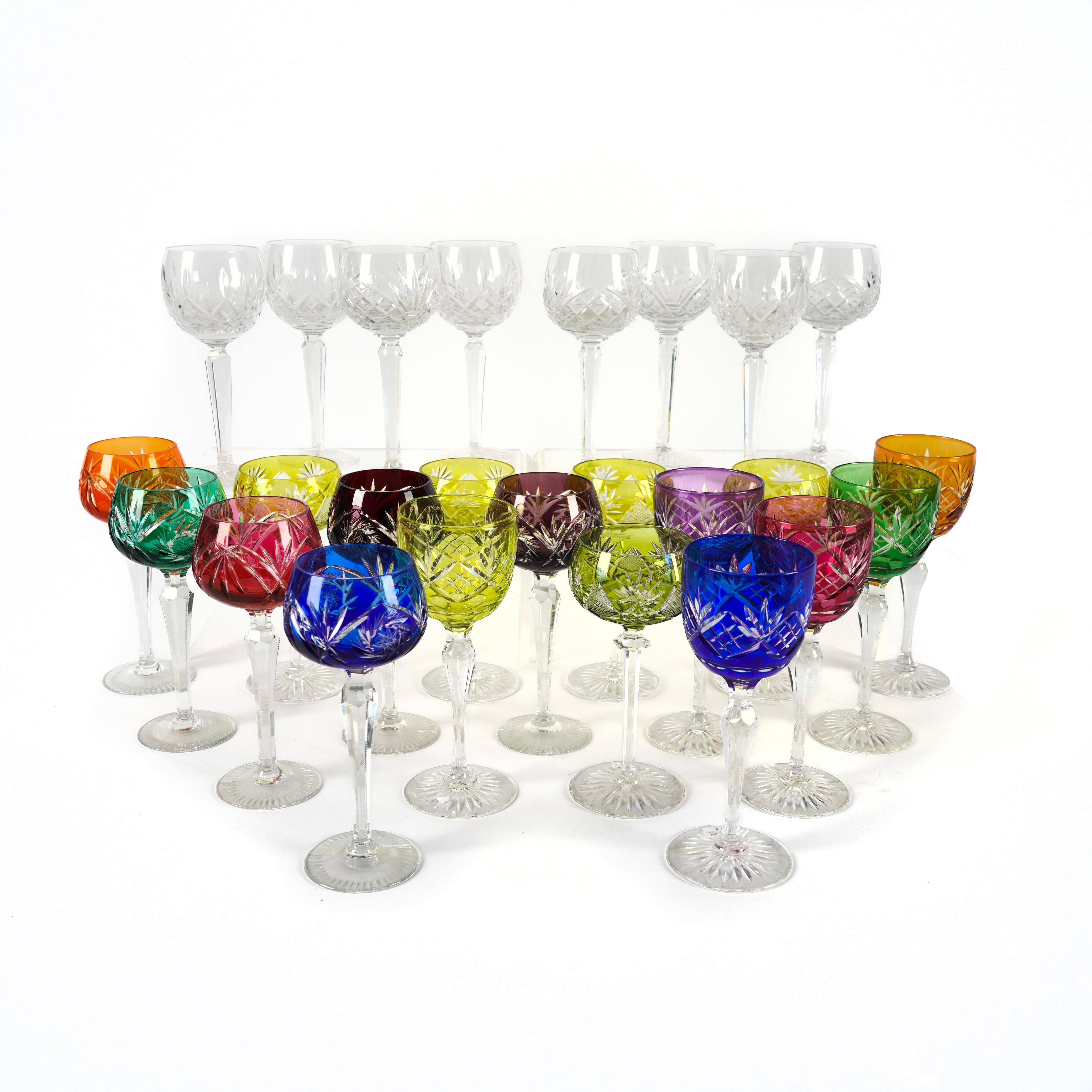 One of the baluster stemmed harlequin glasses has an internal fracture to the top of the stem, approx.1cm length. Otherwise in overall good condition