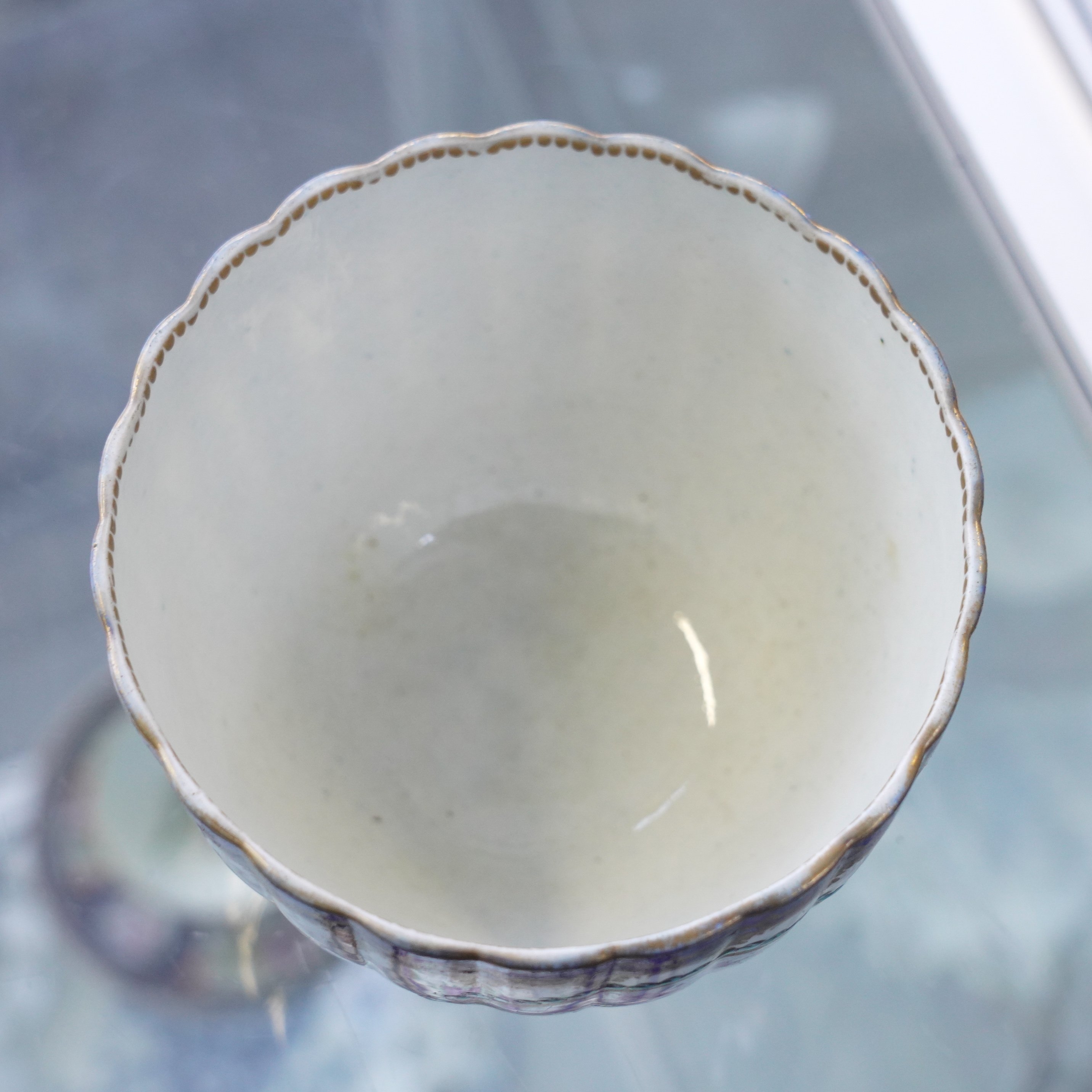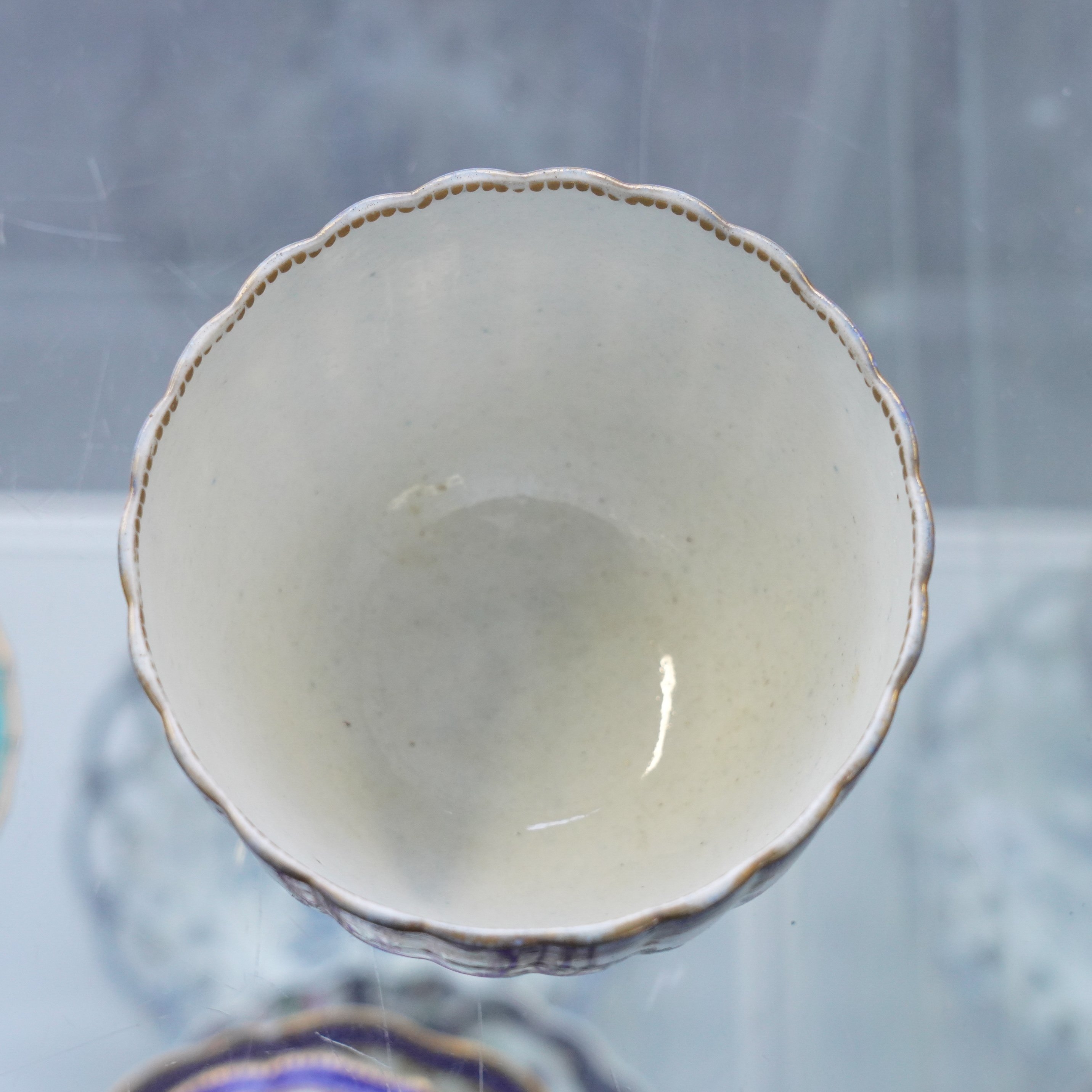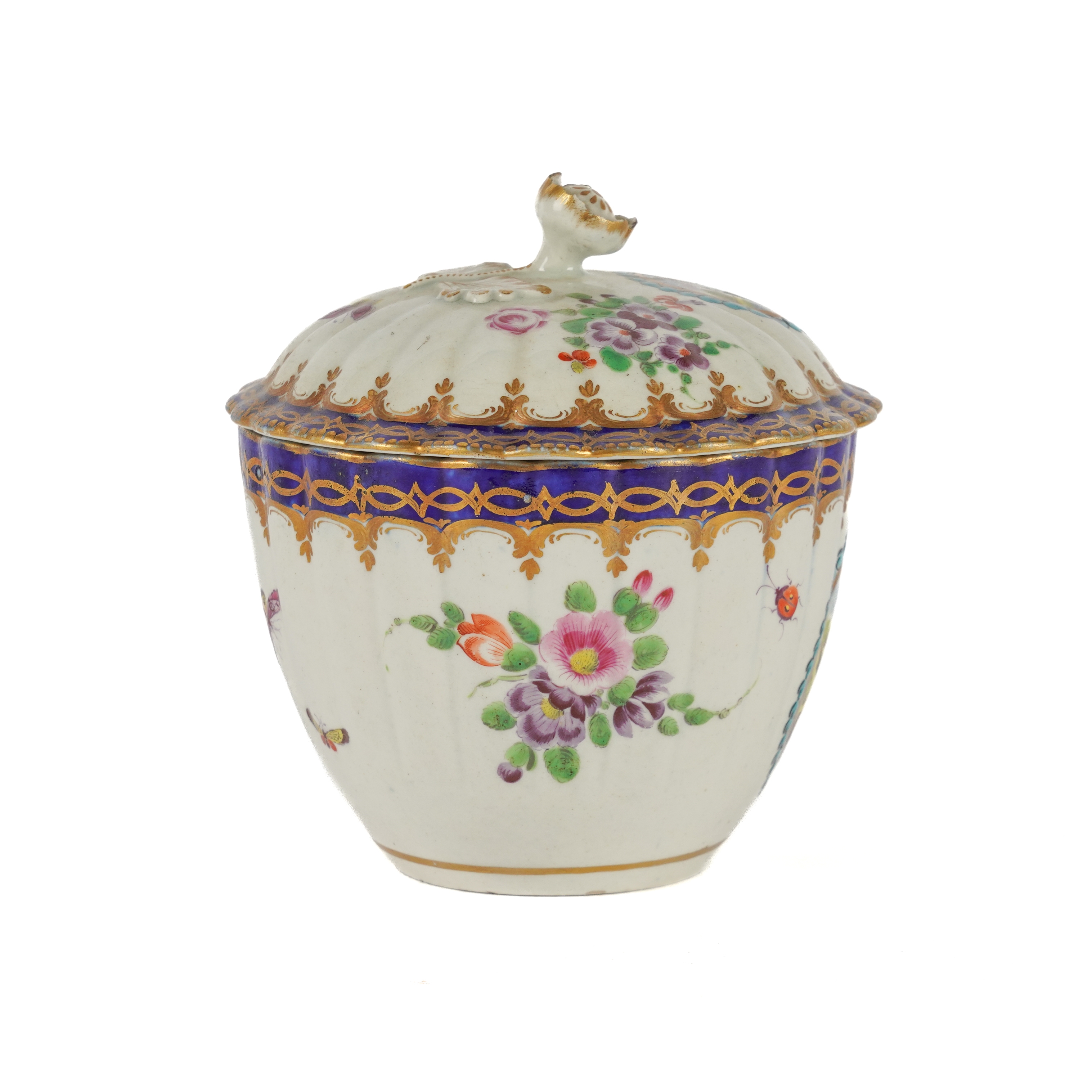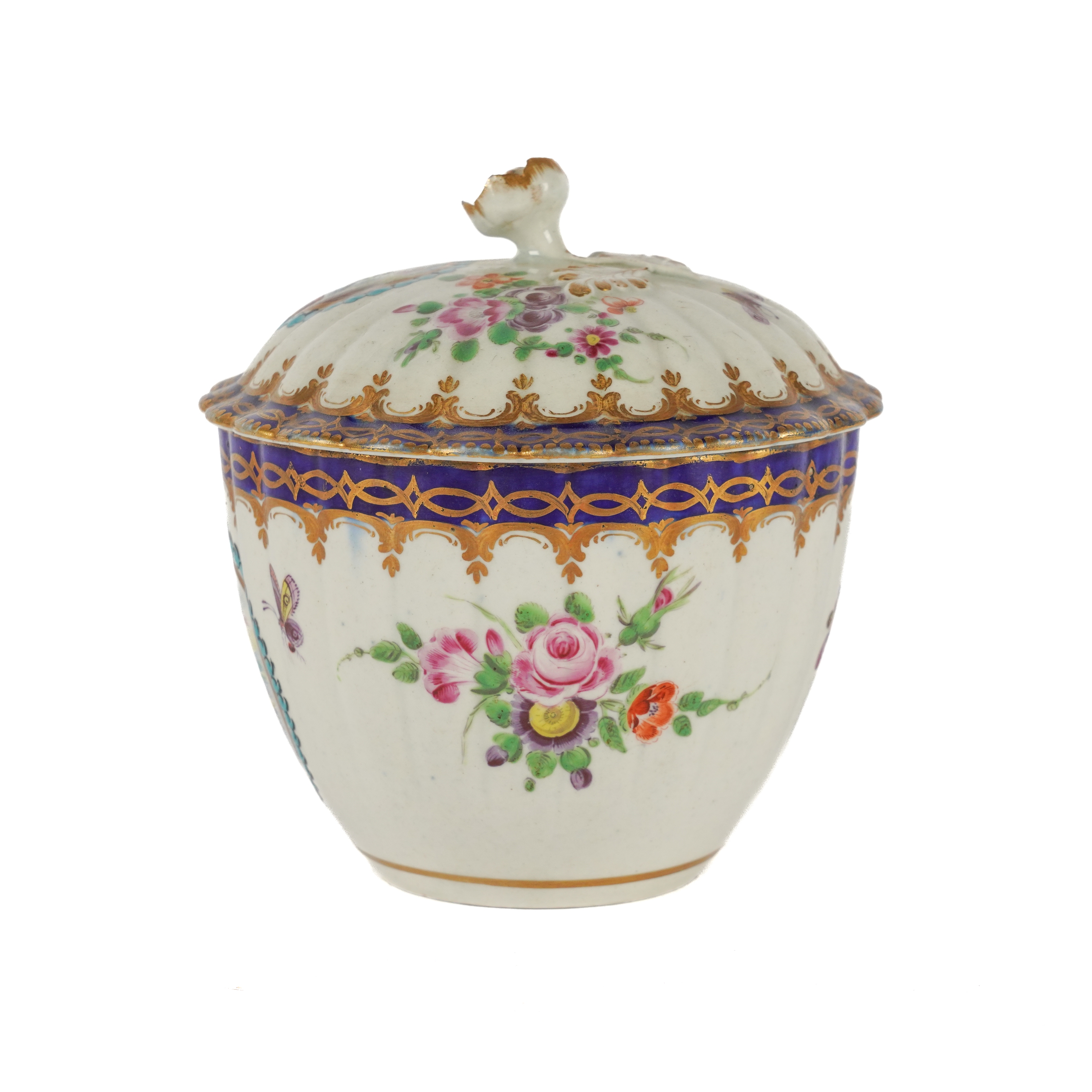 Sucrier- two nicks around the footrim. Some wear to the gilding. Some glaze specking to the interior.