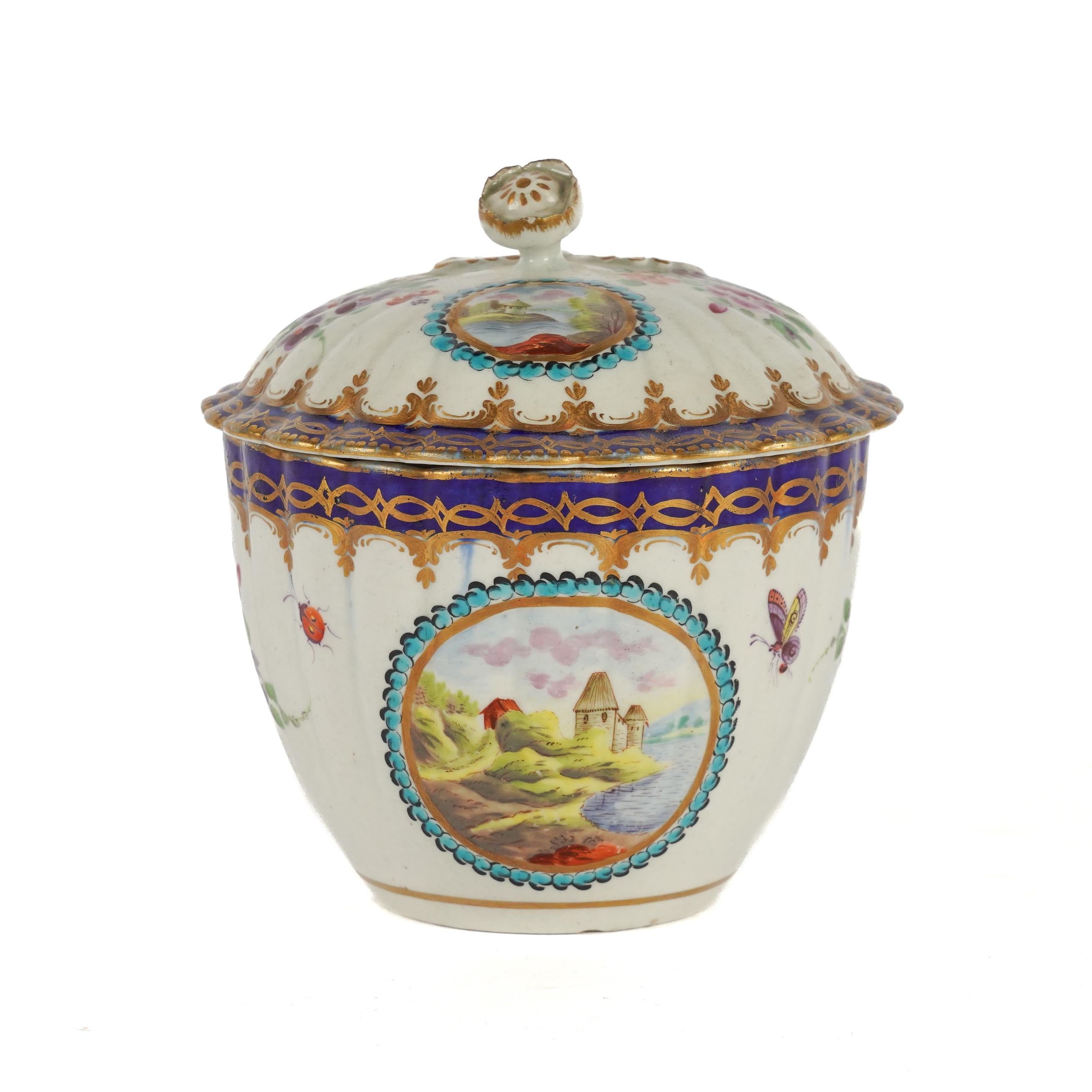Of ` Earl of Dalhousie' type, painted with circular landscape panels, insects and flowers, inside blue and gilt borders, the cover with flower knop, blue open crescent mark, 13cm high