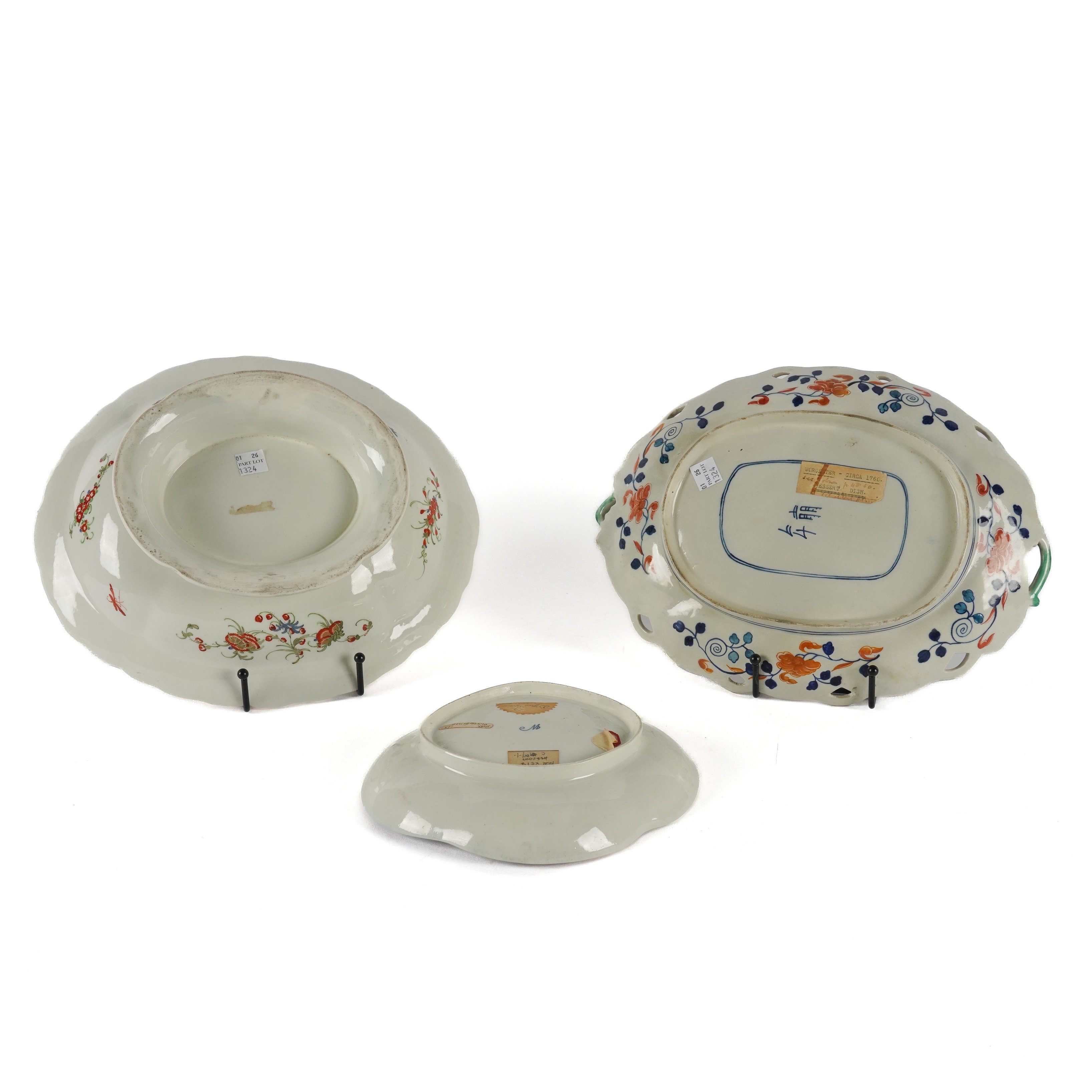 Painted in Sevres style with a central group of flowers, beneath a blue and gilt `oeil de perdrix' border suspended with pink floral swags, blue script W mark, 19cm wide; also a Worcester `Scarlet Japan' pattern oval footed centrepiece, 29cm wide and a Worcester `Old Mosaic' pattern oval dish, 29.5cm wide