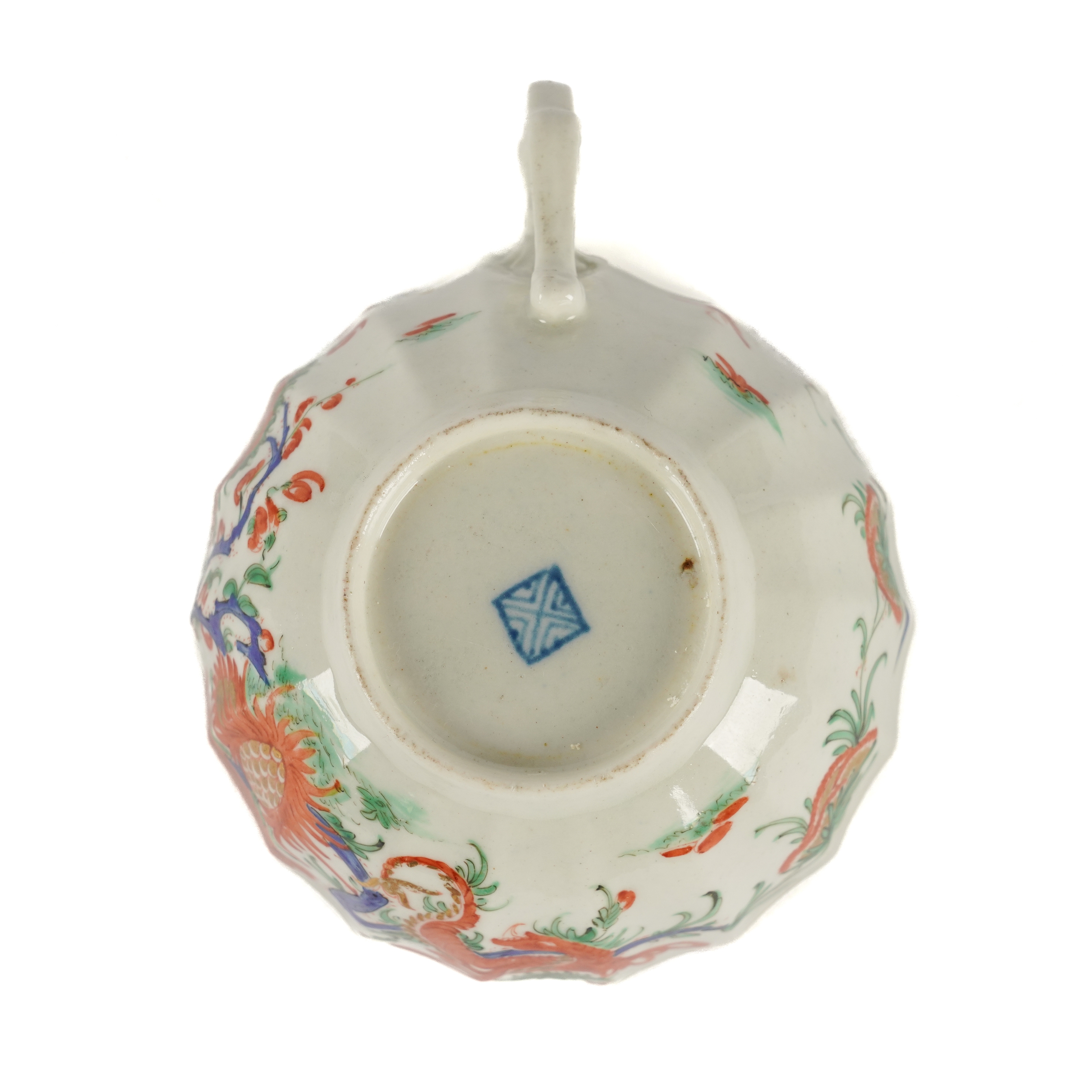 With `Warmstry' fluting, painted in Japanese kakiemon style with the `Jabberwocky' pattern inside a gilt-edged turquoise border, blue fretted square mark, saucer 13.5cm diameter