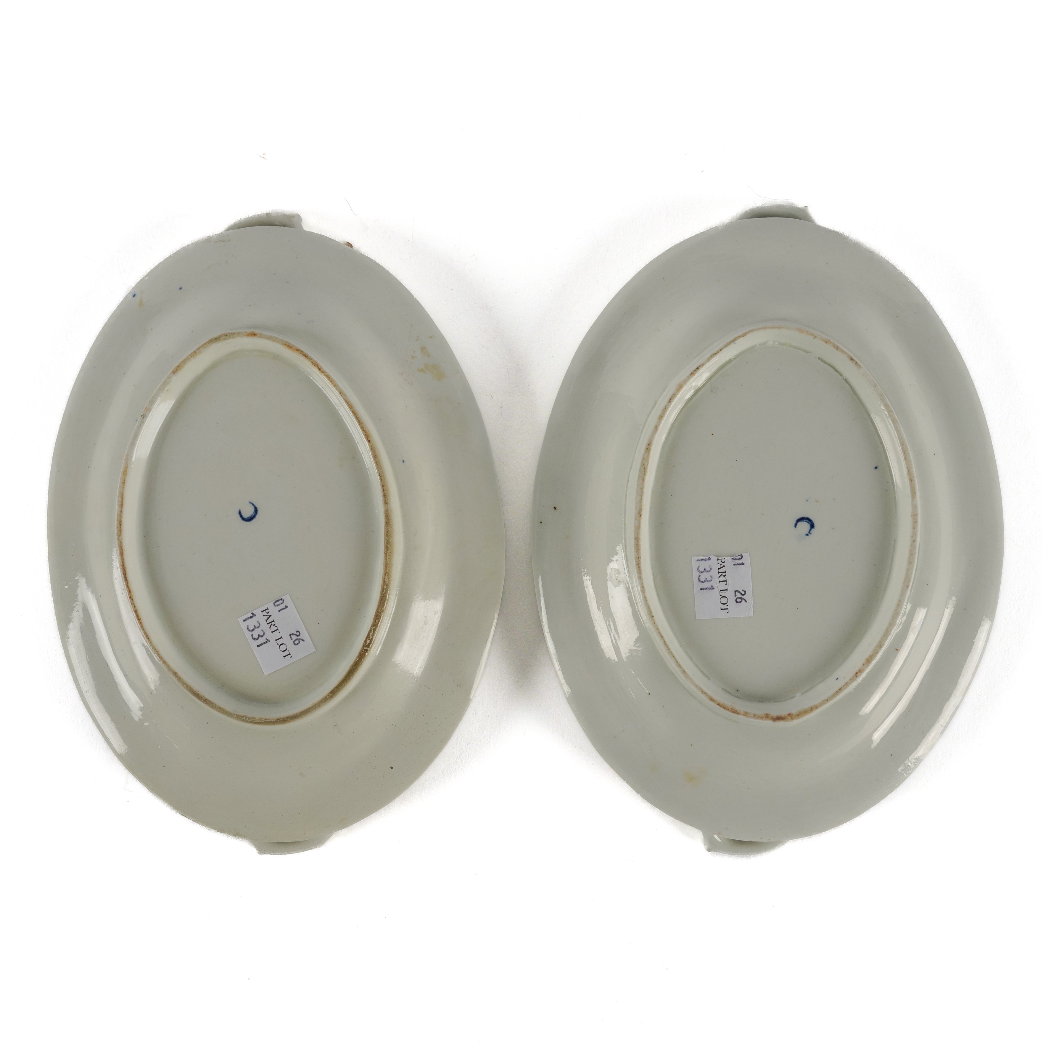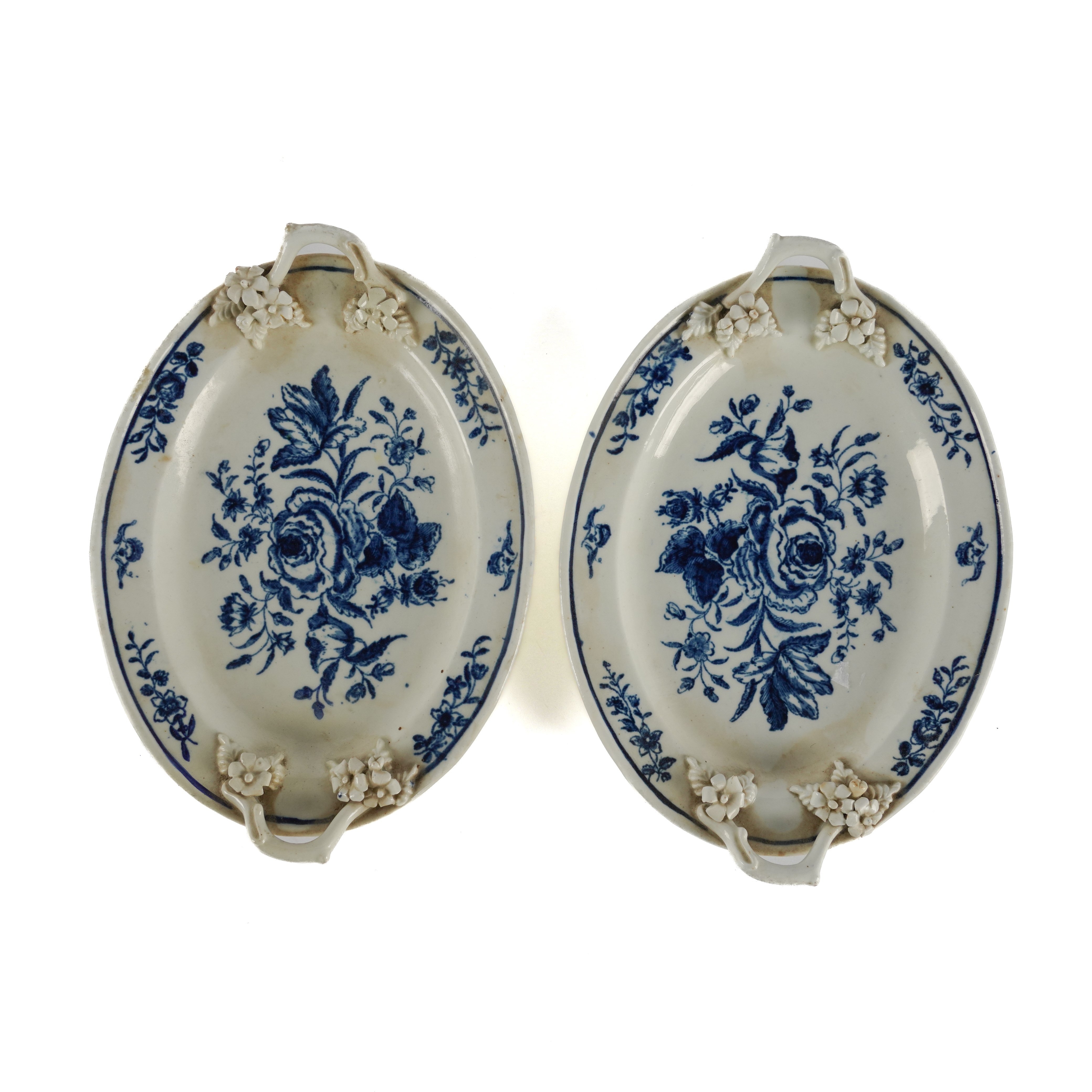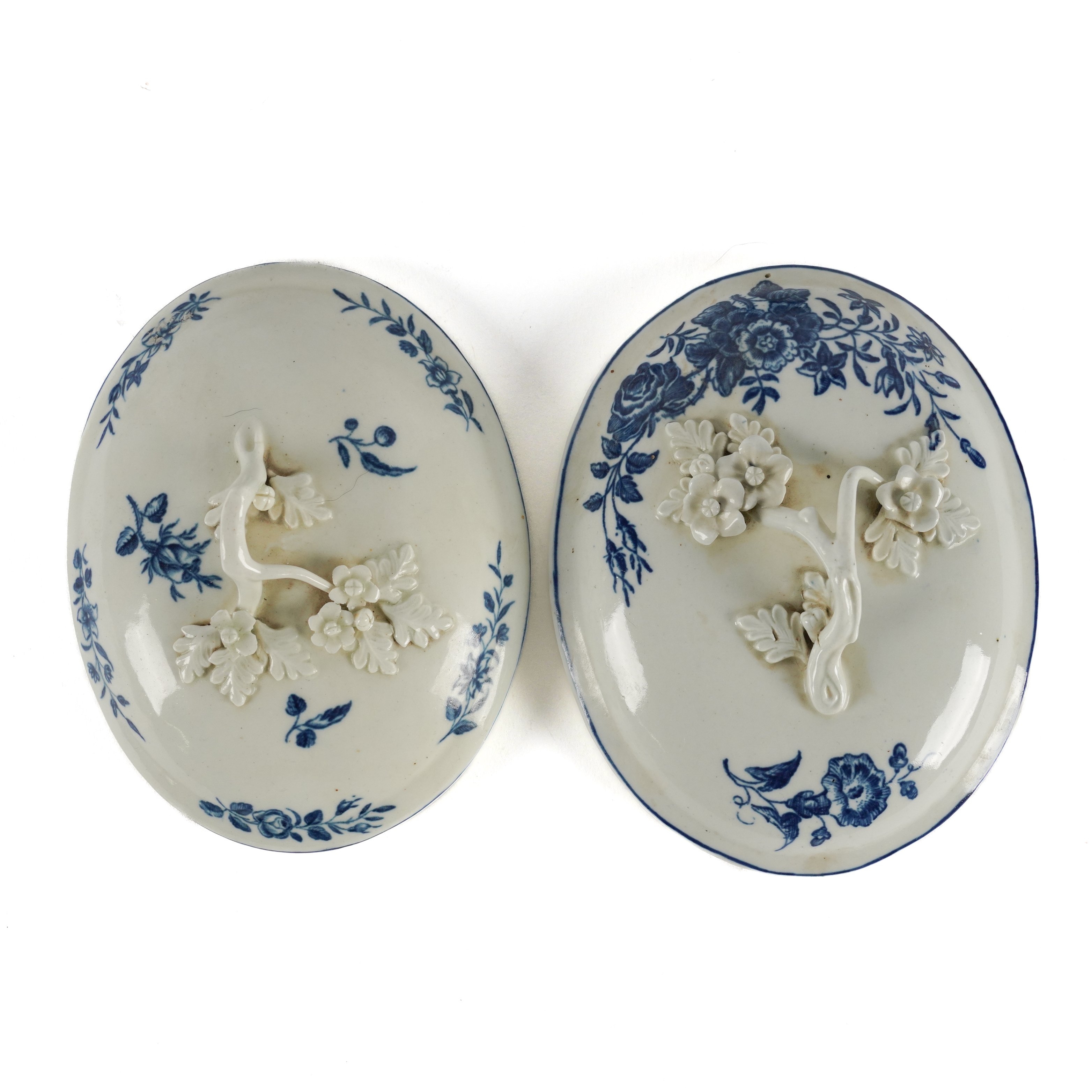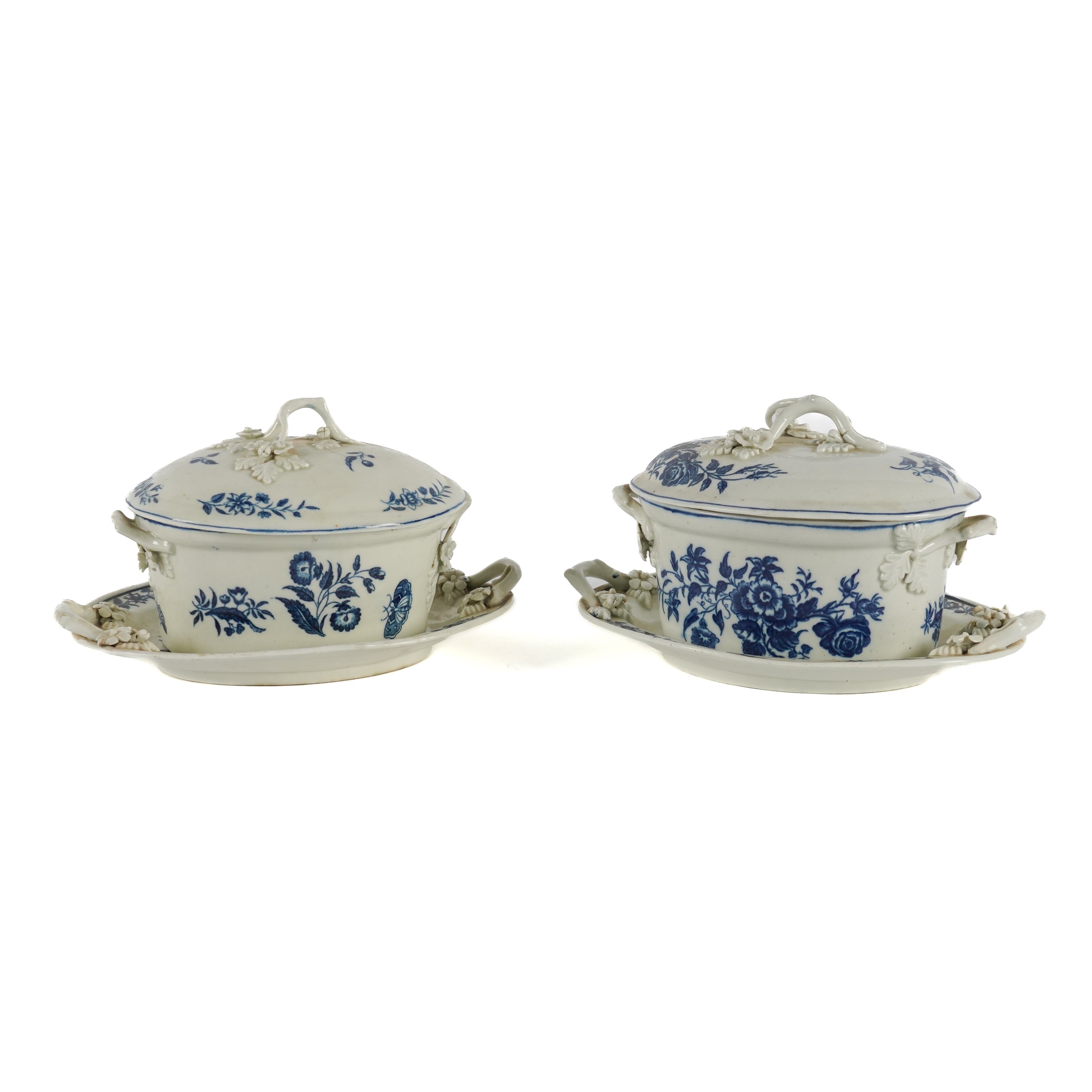 Printed with the `Three Flowers' and `Rose Centred Spray Group', blue hatched crescent marks, stand 19.5cm wide; also a Caughley version of the butter tub with a Caughley or Worcester cover and a Worcester stand, stand 19.5cm wide