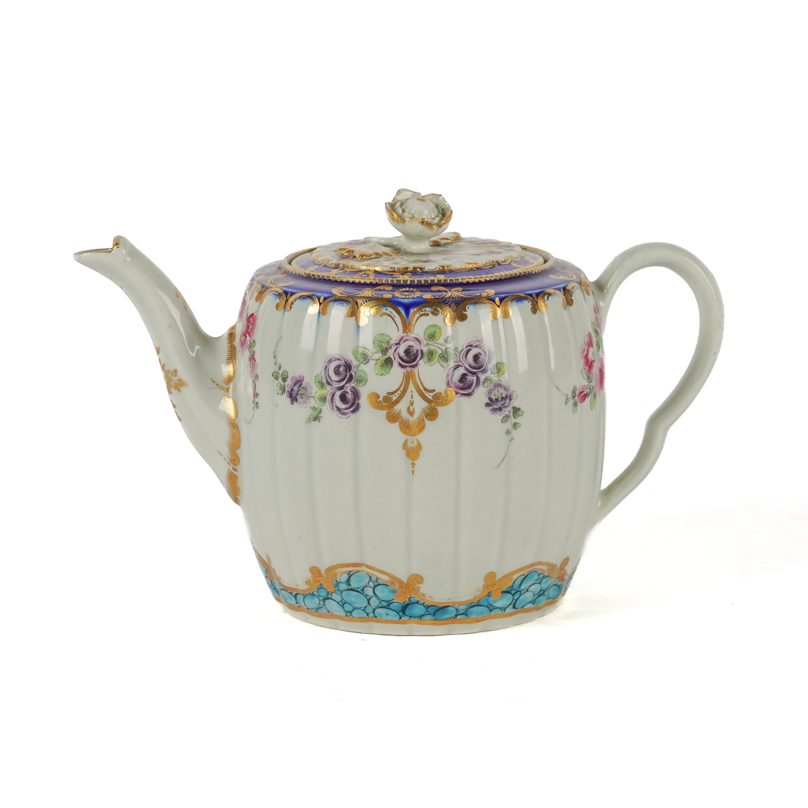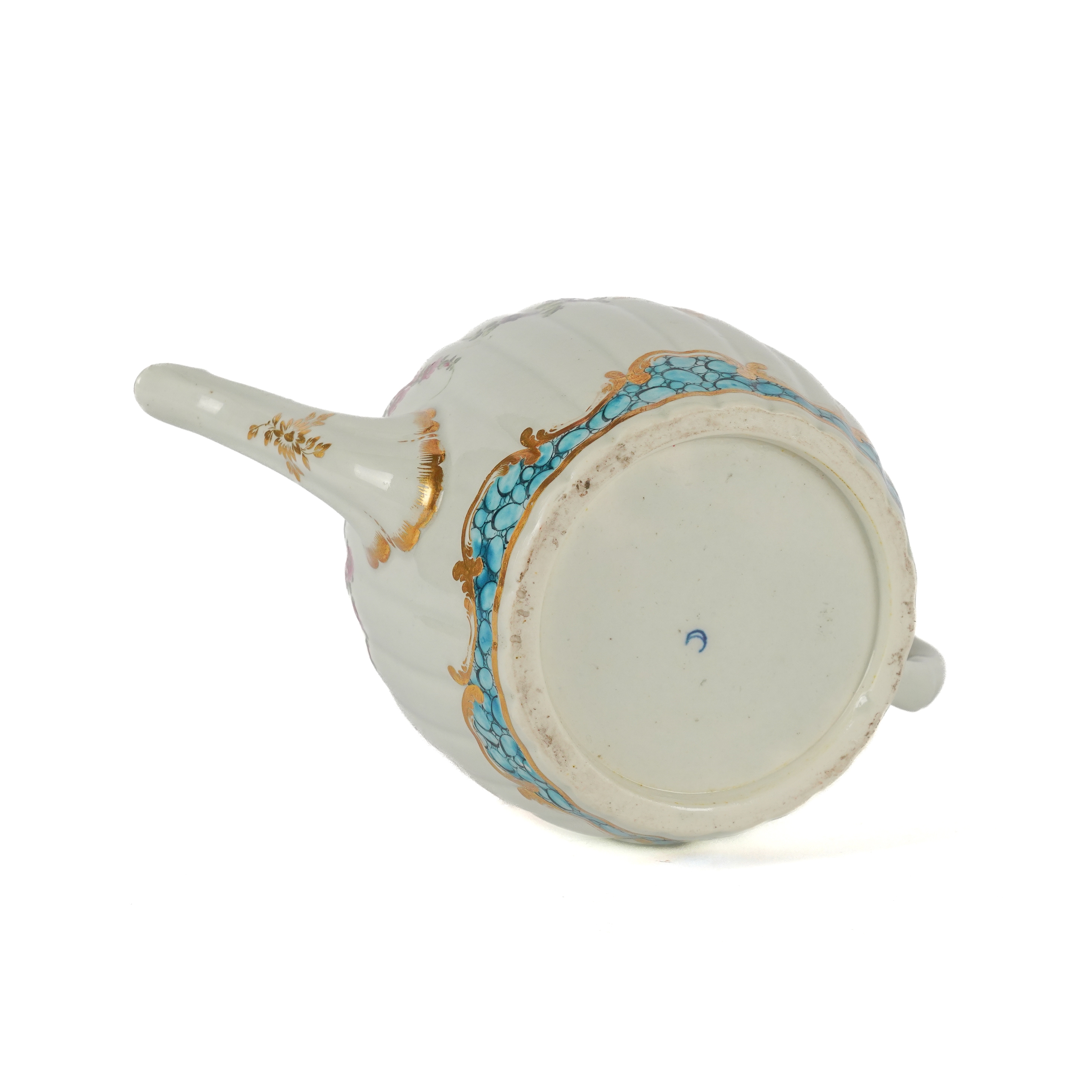 Of reeded barrel form, painted with flower garlands beneath a gilt-edged blue border, a lower turquoise shagreen border around the foot, blue open crescent mark, 13cm high