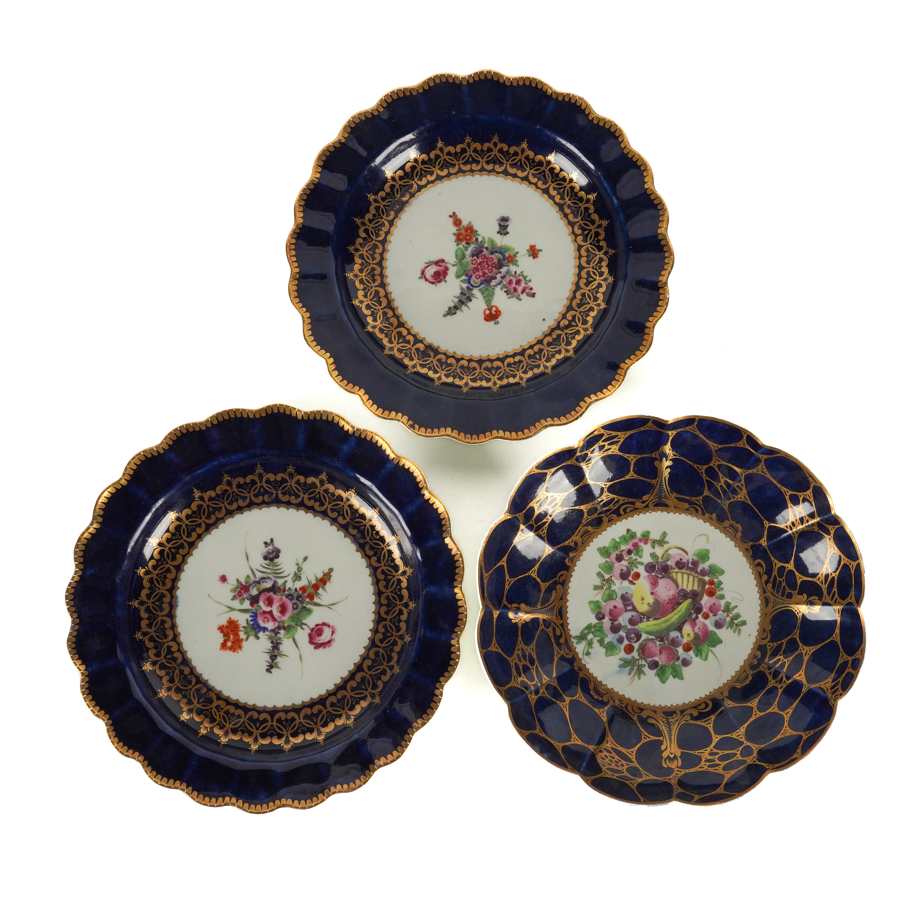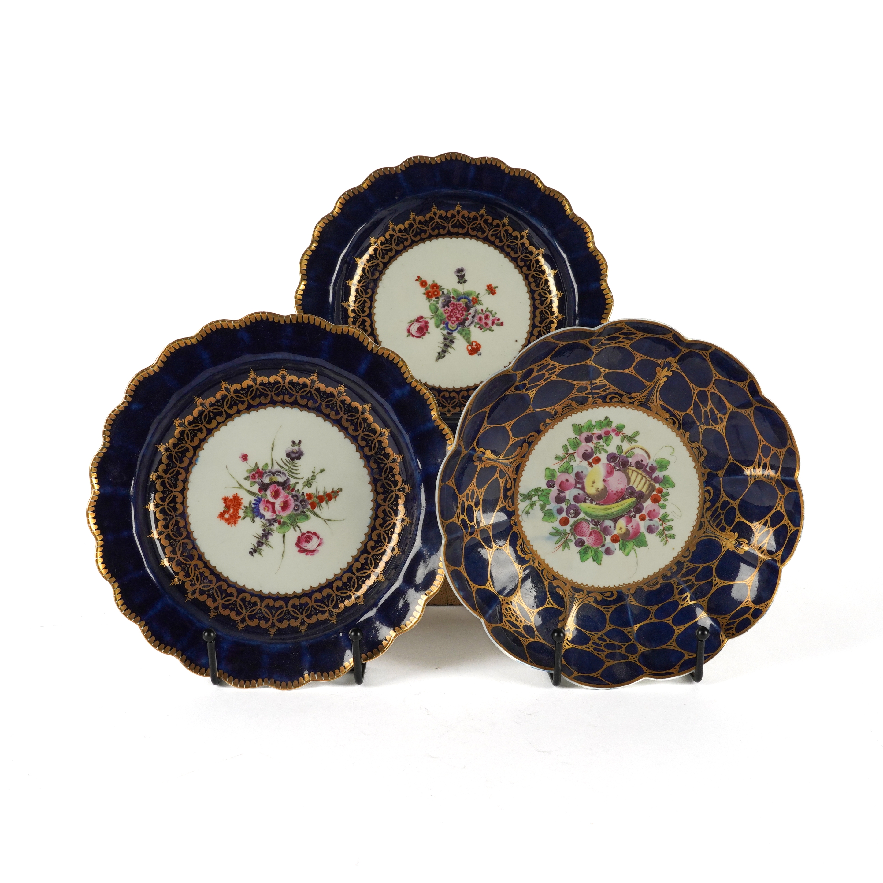 Painted in the centre with `spotted fruit' and a basket inside a `wet blue' and gilt cailloute border, 18.5cm diameter; also a pair of Worcester dessert plates, circa 1770, painted with flowers against a `wet blue' ground, blue open crescent marks, 19cm diameter