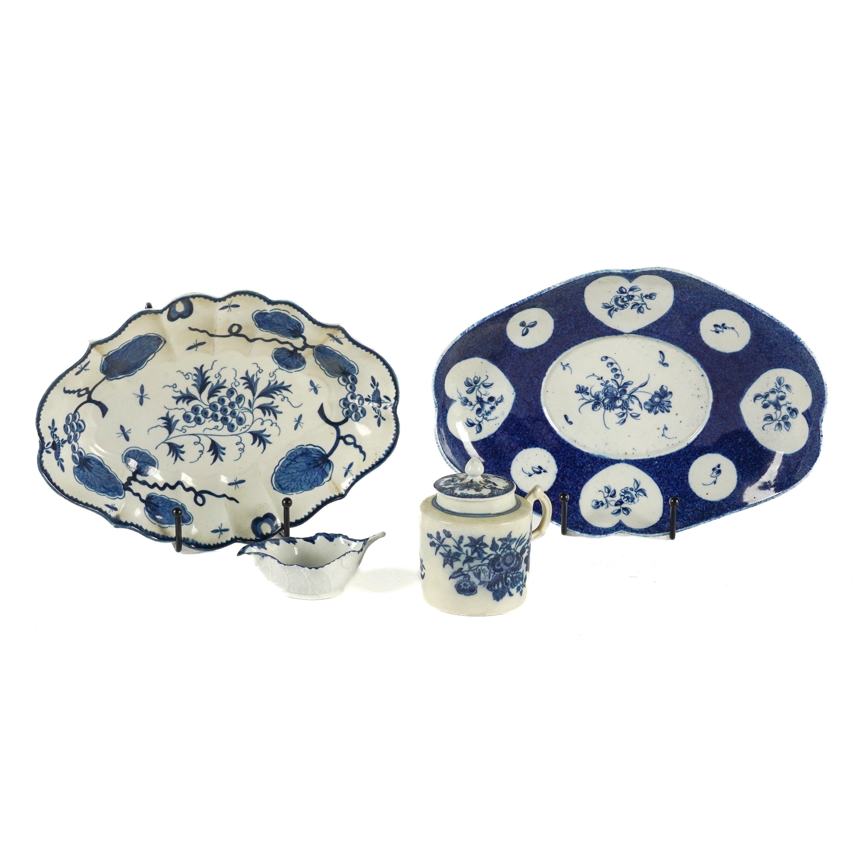 Comprising; a Worcester `Rubber Tree Plant' pattern lozenge shaped dessert dish, pseudo Chinese marks, 24cm wide; a Caughley `Three Flowers' pattern wet mustard pot and a cover, blue C mark, 9.5cm high; a Caughley powder blue ground shaped oval tureen stand reserved with flower panels, C mark, 25.5cm wide and a leaf shaped butter boat, 9cm length