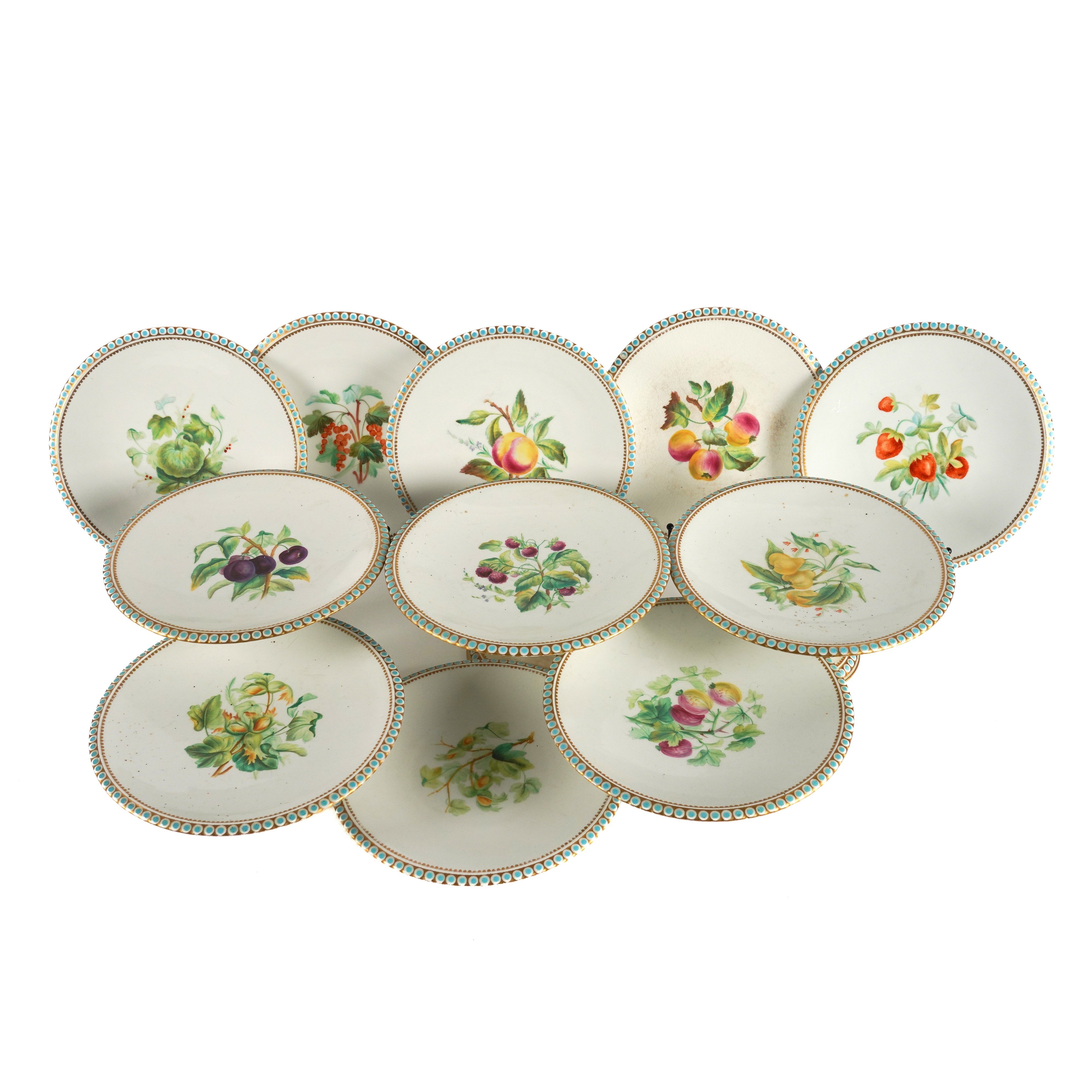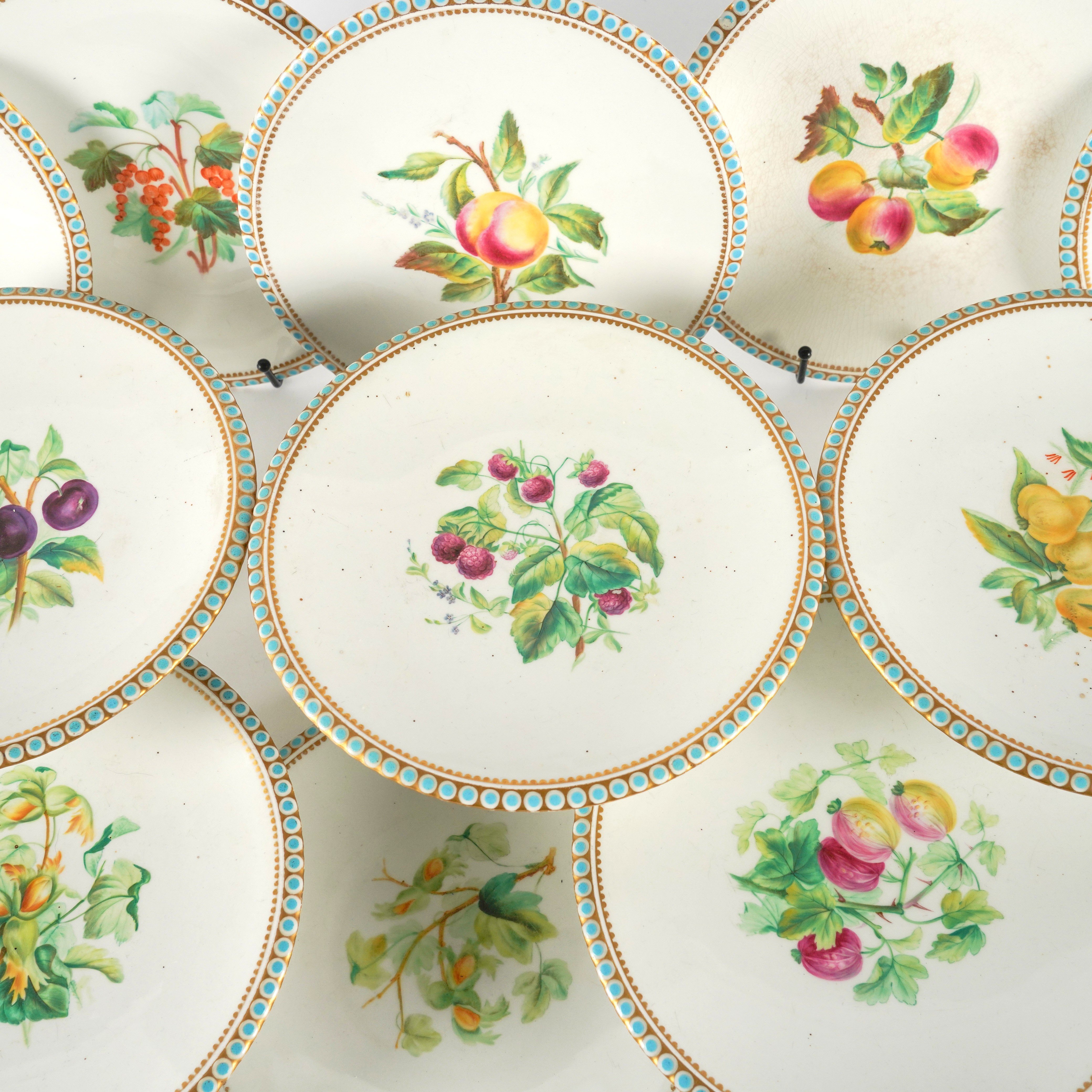 Each piece painted with branches of fruit inside a turquoise and gilt border, comprising; three high stands, 11cm high, two medium stands, 7.5cm high and six plates, 23cm diameter, printed and impressed marks