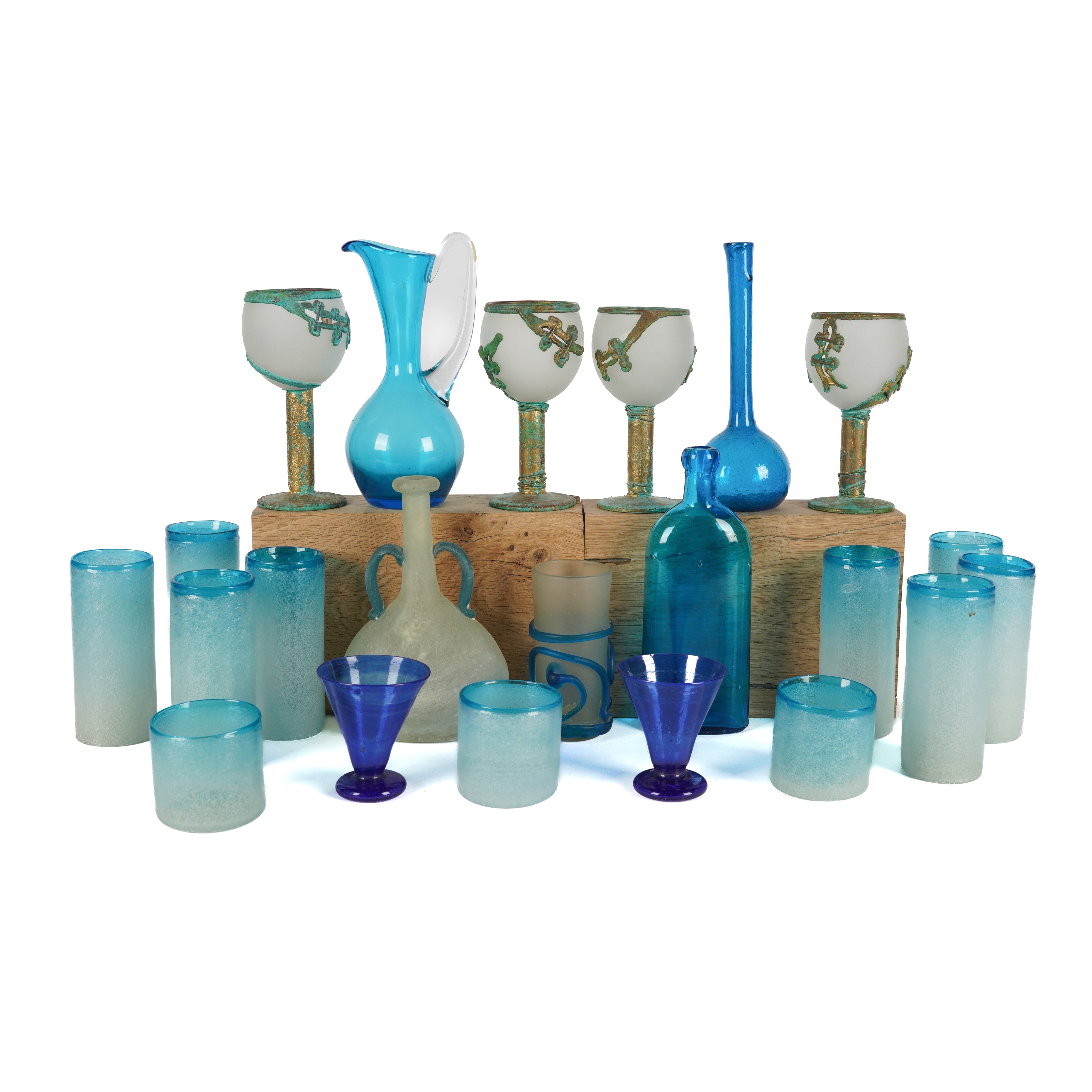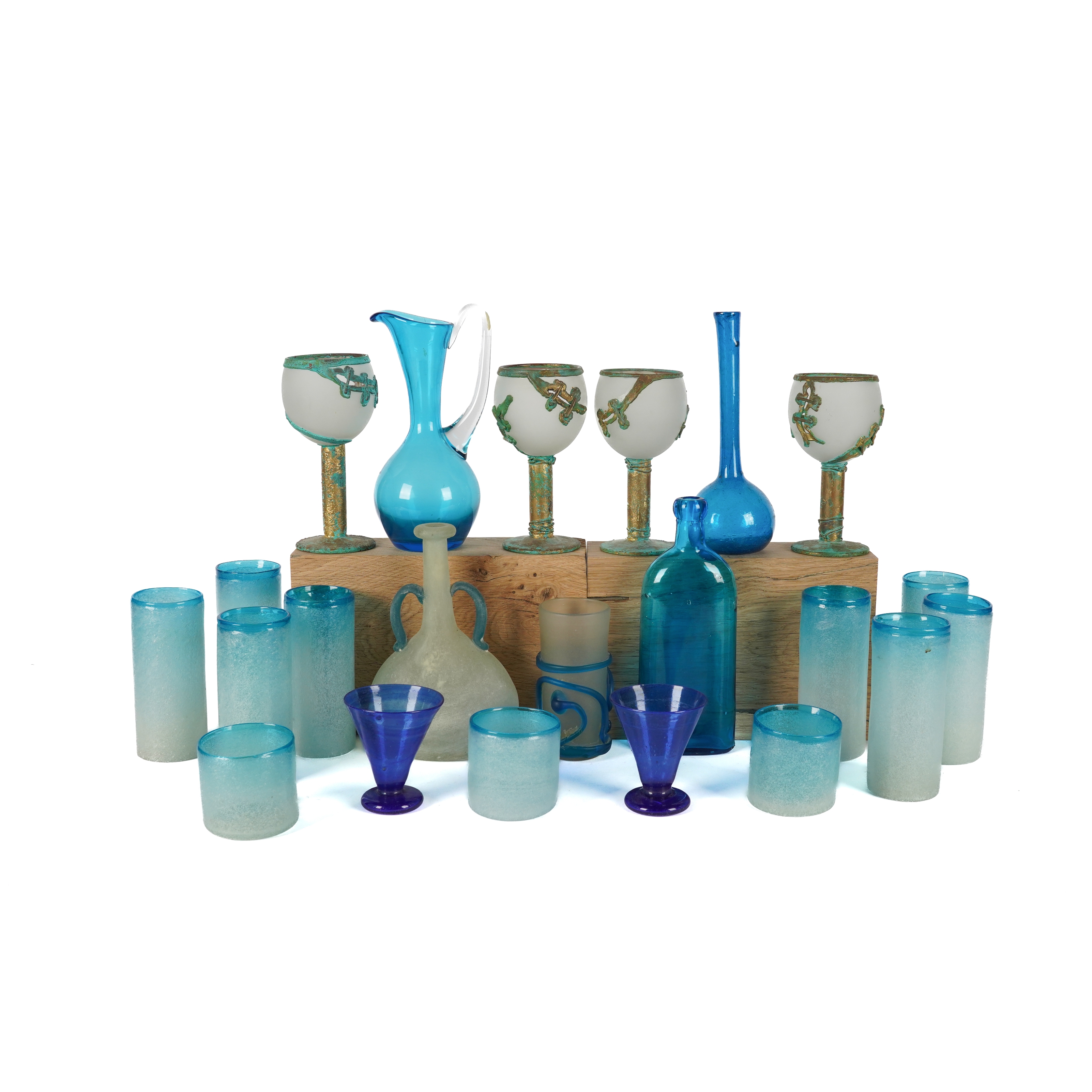 Together with a blue glass flask and bottle vase; two blue glasses flared beakers; a frosted glass beaker with applied blue trails; a two-handled frosted glass flask; four unusual pierced frosted, green and gilt goblets and a blue glass jug, possibly Whitefriars
