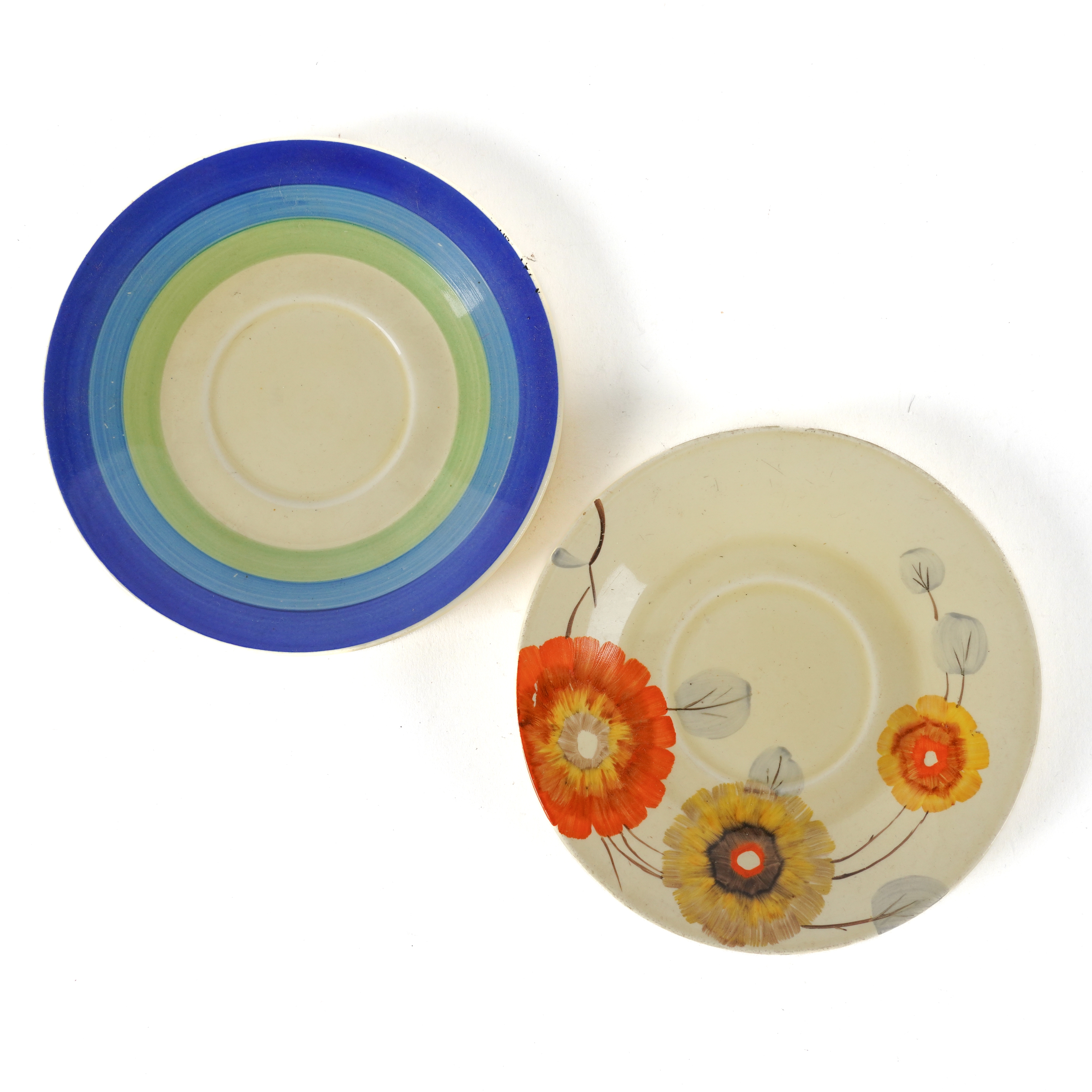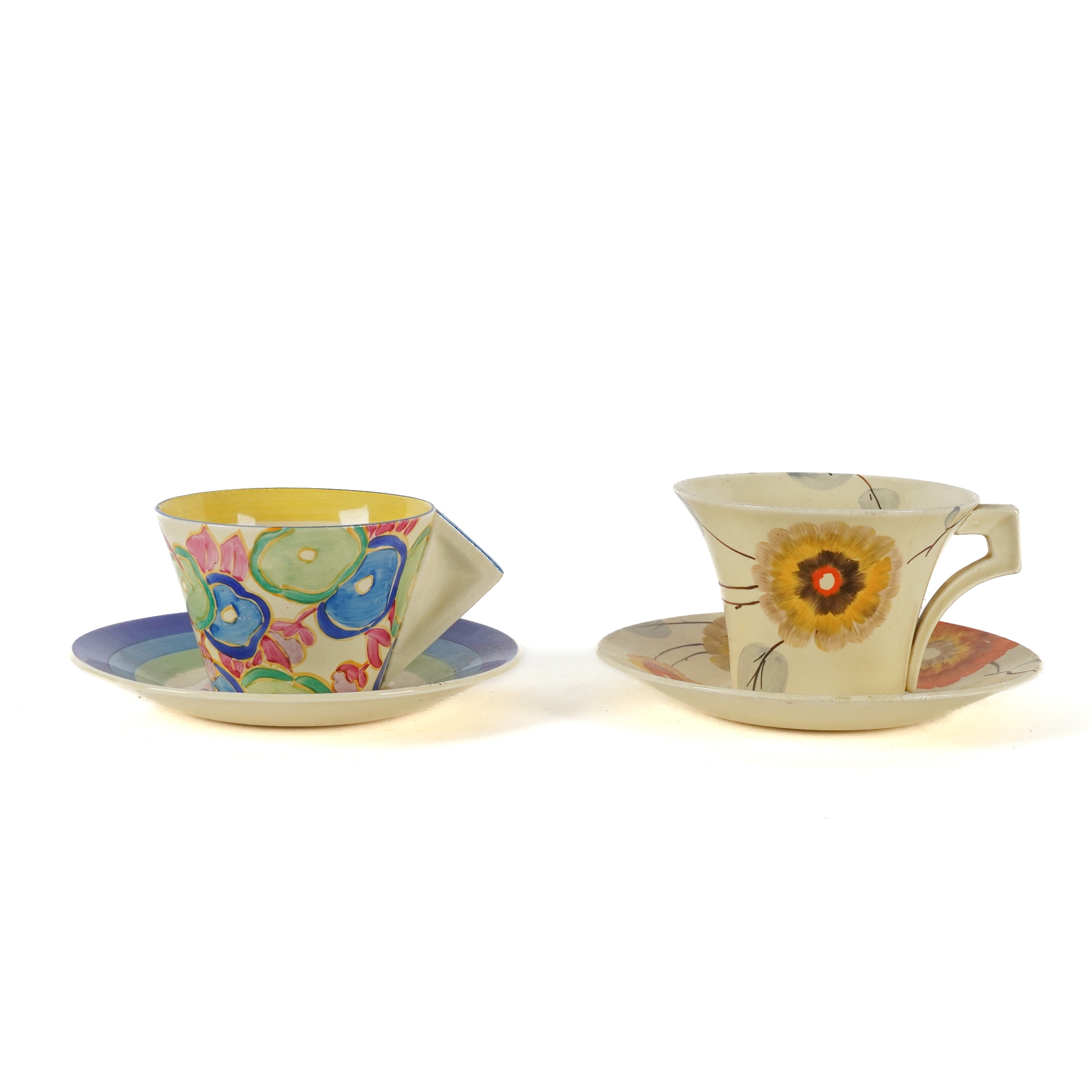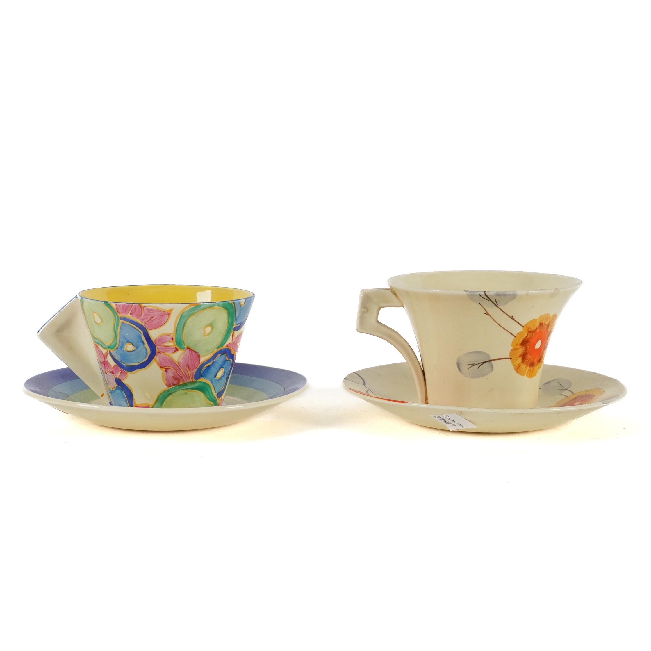 Black printed marks; together with a Clarice Cliff Bizarre `Rhodanthe' pattern daffodil shape tea cup and saucer, black printed marks