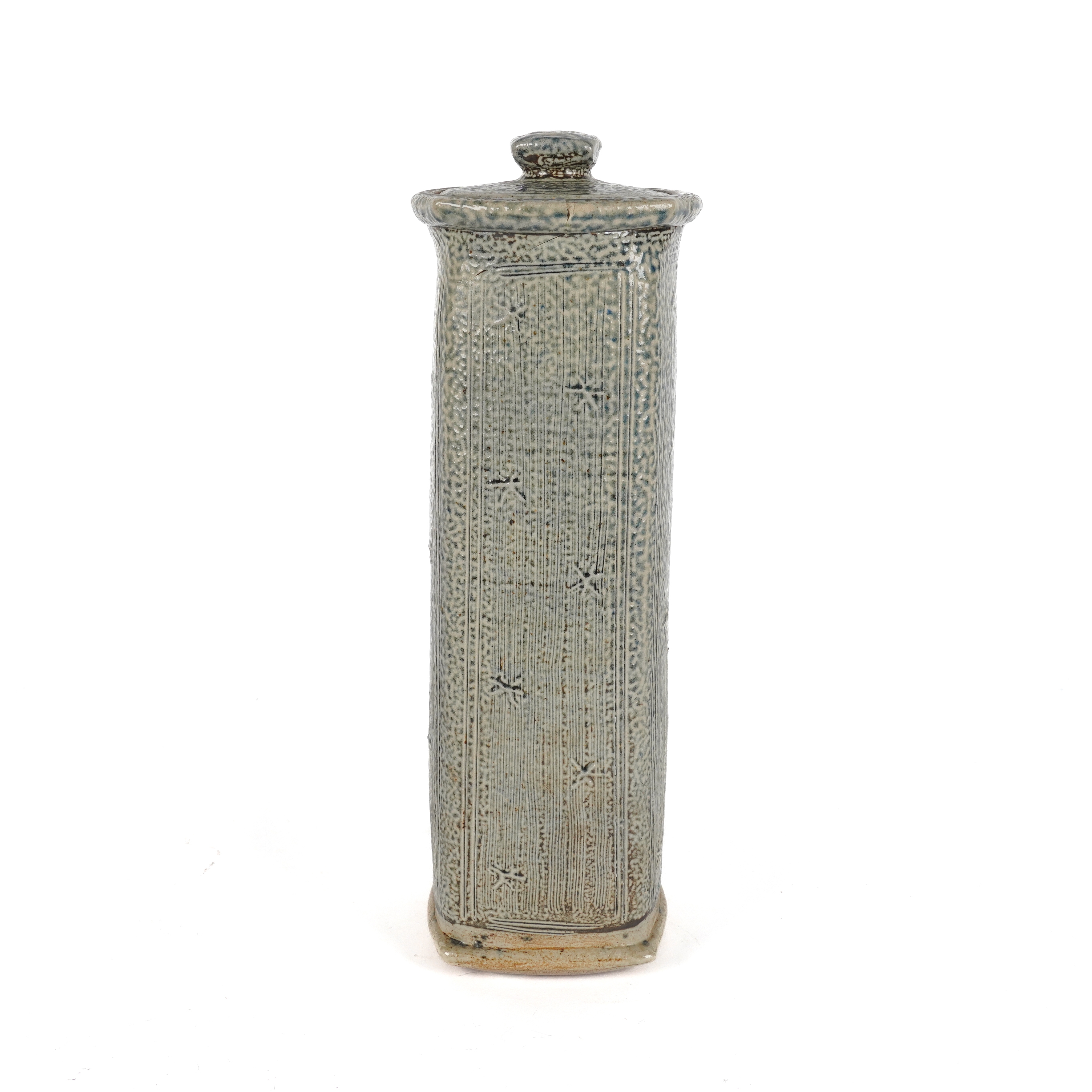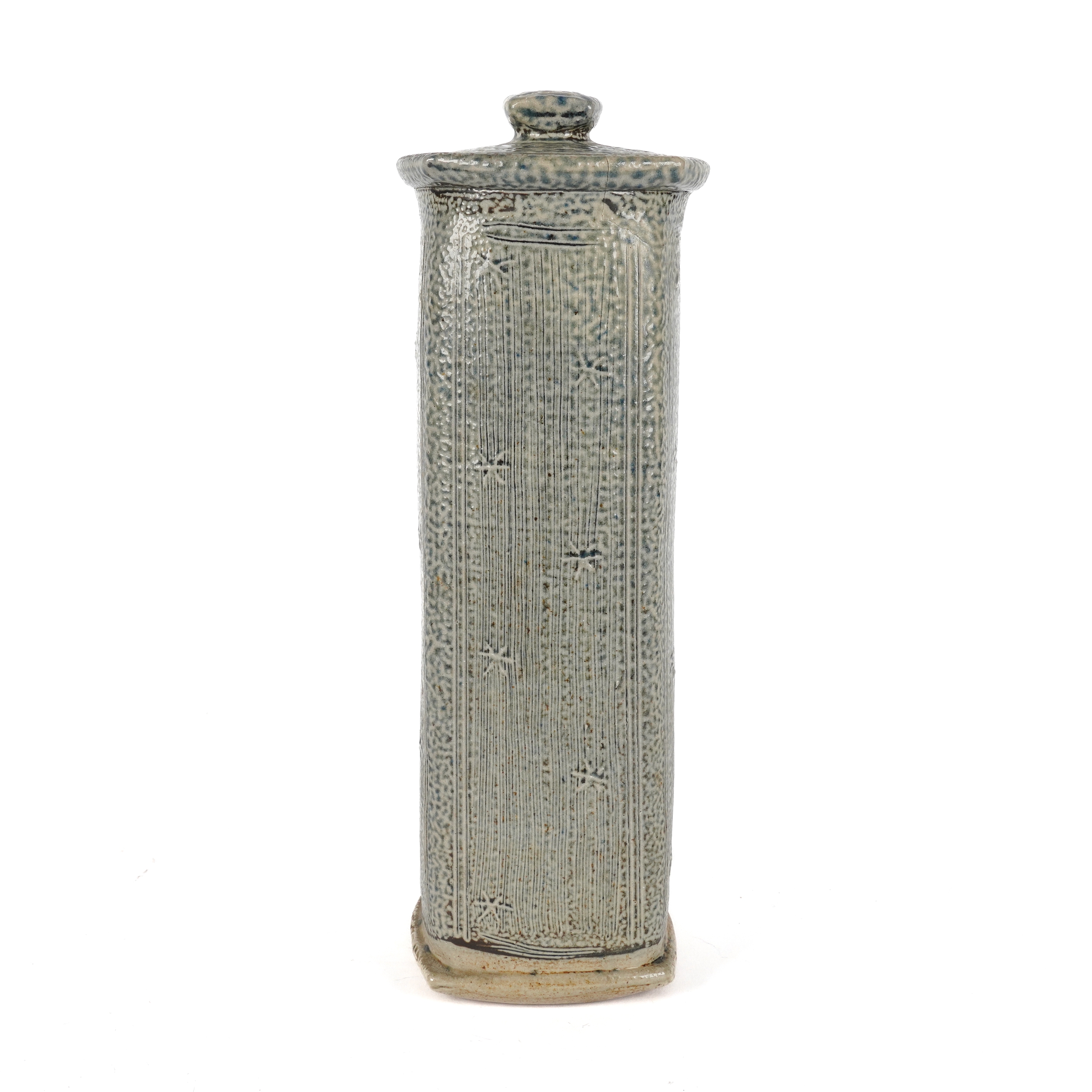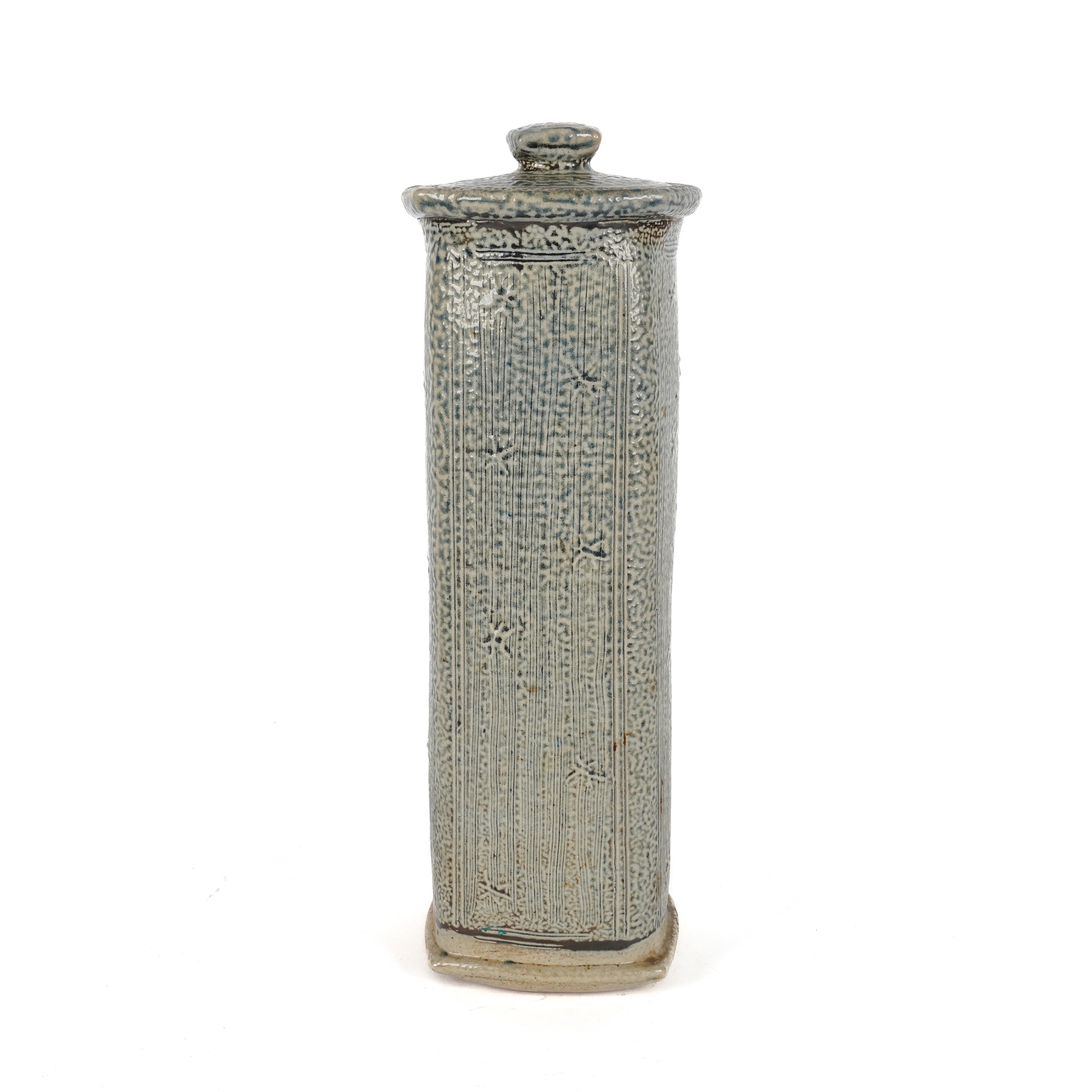 Of squared cylindrical form, glazed in blue and decorated with abstract star motifs, potter's marks to foot, 35cm high