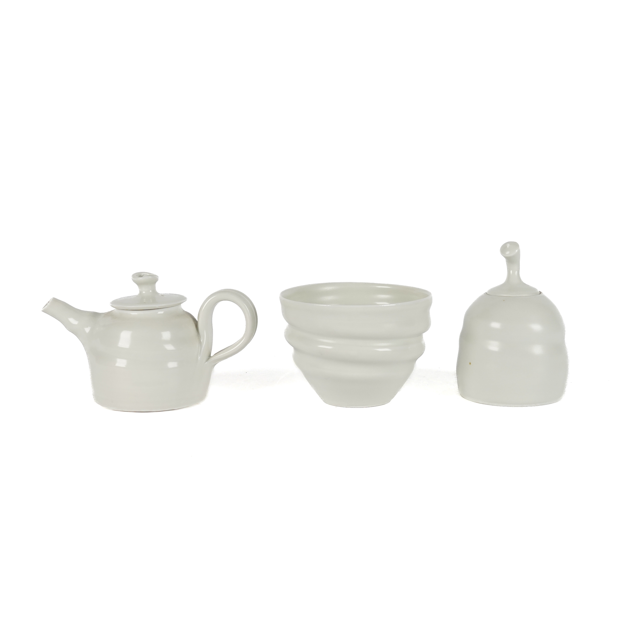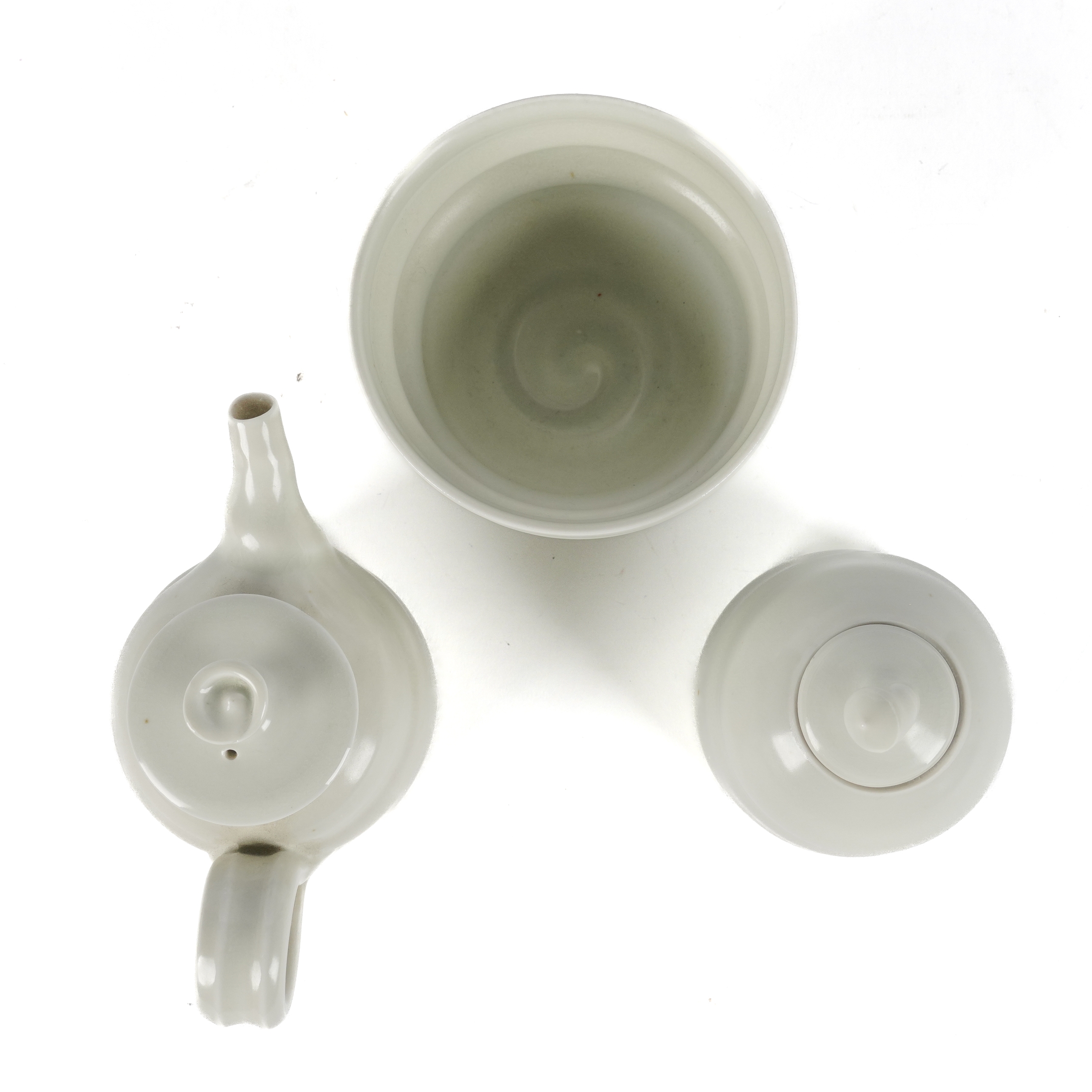 AN ANNE KARI RAMBERG THREE PIECE CELADON GLAZED PORCELAIN MINIATURE TEA SET (5)