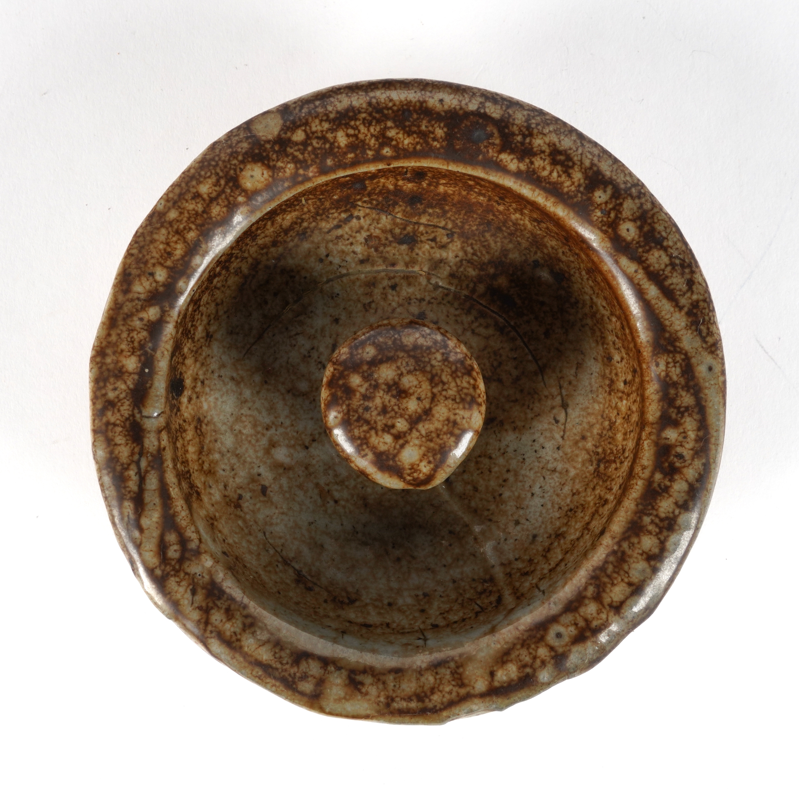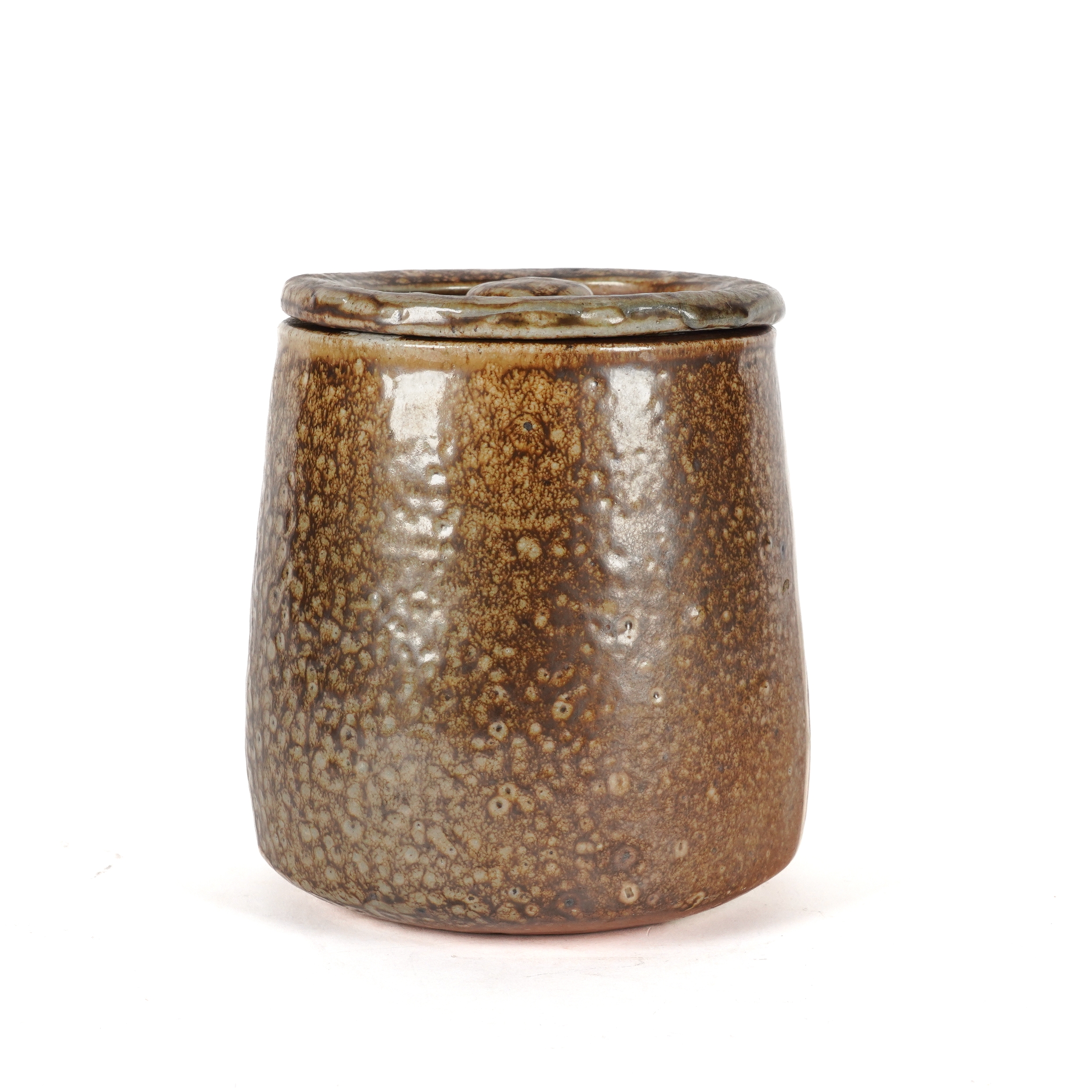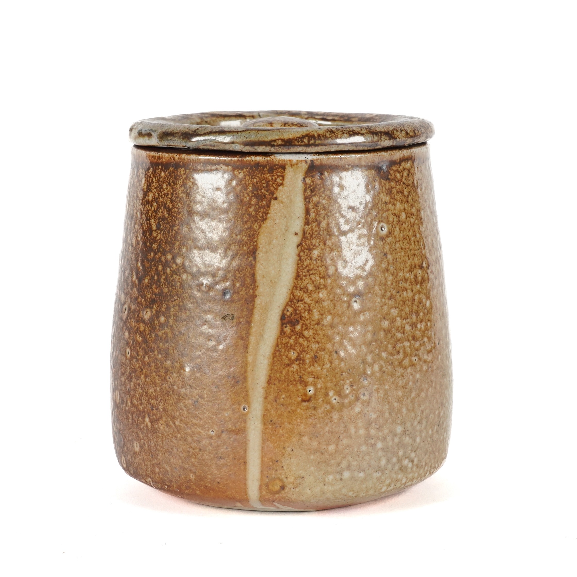 Of tapered cylindrical form, glazed in mid-brown with orange peel texture, the interior with pinkish/orange shino glaze, the covered with recessed knop, impressed potter's mark to foot, 17.5cm high