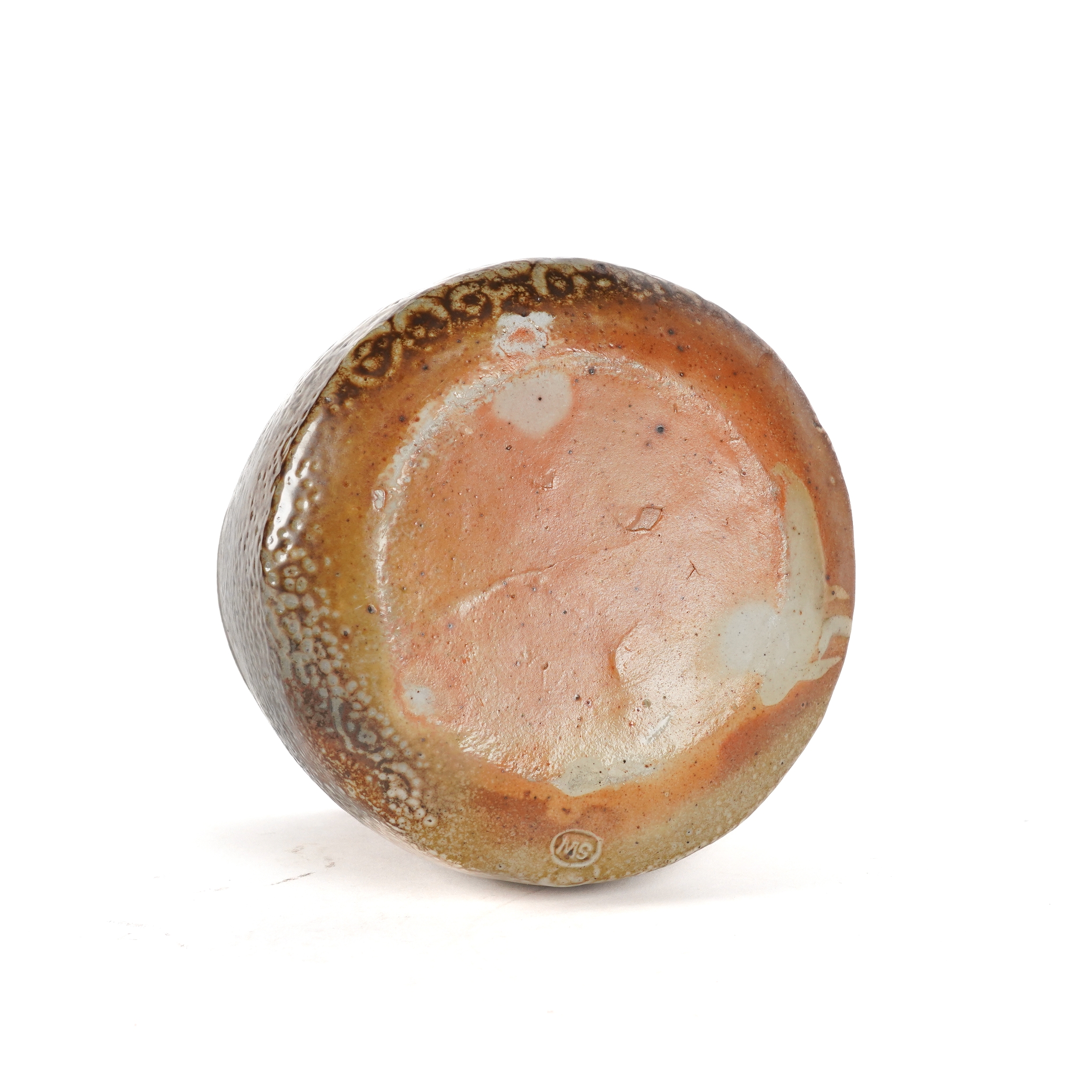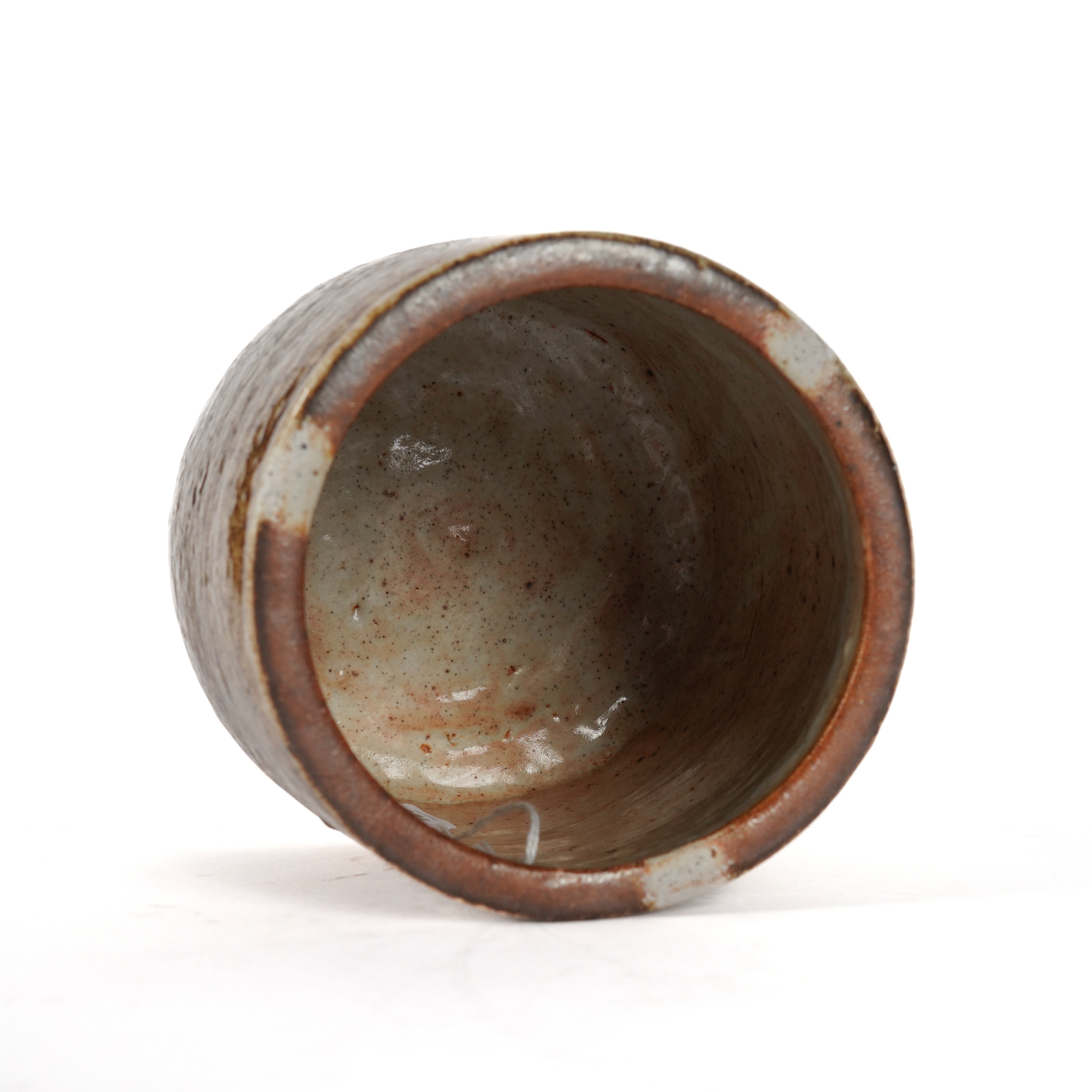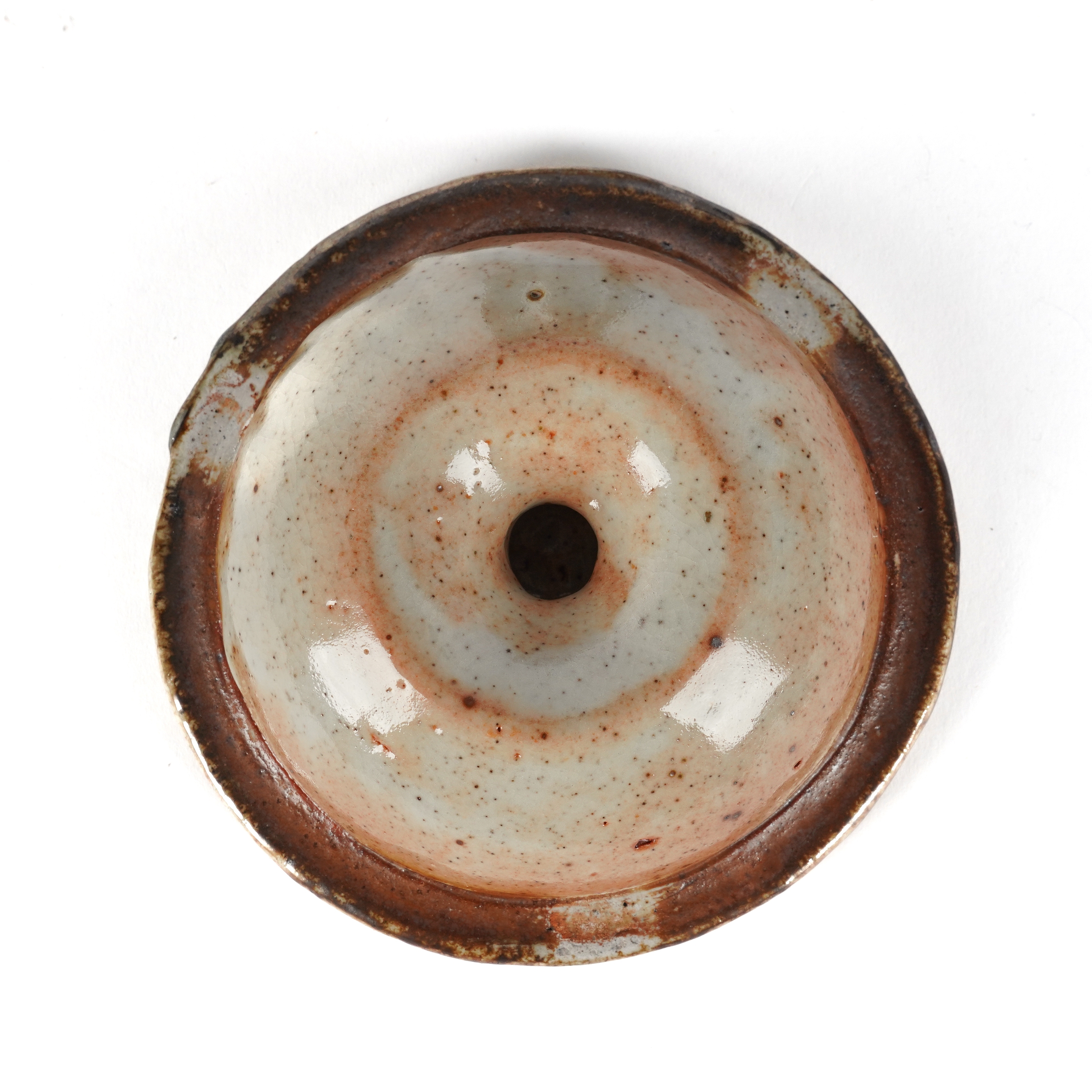 Of tapered cylindrical form, glazed in mid-brown with orange peel texture, the interior with pinkish/orange shino glaze, the covered with recessed knop, impressed potter's mark to foot, 17.5cm high