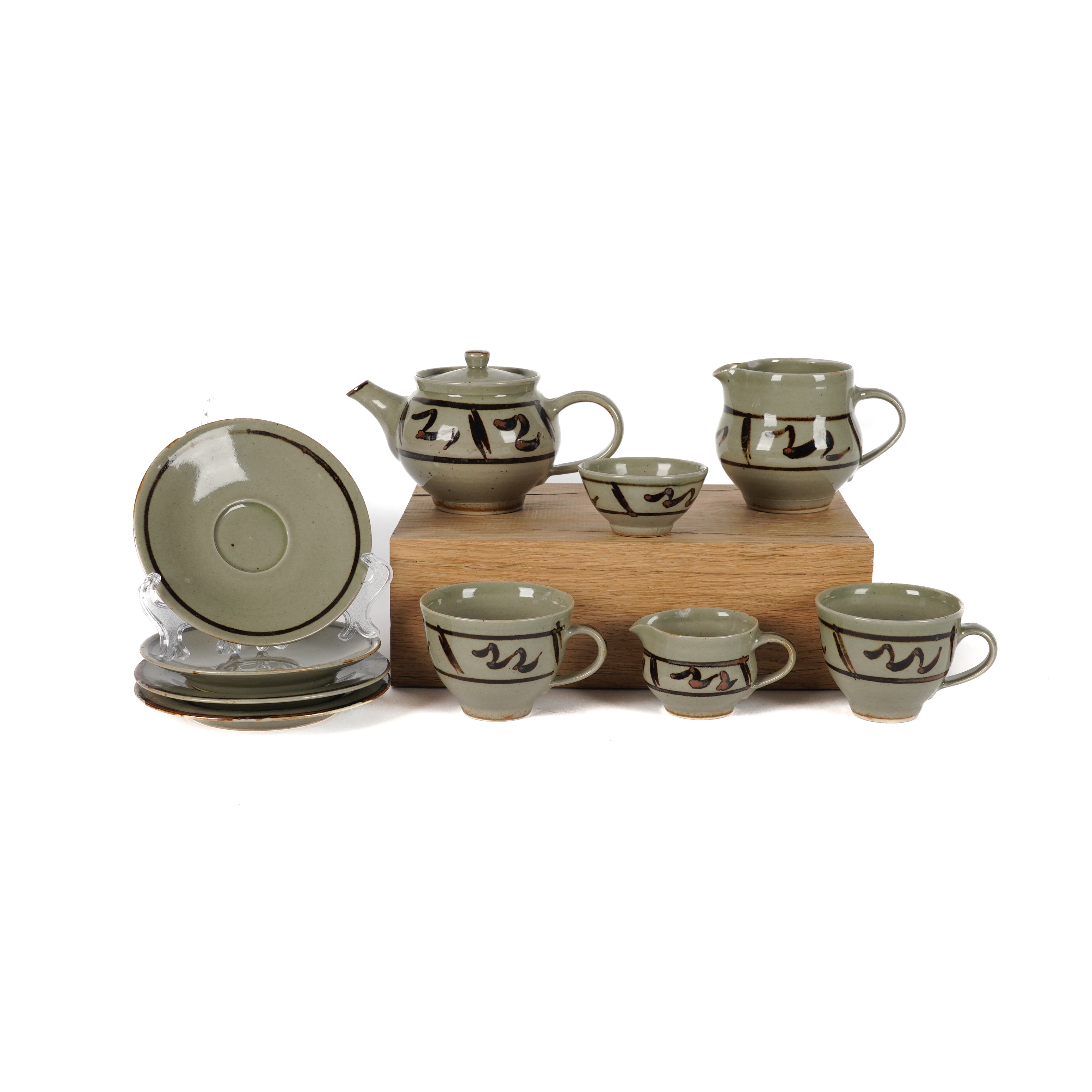 Stoneware, comprising a teapot, 11cm high, 18.5cm wide, a milk jug, two cups, two saucers, two tea plates, a cream jug, and a sugar bowl, all decorated with abstract iron slip or tenmoku designs against a grey/green celadon in the tradition of Bernard Leach