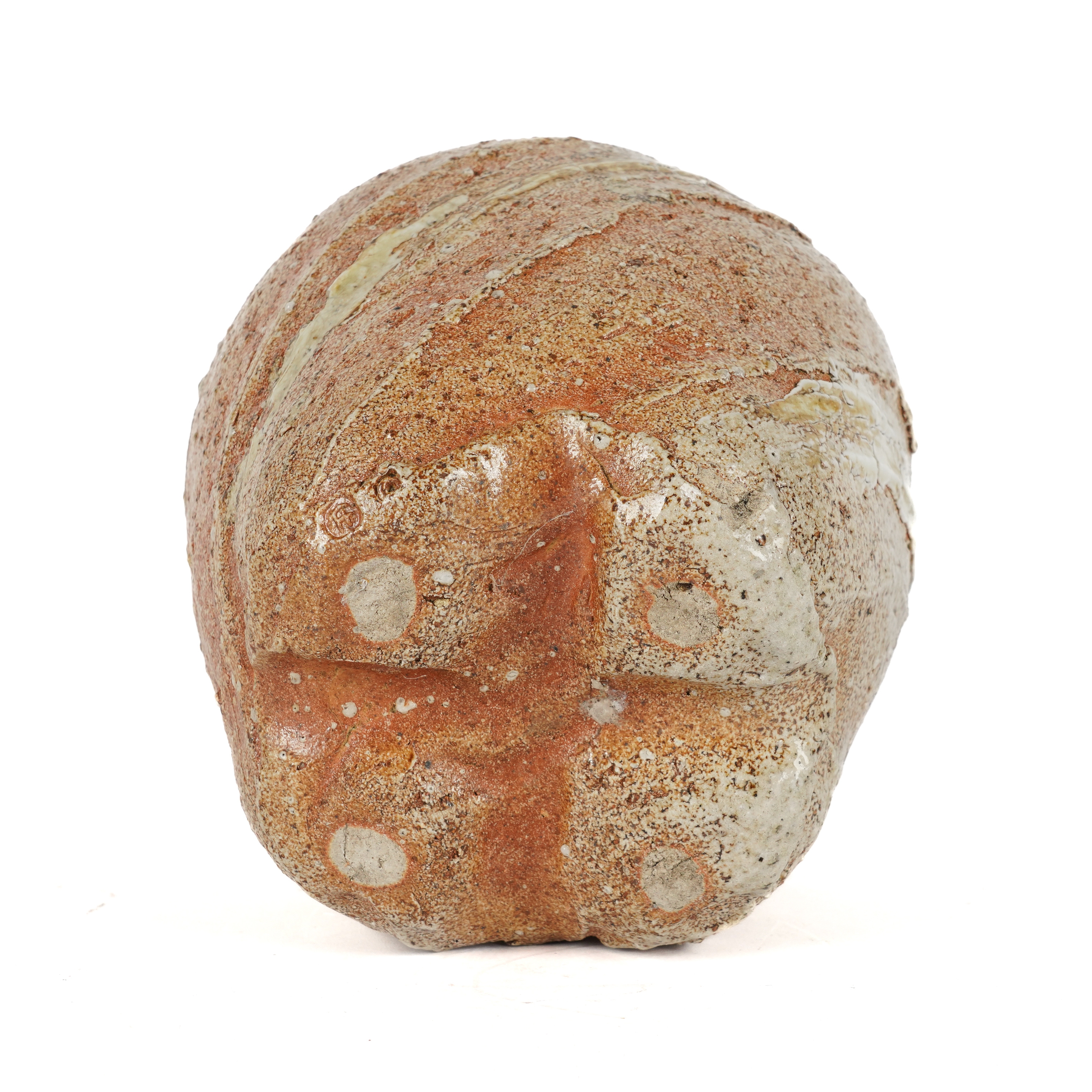 Of ovoid form, hand-thrown in course, grogged clay, decorated with cream/white glaze in a twist pattern, raised on four feet, impressed potter's marks to foot, 28cm high
