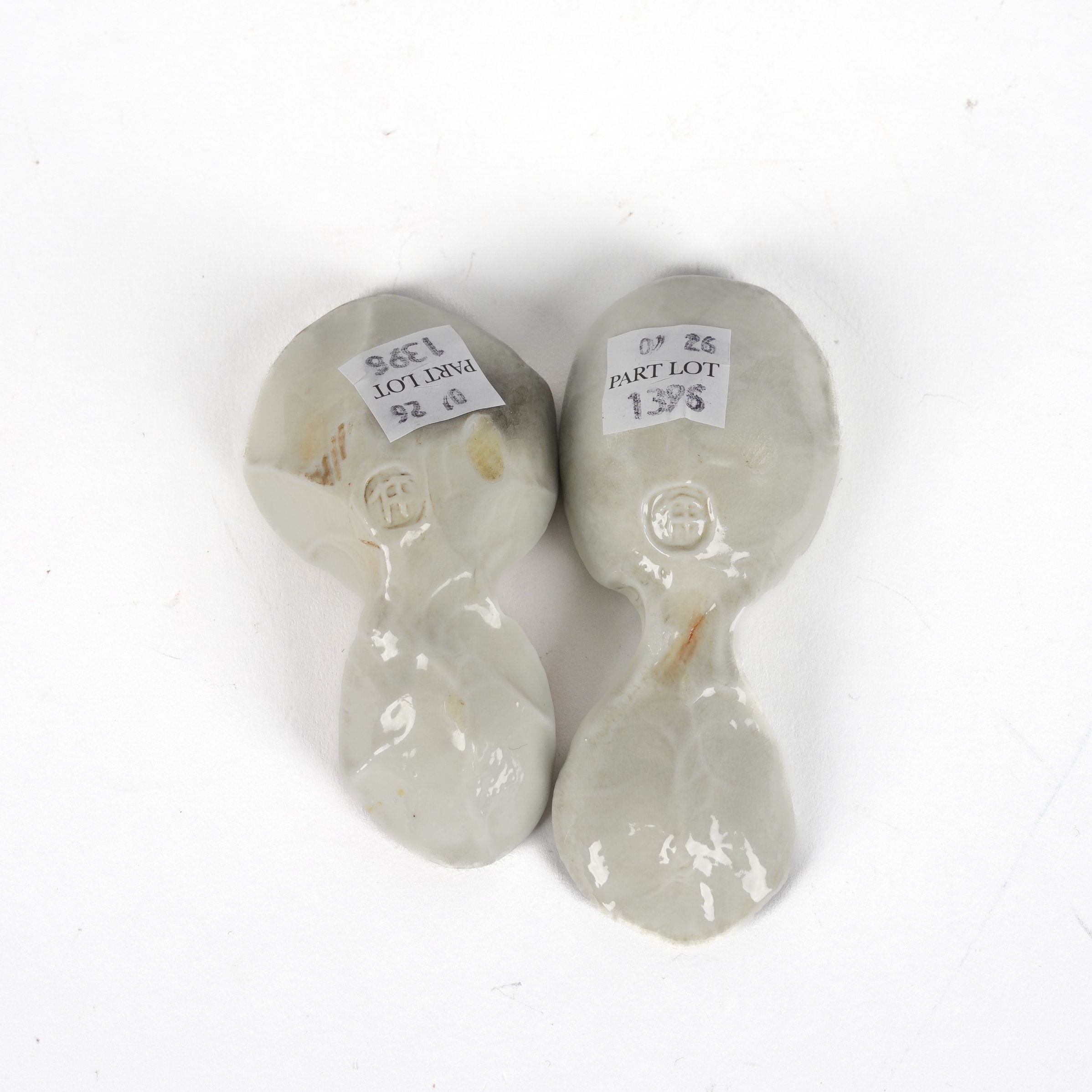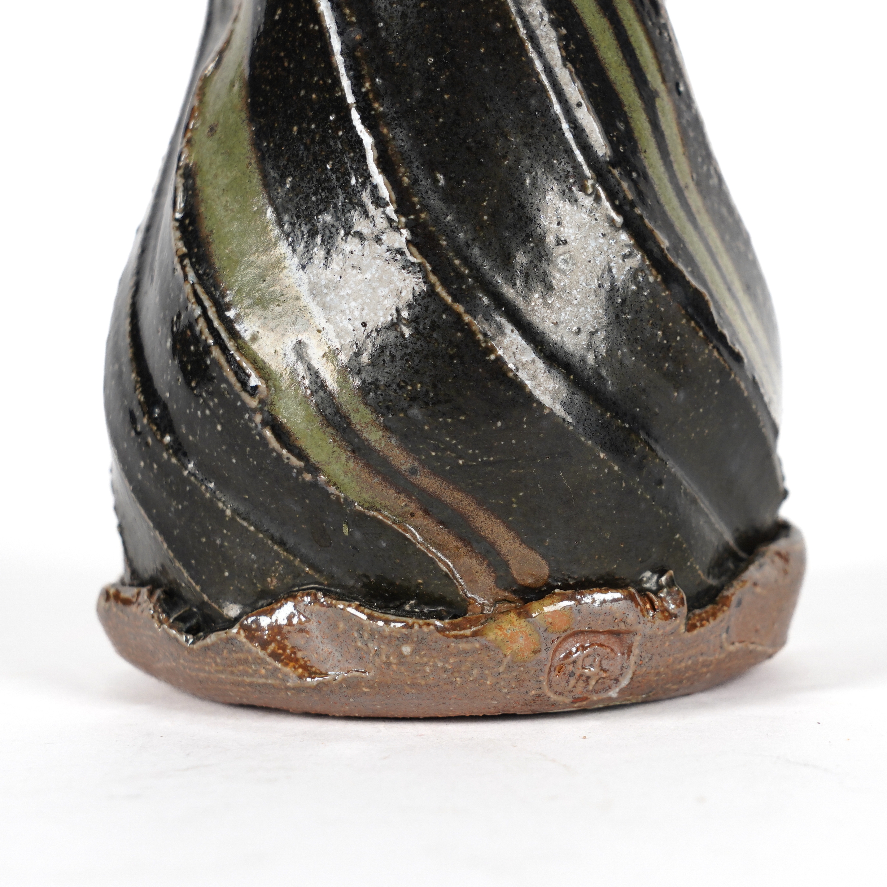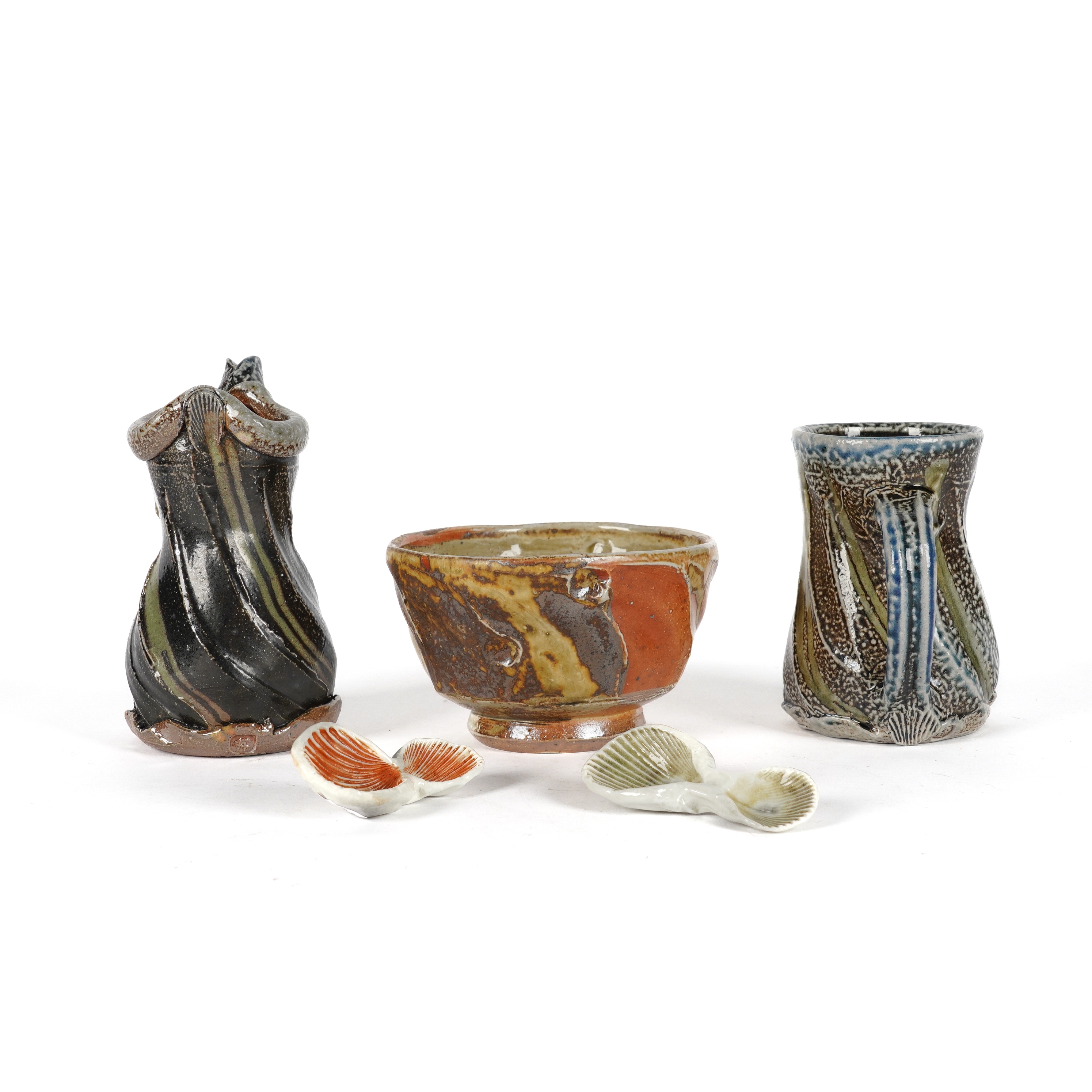 Of faceted form, glazed in orange, brown and green, impressed potter's marks to foot, 8.5cm high, 13.5cm diameter, two caddy or salt spoons impressed with shells, potter's marks to base, a jug/pitcher with twisted facets and blue/green soda glazed decoration, impressed marks to foot, 16cm high, and a mug or tankard, similarly decorated with faceted form, soda glaze, and impressed shell design