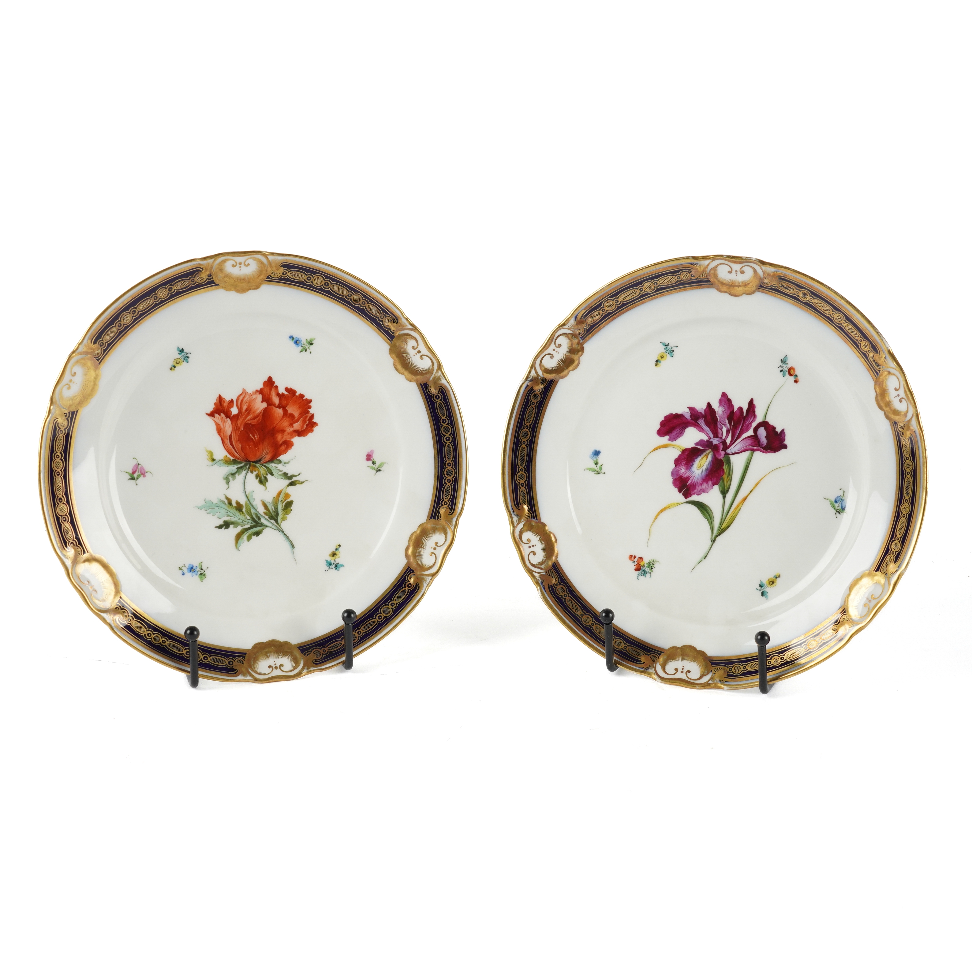 One painted with purple irises to centre, the other with a red flower, possibly peony, each with gilt cobalt blue border, 'Beehive' underglaze mark and stamped '808' marks to base, 20cm diameter