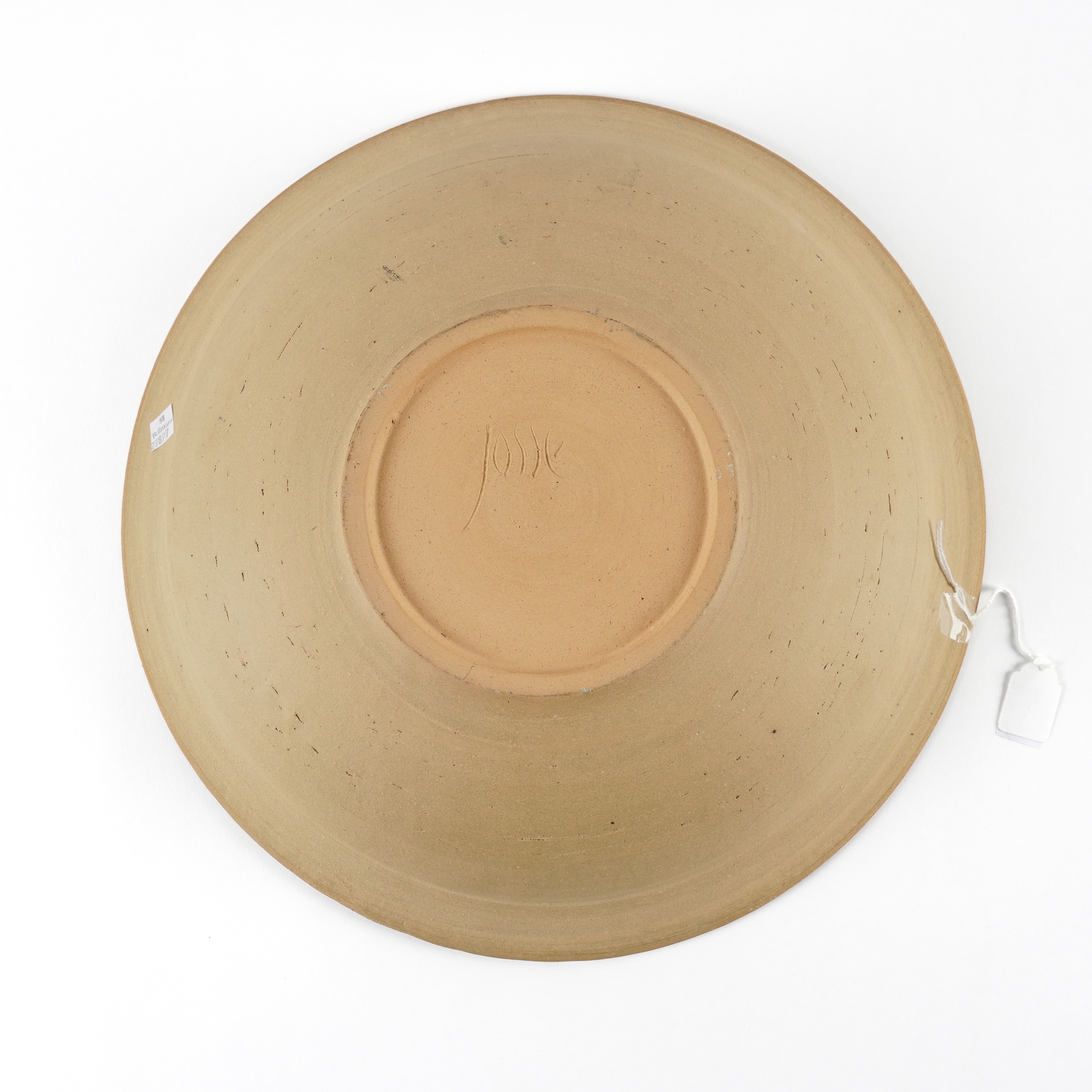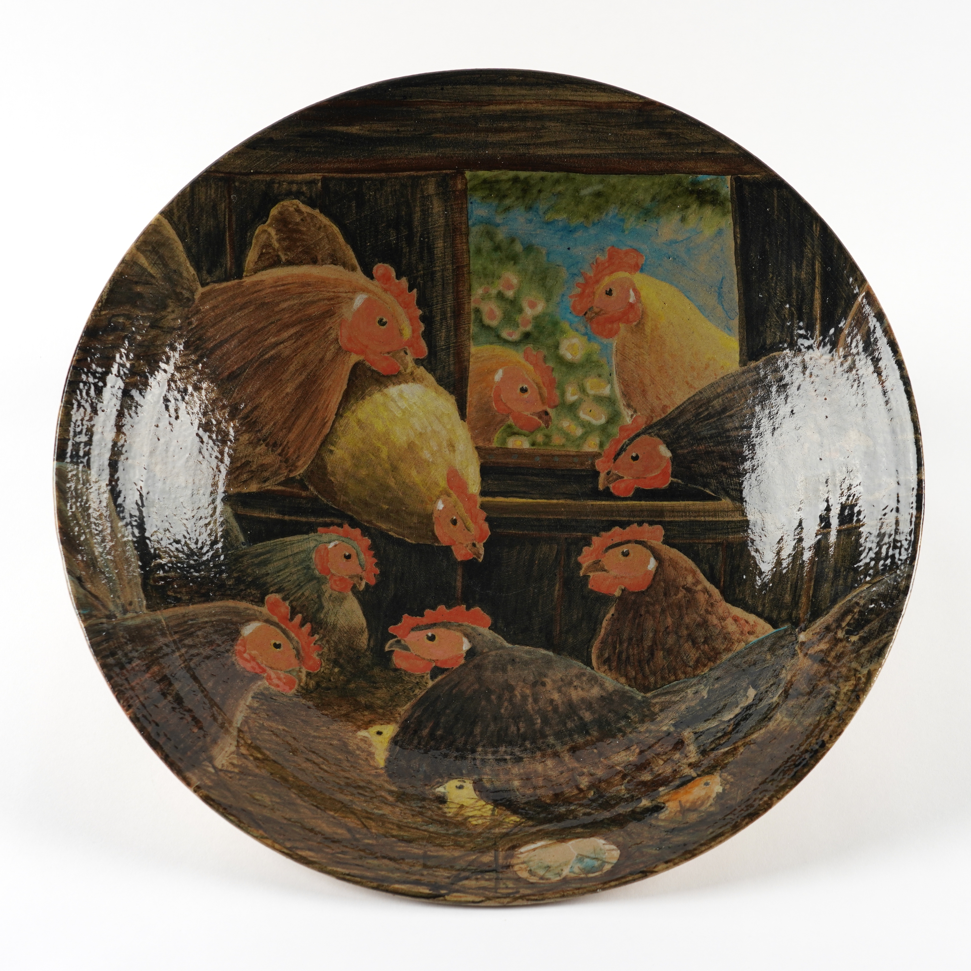 1990's Painted with a chicken shed, black painted and incised signature, 40cm diameter
