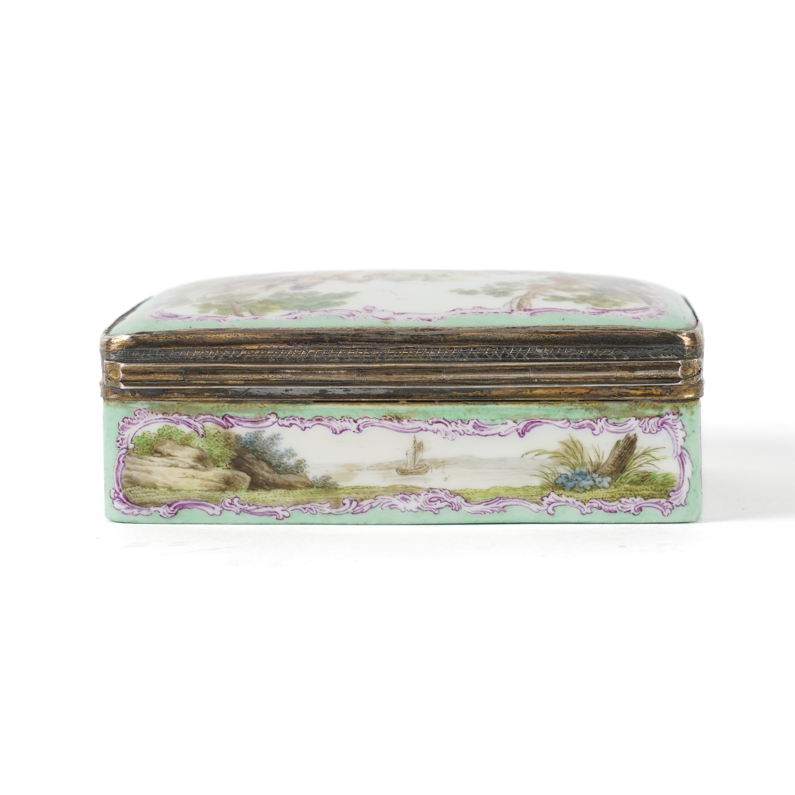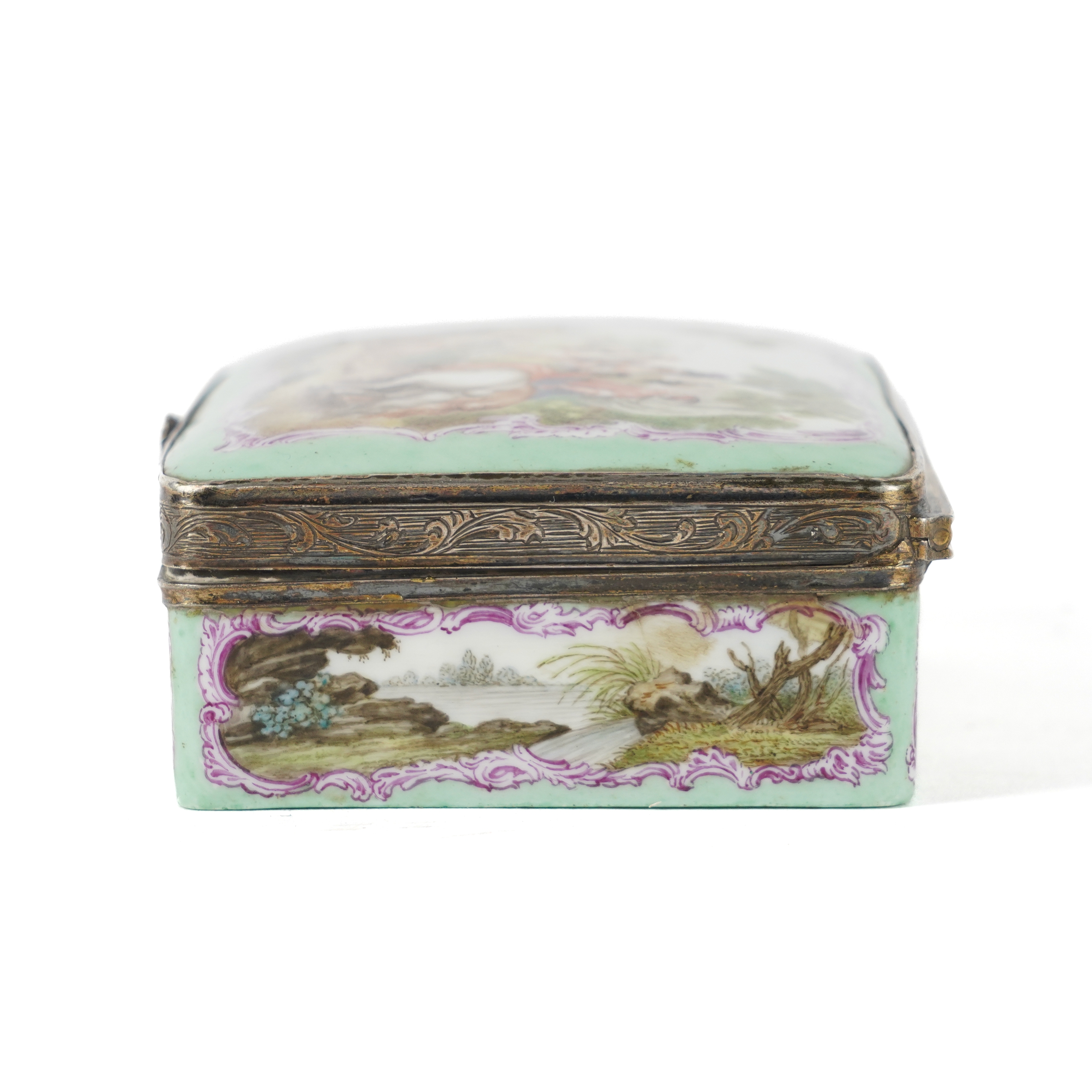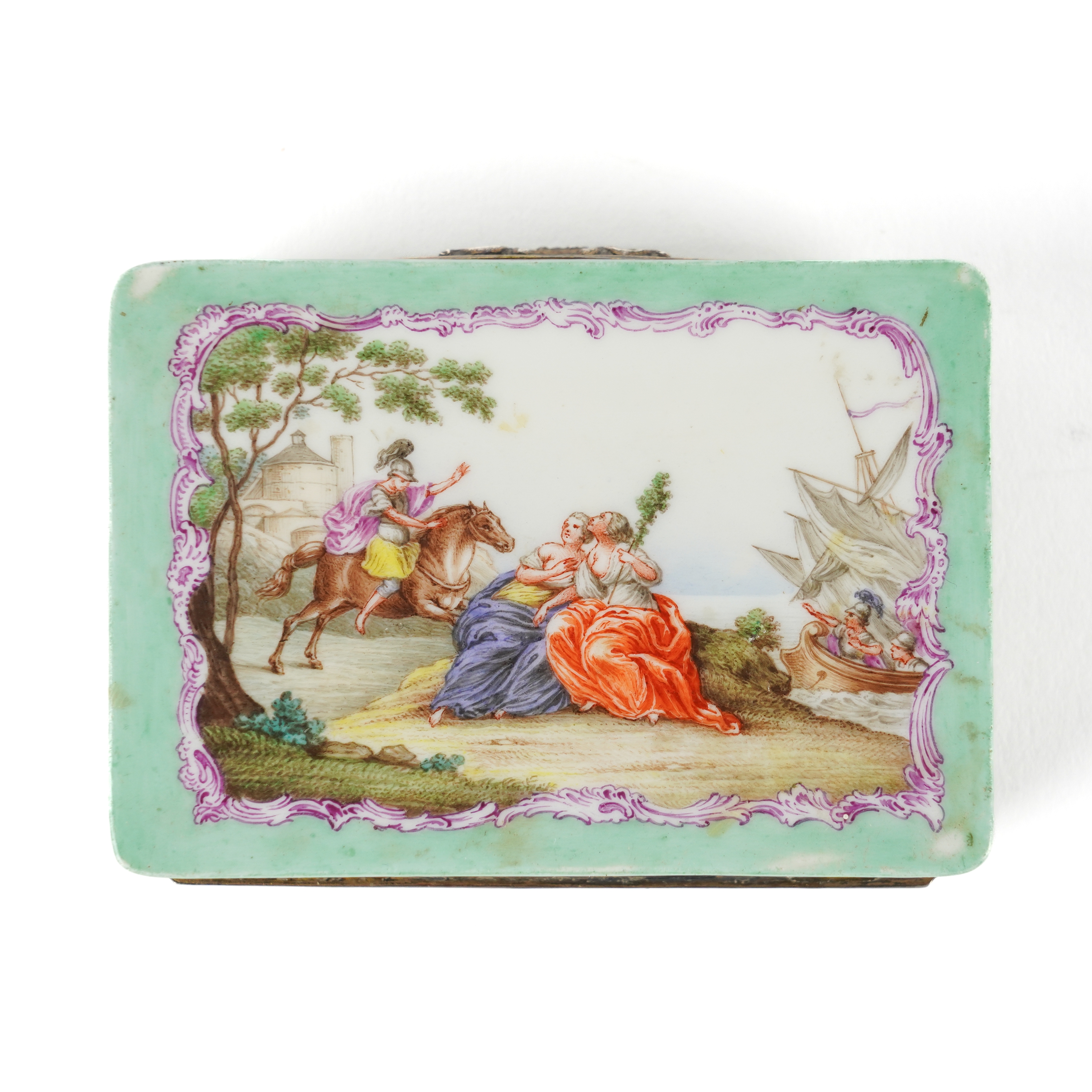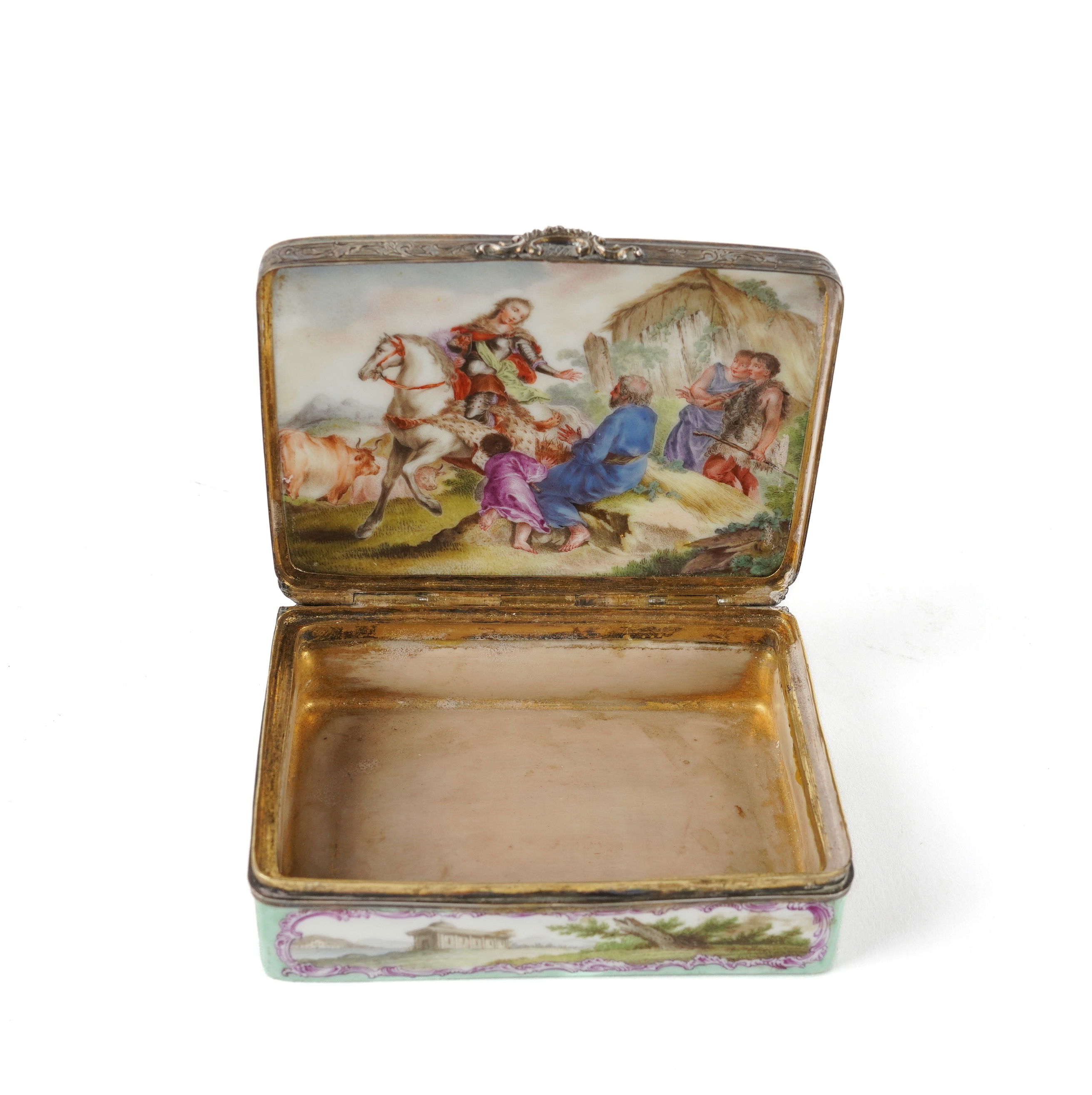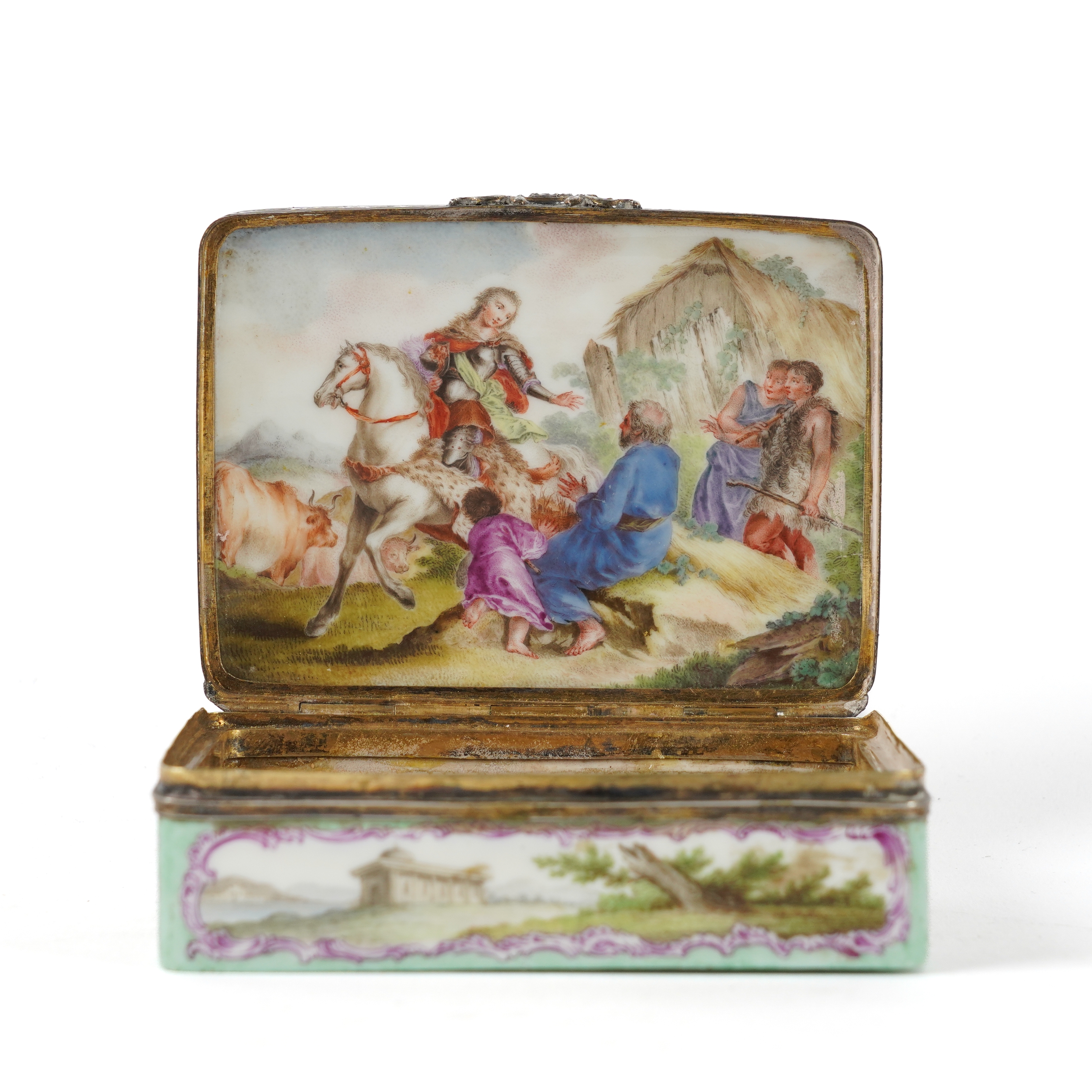 The cover painted with classical figures on horseback approaching a castle against a pale green ground, the sides with landscape vignettes, the base and interior of the lid painted with further figurative scenes, 8cm wide