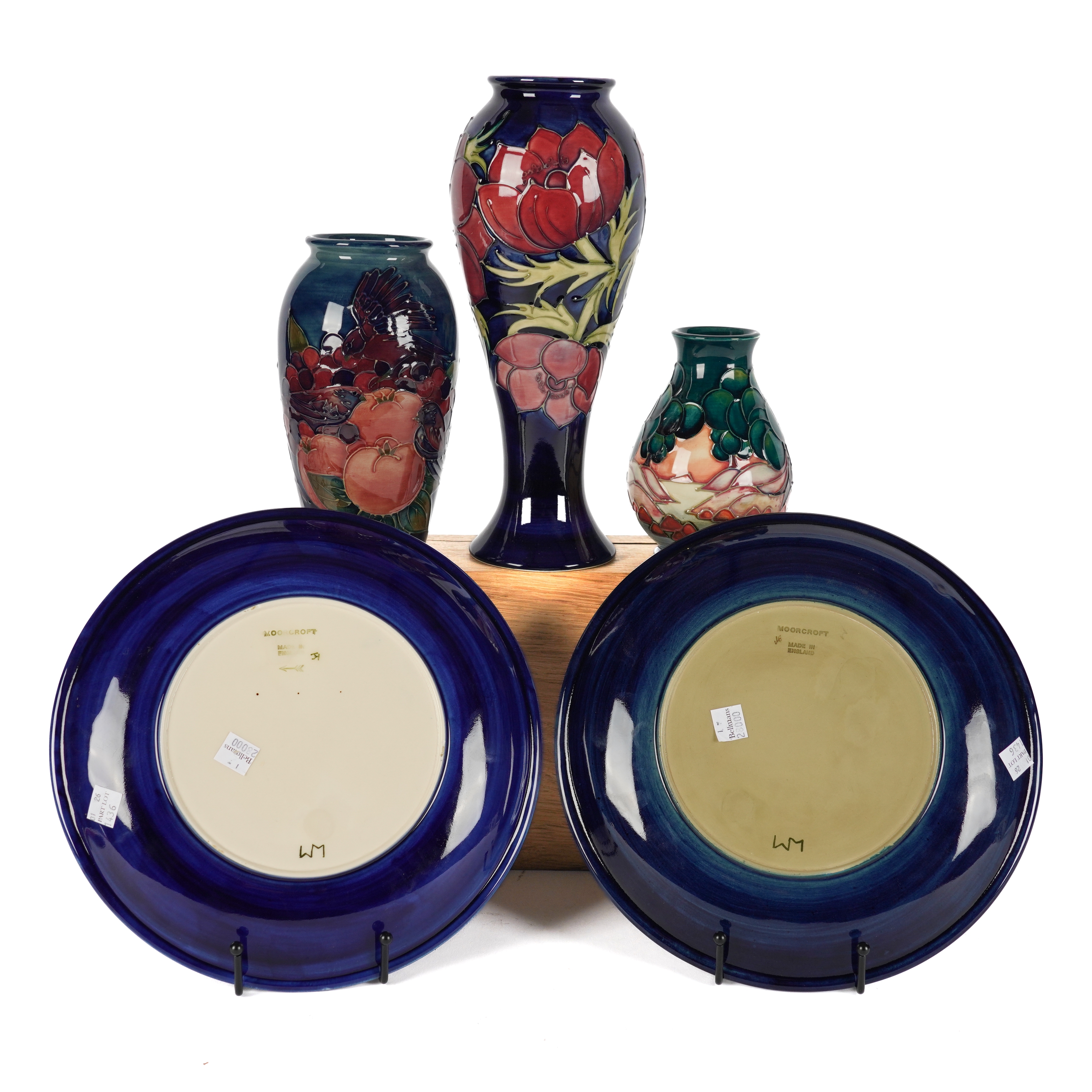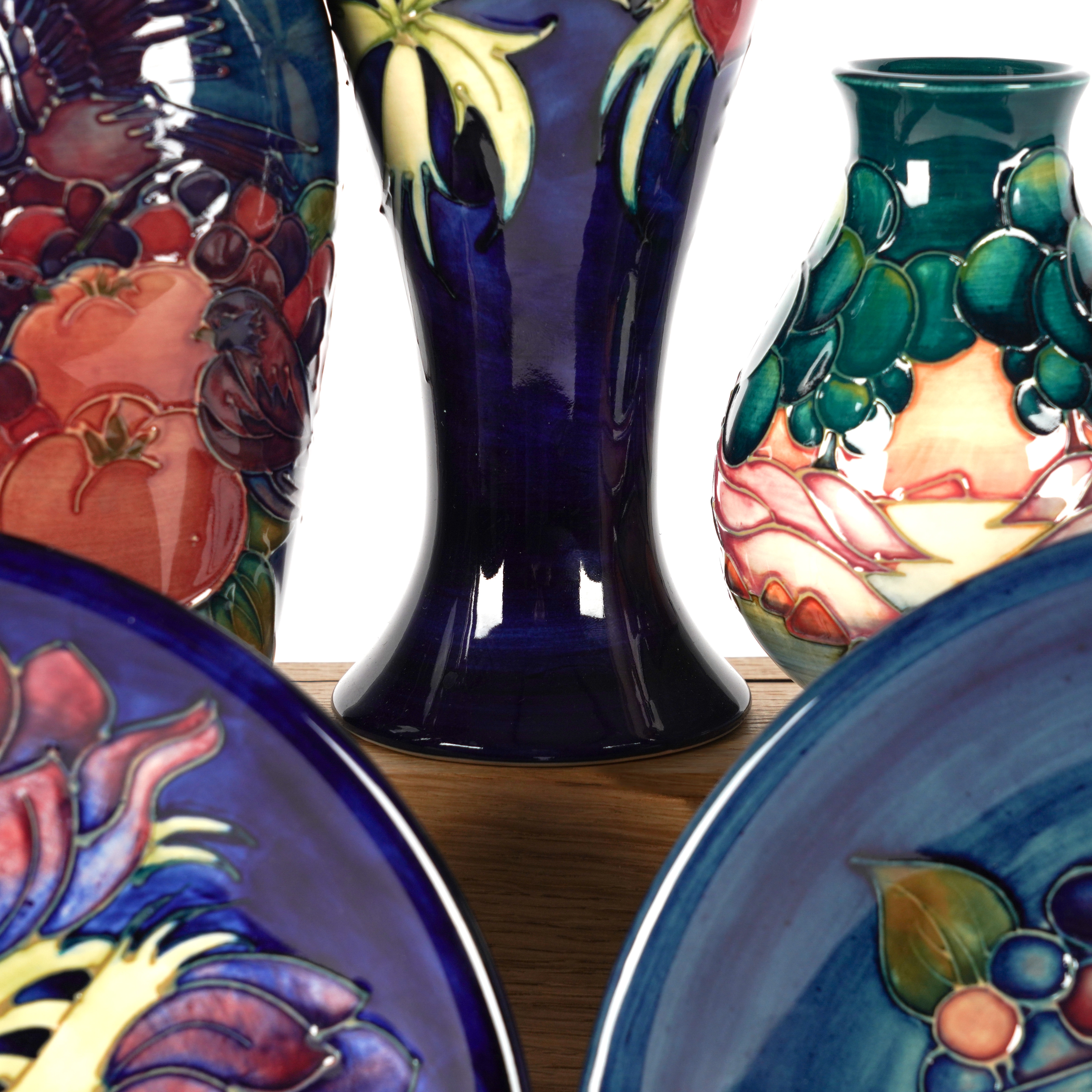 Comprising; a small `Mamoura' pattern vase designed by Sally Tuffin, 1992, 14cm high; a `Finches and Fruit' vase designed by Sally Tuffin, 1990, 18.75cm high; a tall `Anenome' pattern vase, 1991, 28cm high; a `Finches and Fruit' plate, 26cm diameter and an `Anenome' pattern plate, 1990, 26cm diameter