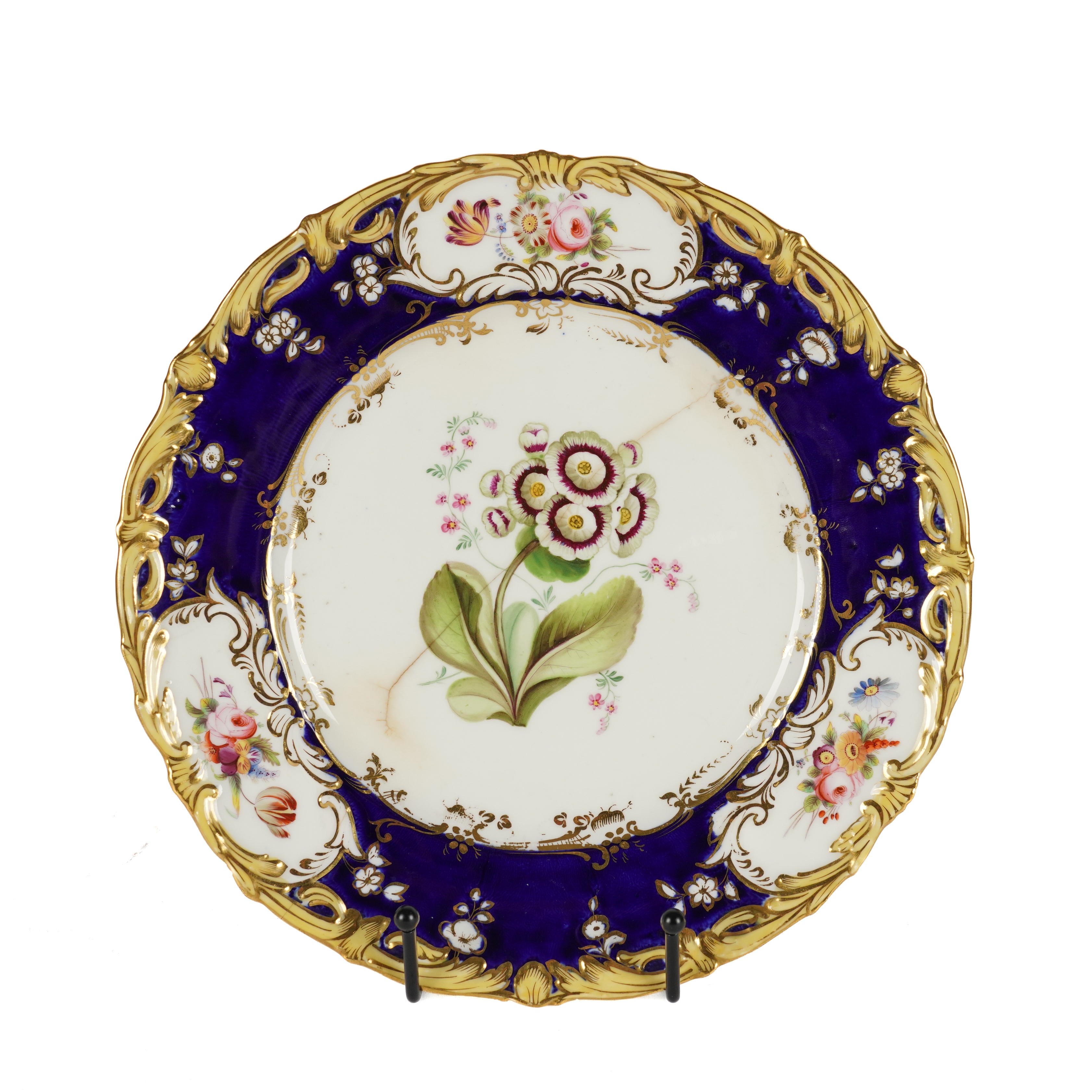 Painted by Stephen Lawrence, each with a central roundel of flowers in overglaze polychrome enamels, the border having gilt decoration against a cobalt blue ground interspersed with reserves of enamelled flowers, two plates with 2/412 fractional marks to base, 23.5cm diameter