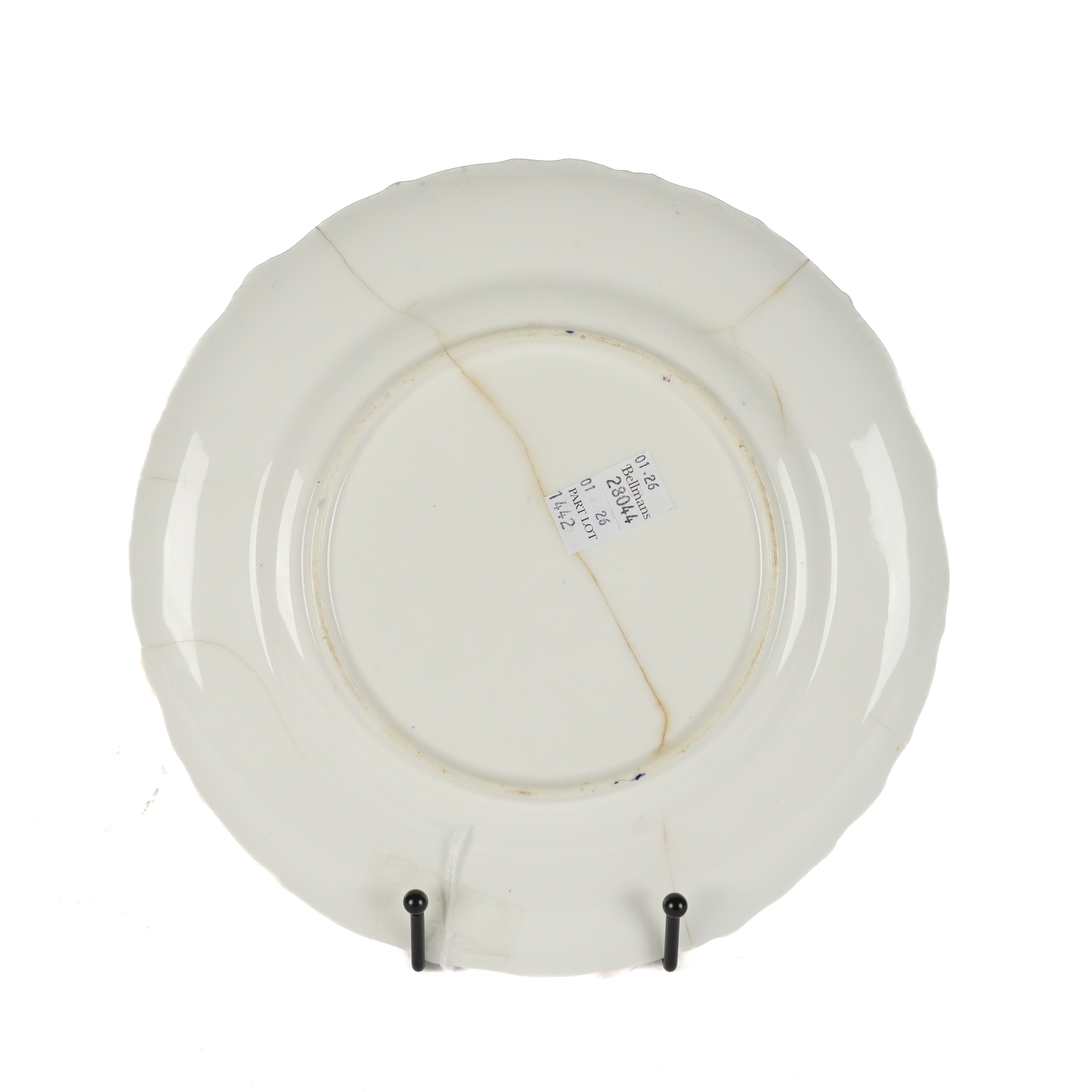 Wear commensurate with age and use throughout including some scratches, rubbing to enamel, wear to gilding etc...one plate with small chip to foot, one plate with several cracks and extensive crazing