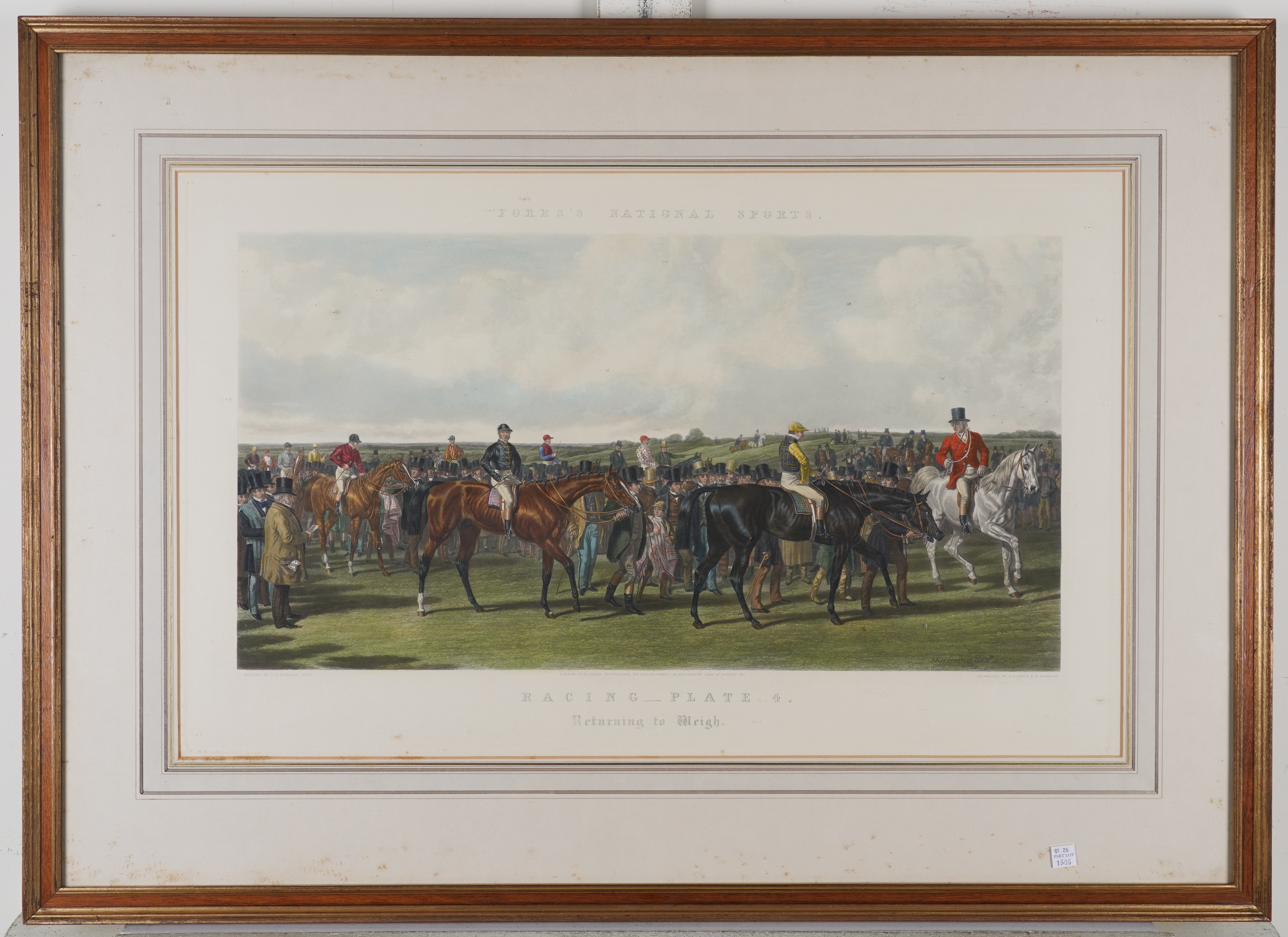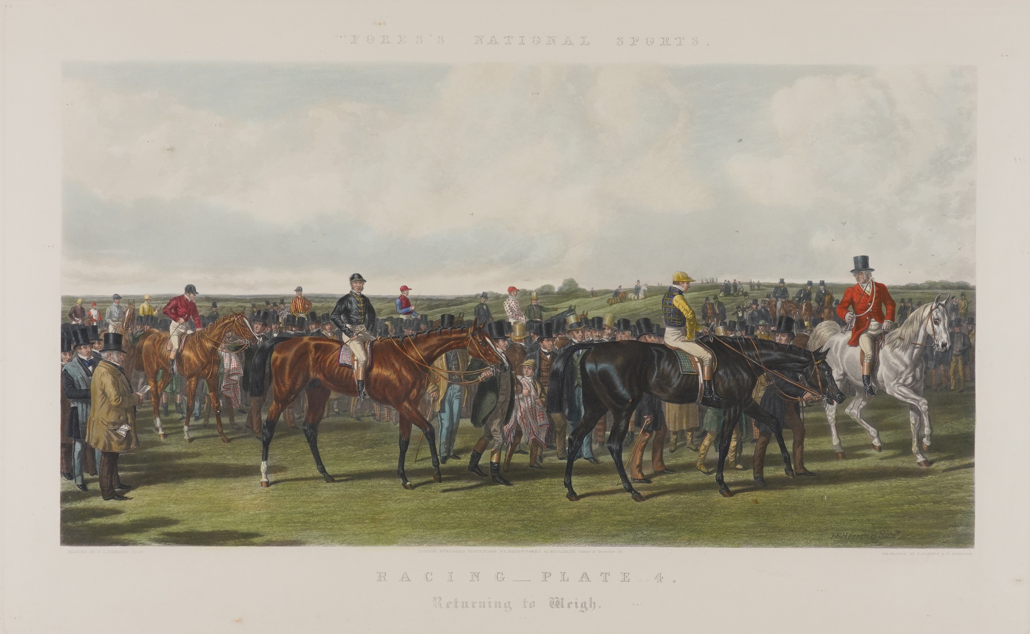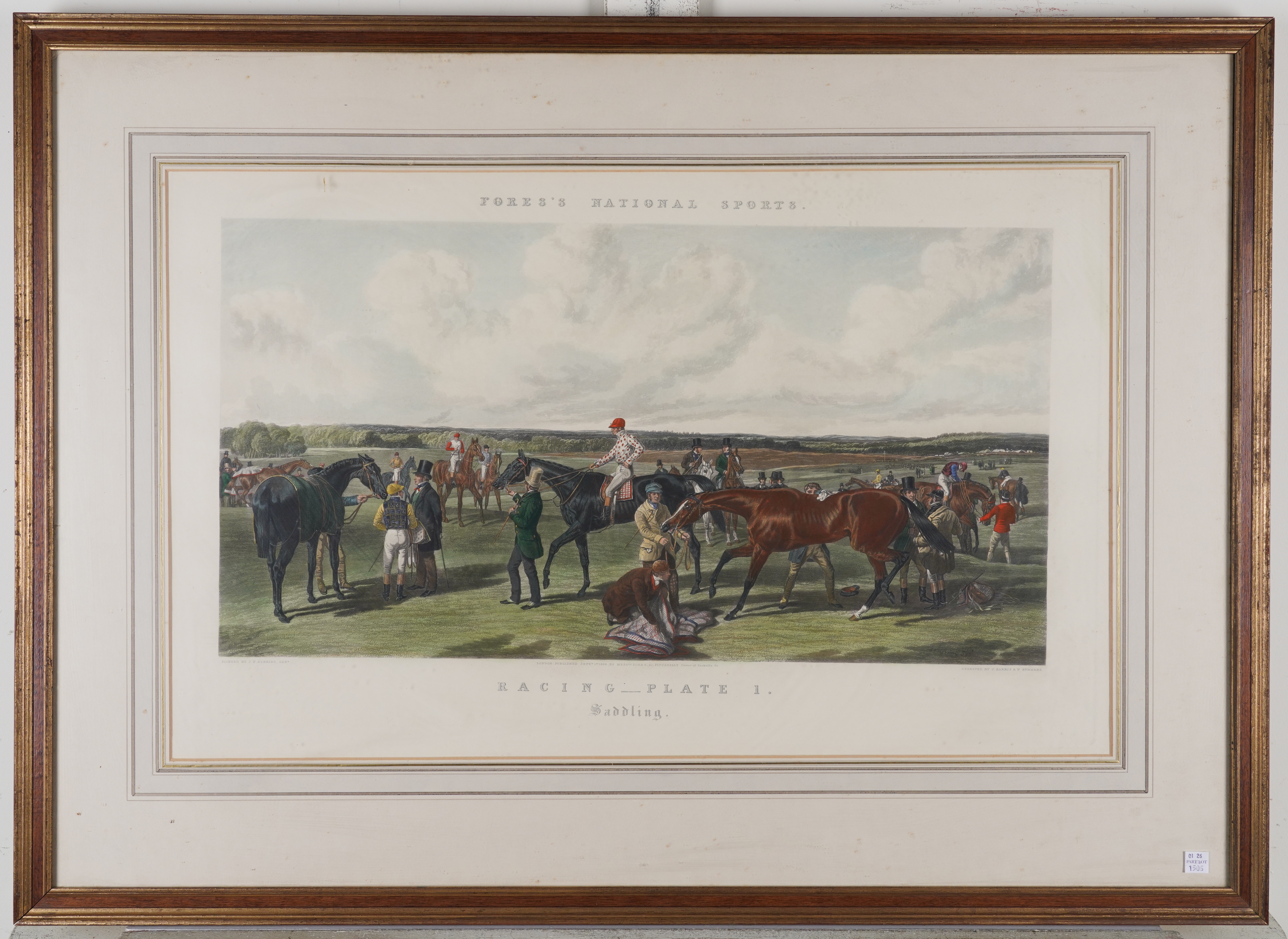 together with Fore's National Sports: Racing, Saddling; A False Start; The Run-In; Returning to Weigh, a set of four engravings by J Harris and W Summer after John Frederick Herring Snr.