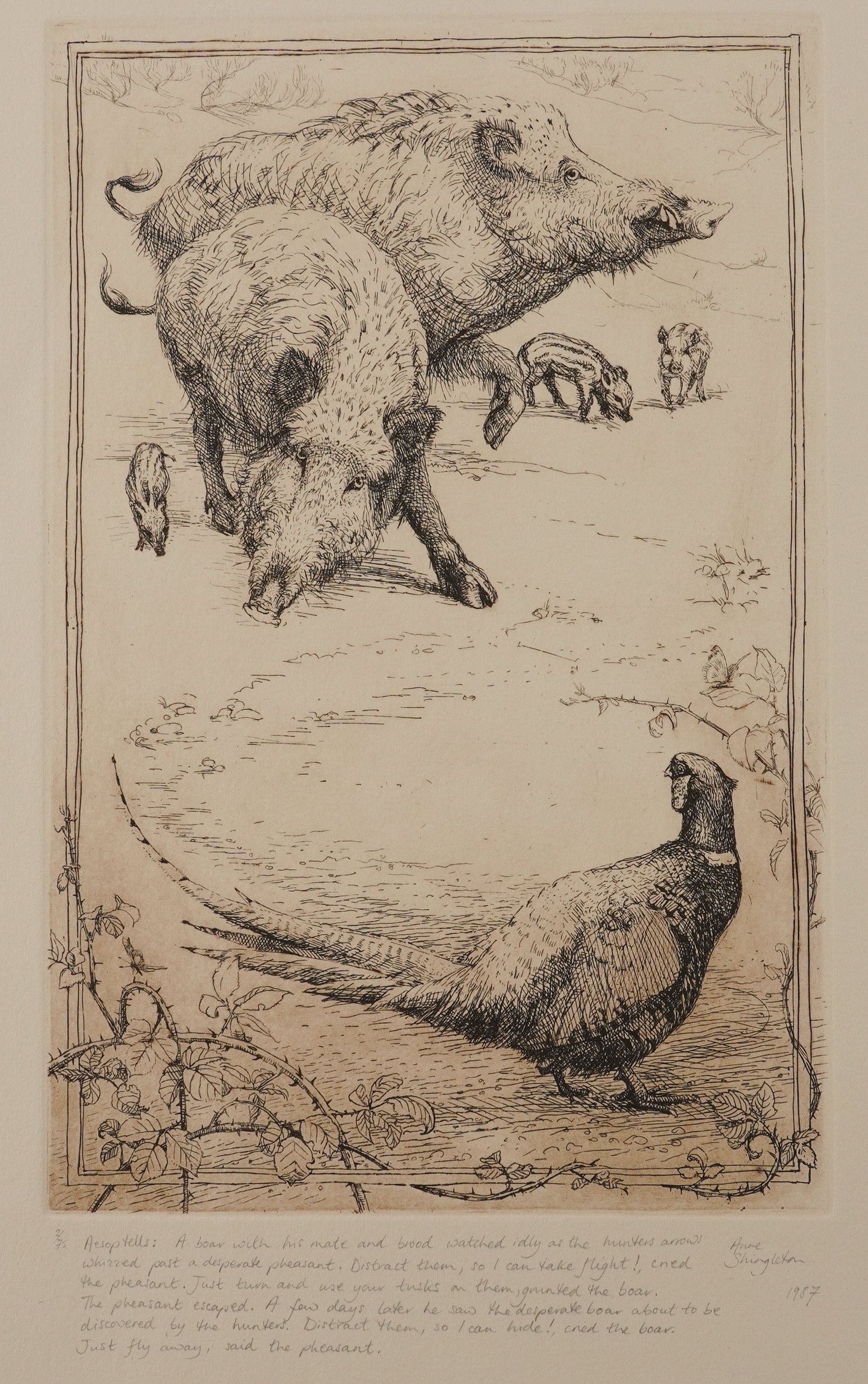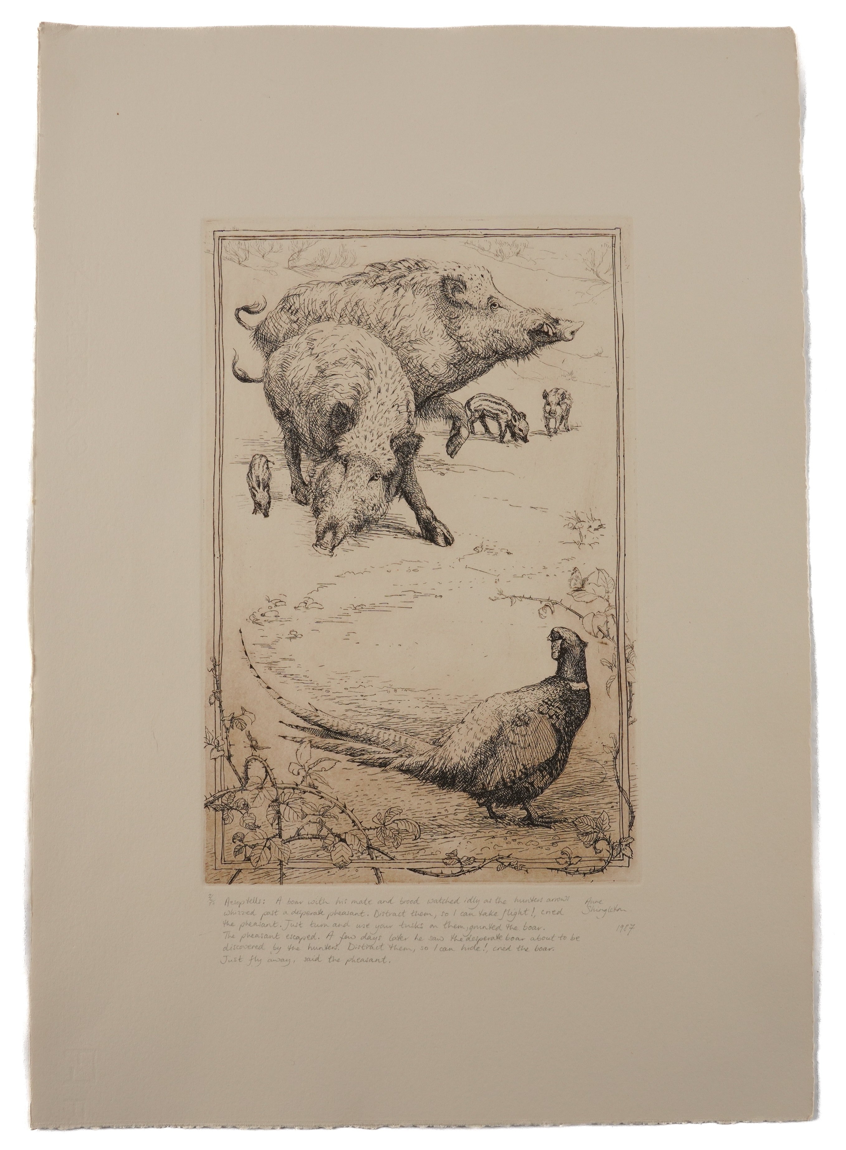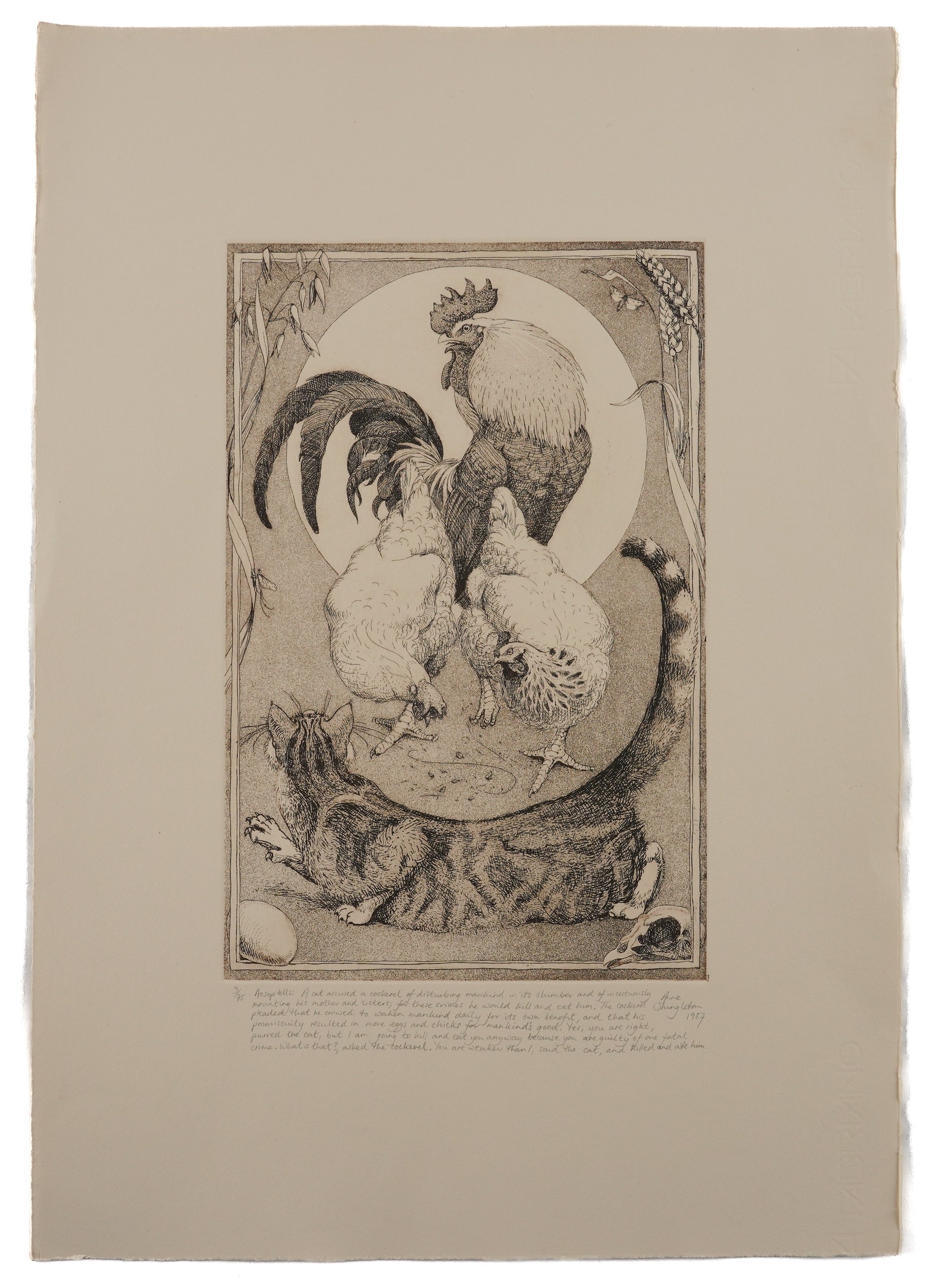 Sheets are sound throughout and each work in good, clean condition; minor creasing to upper left corner on Boar and Pheasant and Cat and Rooster.  All works unframed.