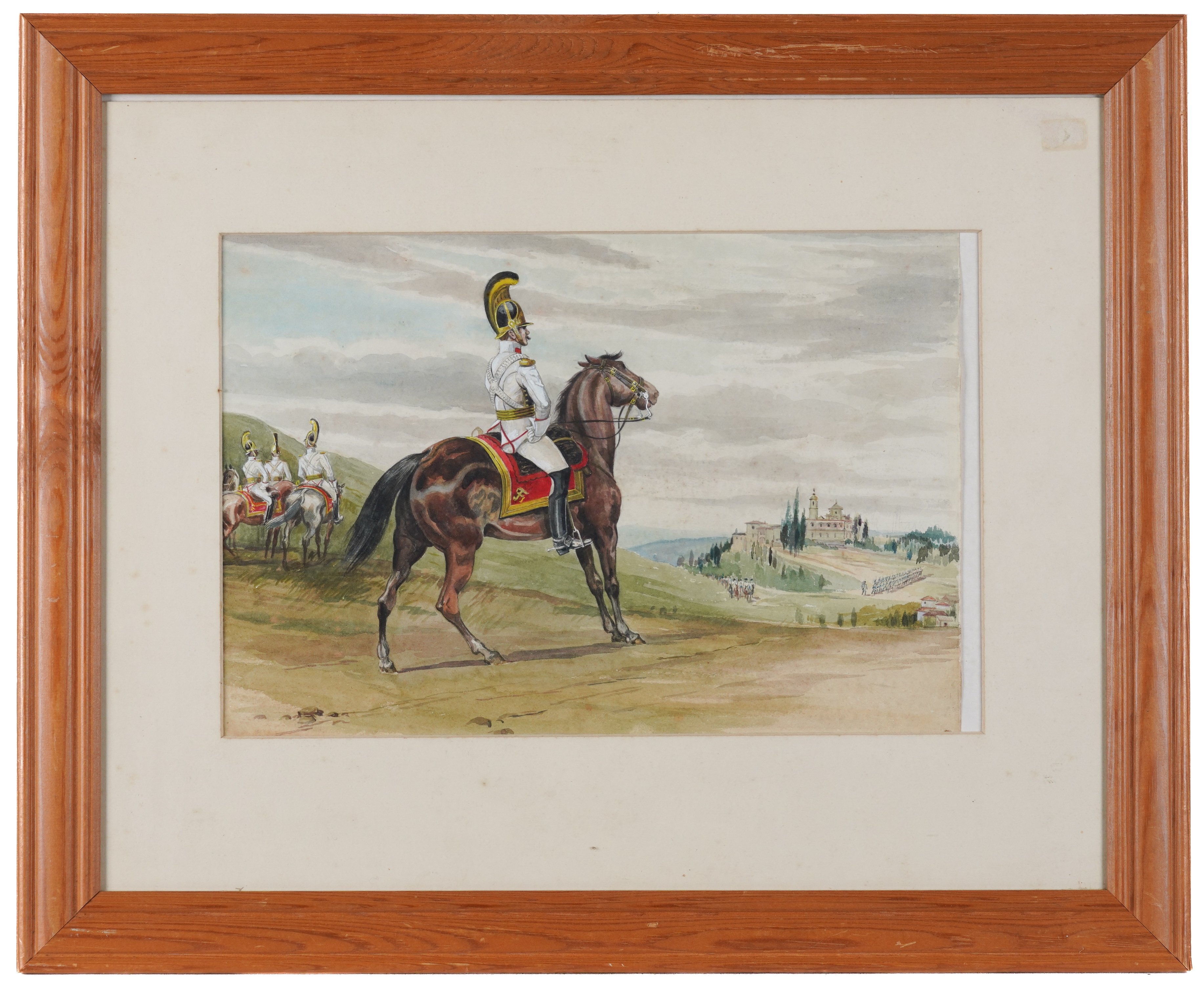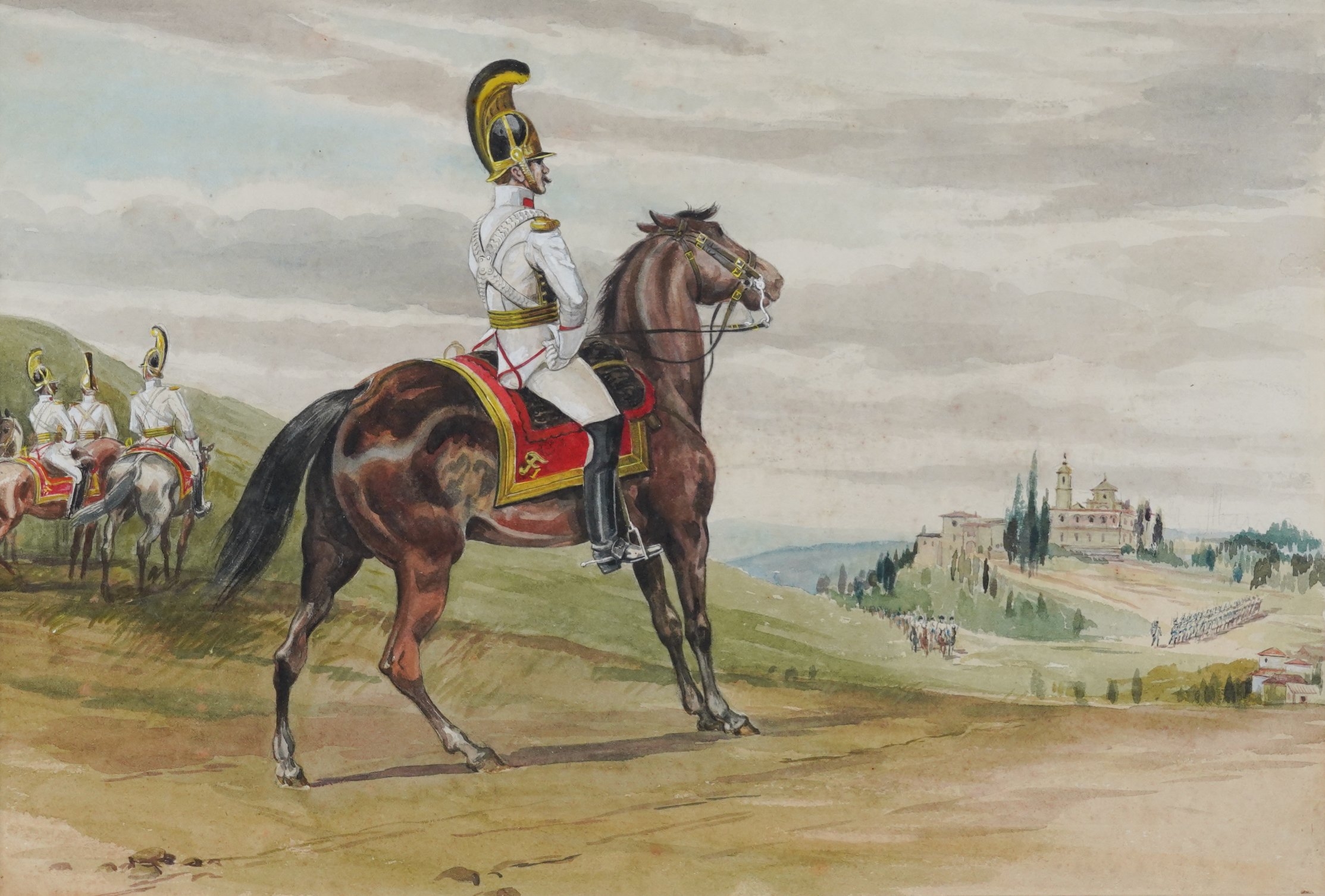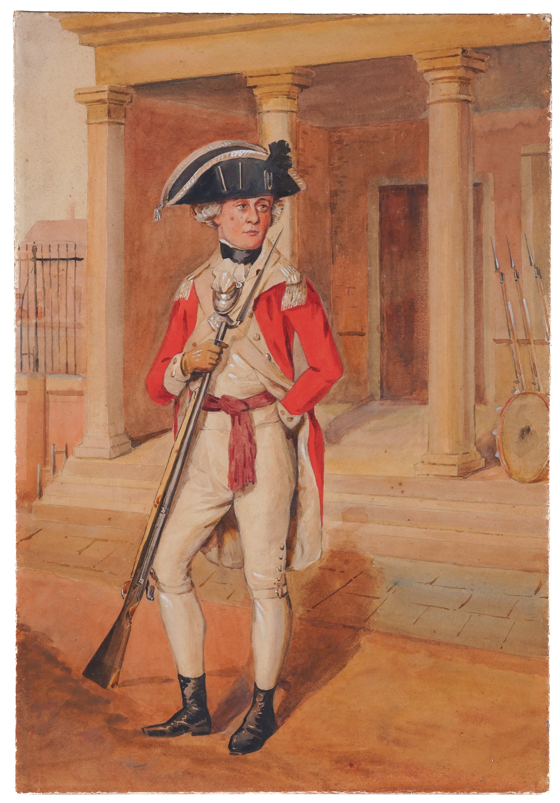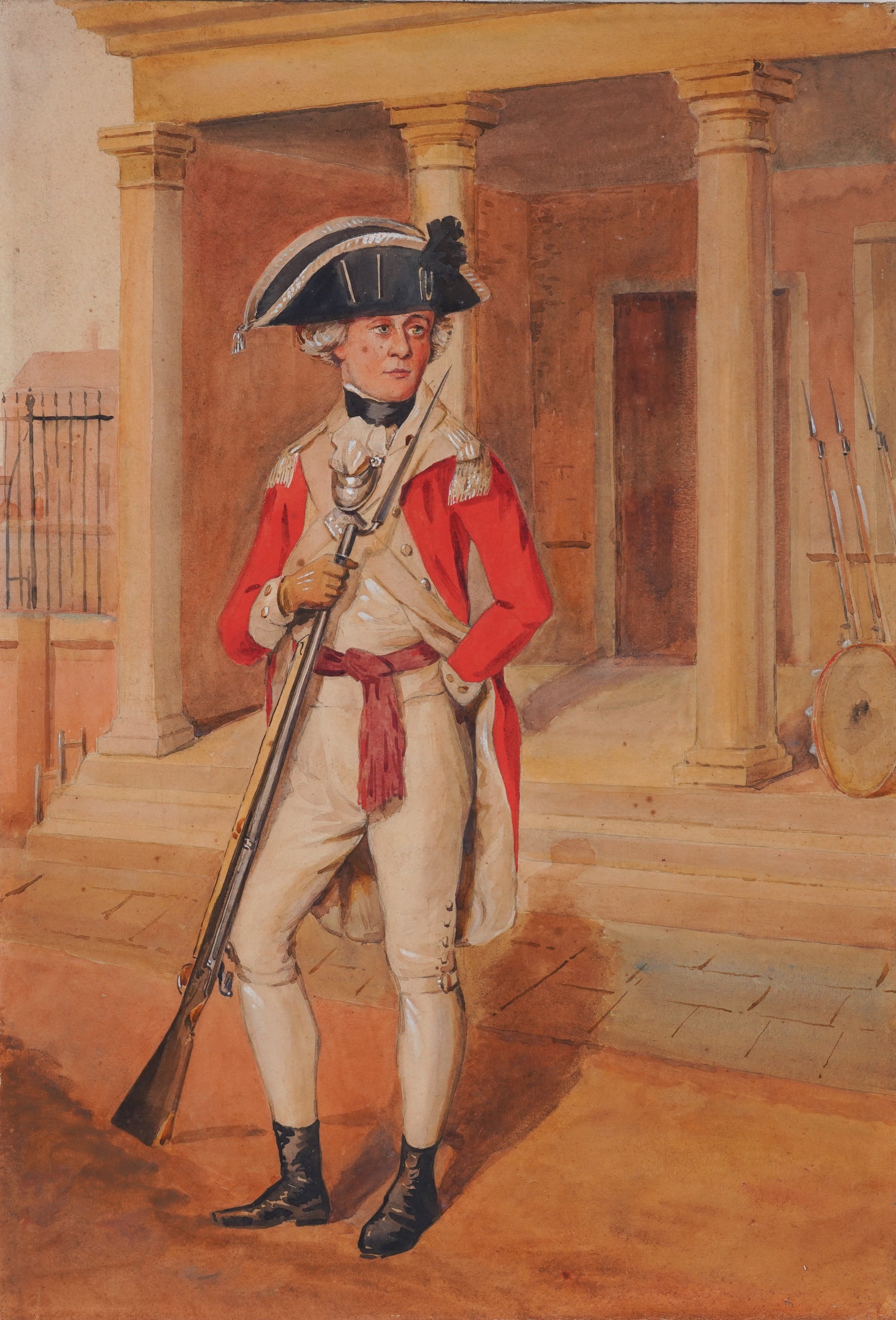together with a watercolour of a soldier in a red coat, 57 x 39cm, (unframed); a watercolour of a soldier on horseback, 25 x 37.5cm; a watercolour of a soldier holding a staff, 30 x 21cm; and a coloured print of a soldier, 25 x 16.5cm