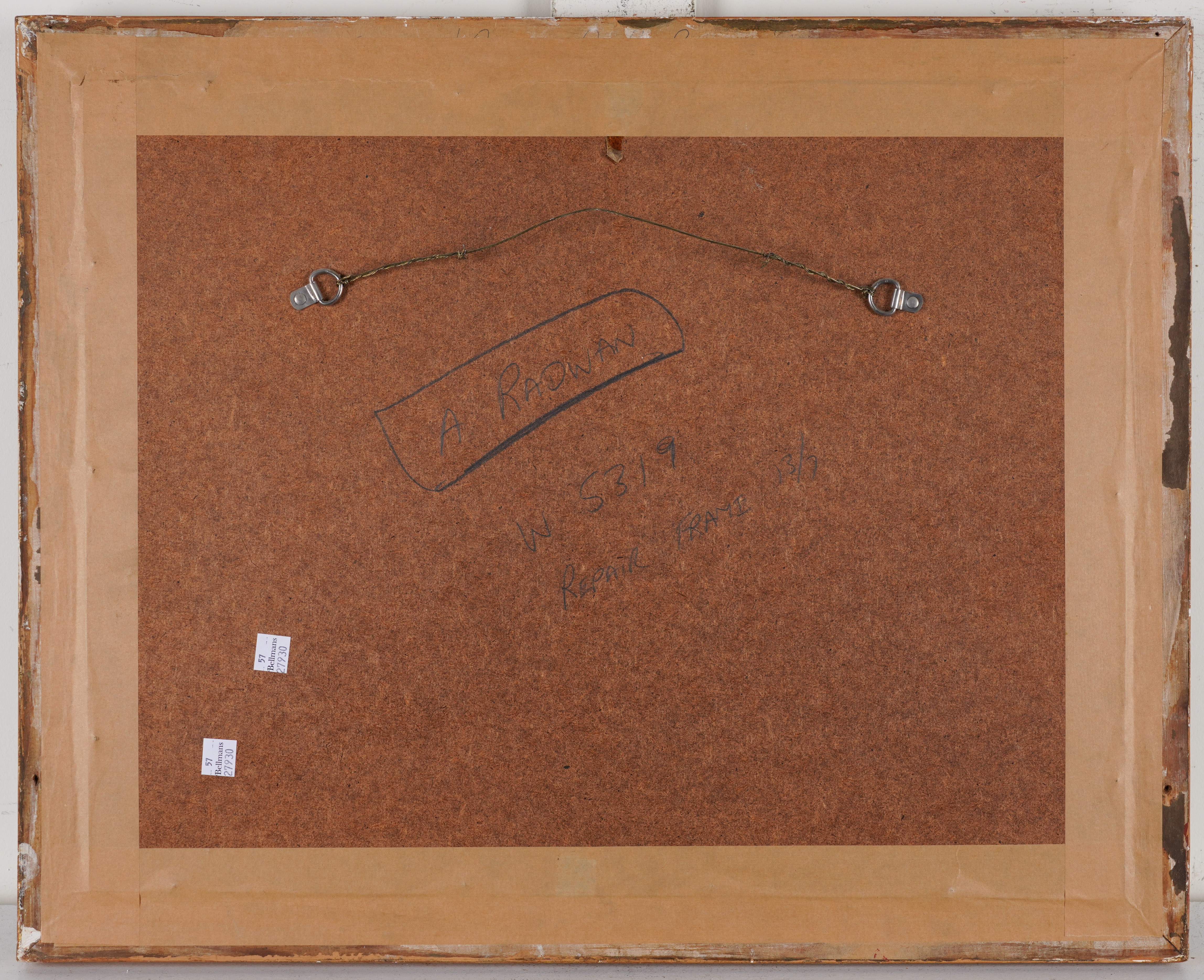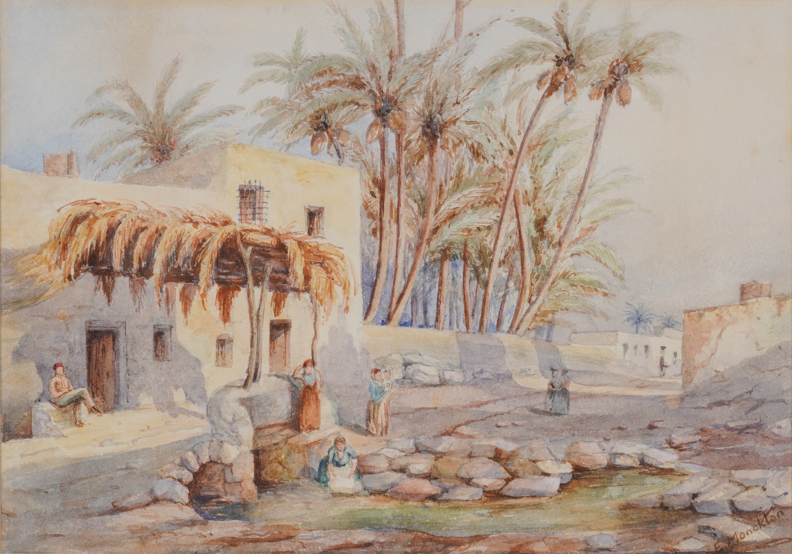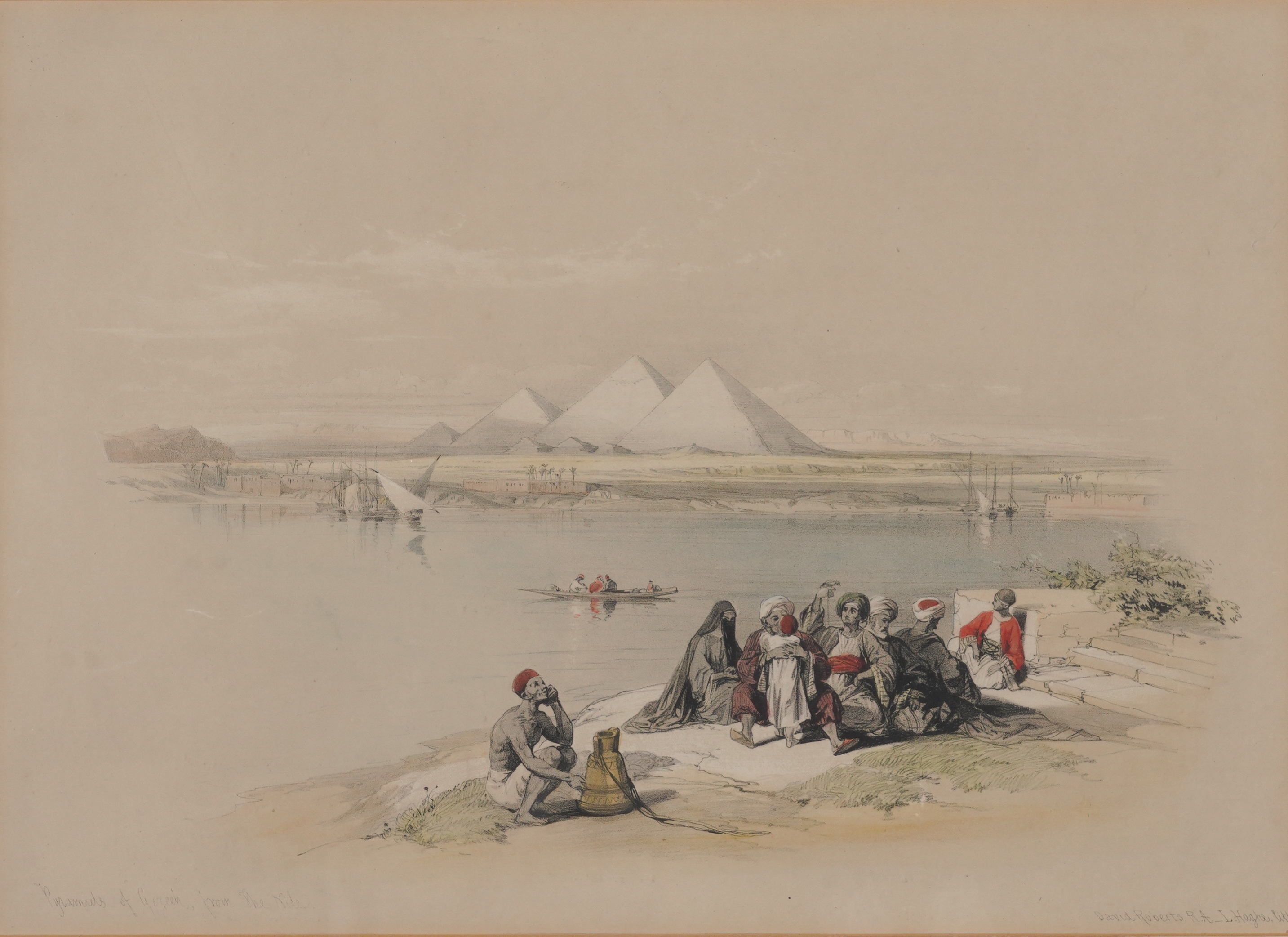 together with two other lithographs by Louis Haghe after David Roberts, Pyramids of Gezeeh, from the Nile, 24.5 x 34.5cm; Dayr el Medeeneh, Thebes, 25 x 35cm; and a watercolour of figures by palm trees, signed 'E Monckton', 24 x 35cm
