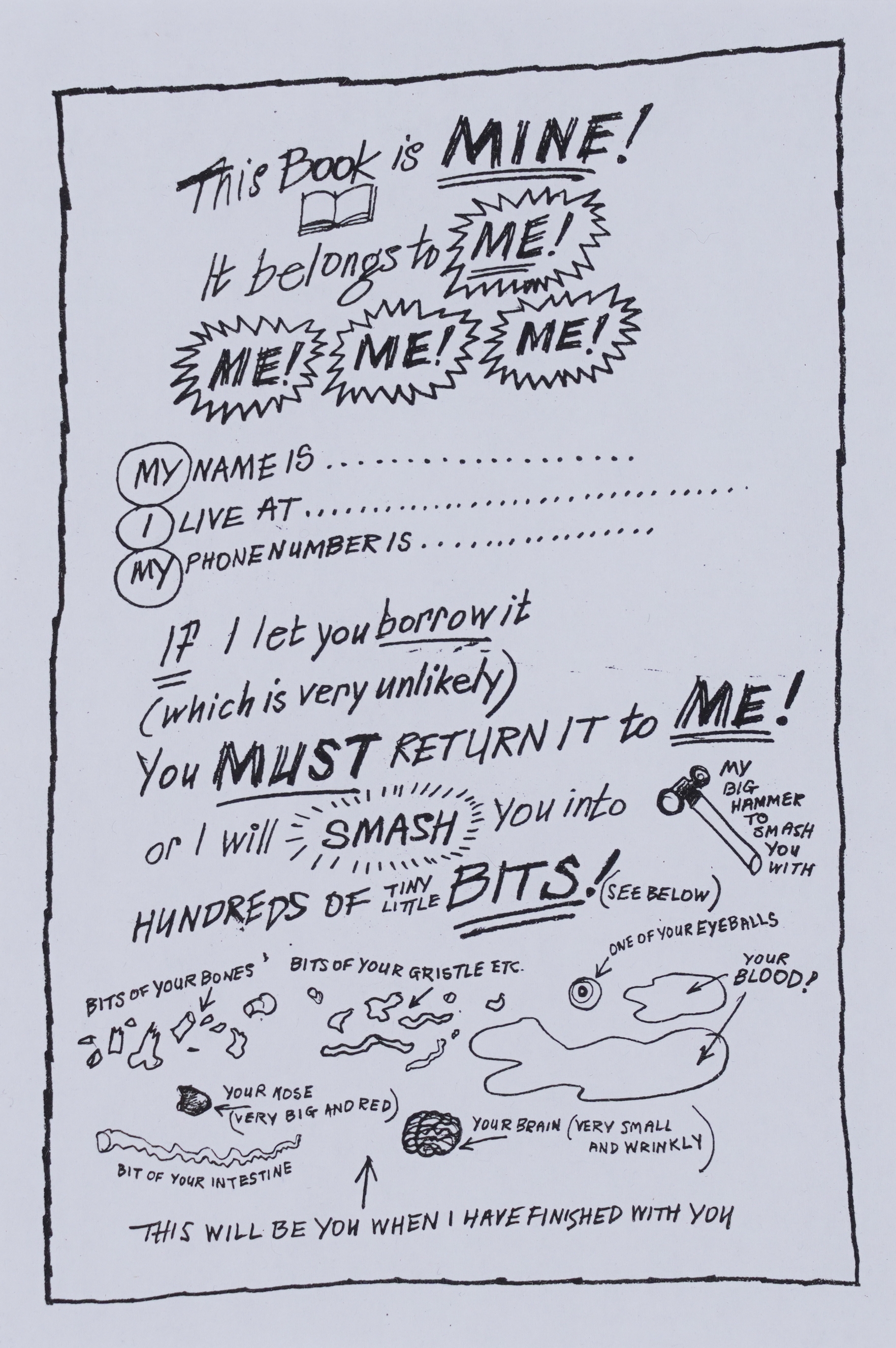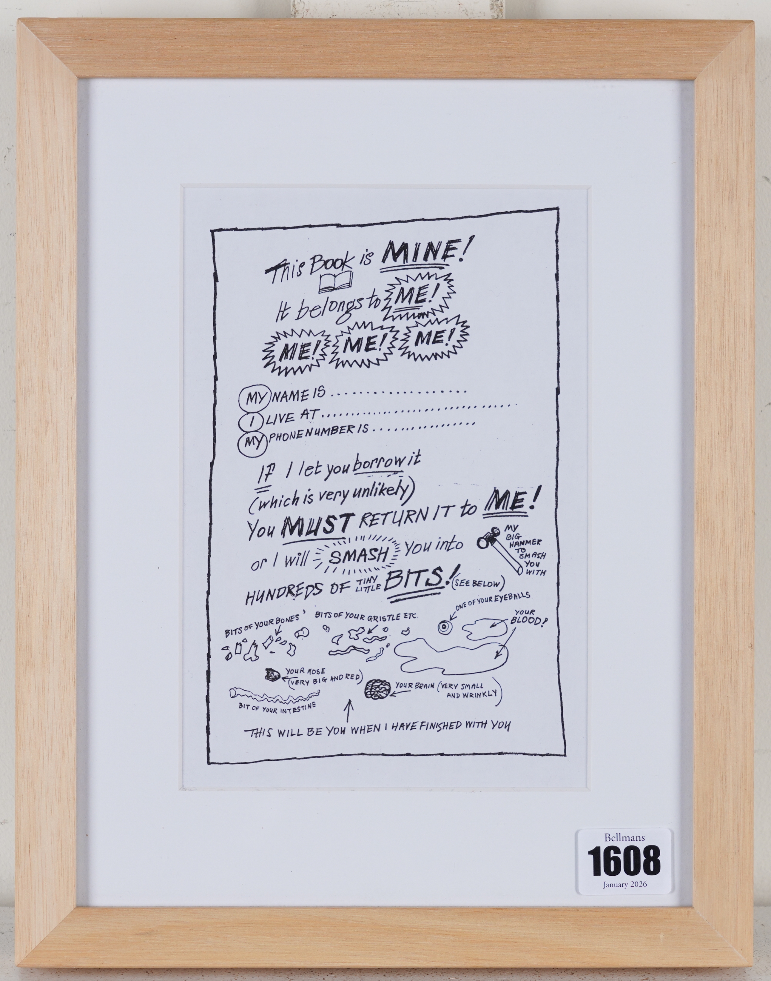 This book is mine! It belongs to me! print 20 x 13.5cm together with *** Boccioni, abstract composition, mixed media on paper; and drawing of a man in a suit by another hand (3, 2 unframed)