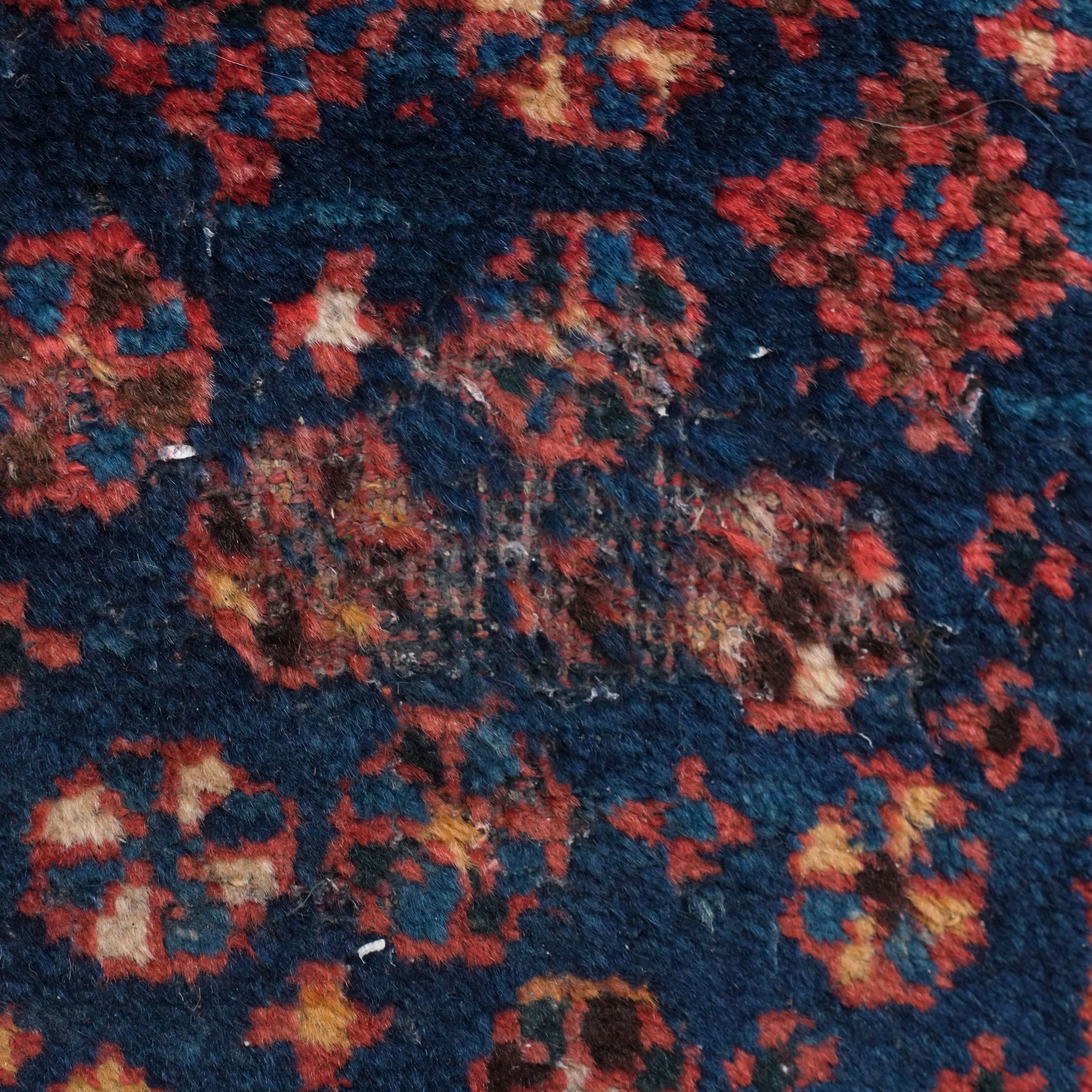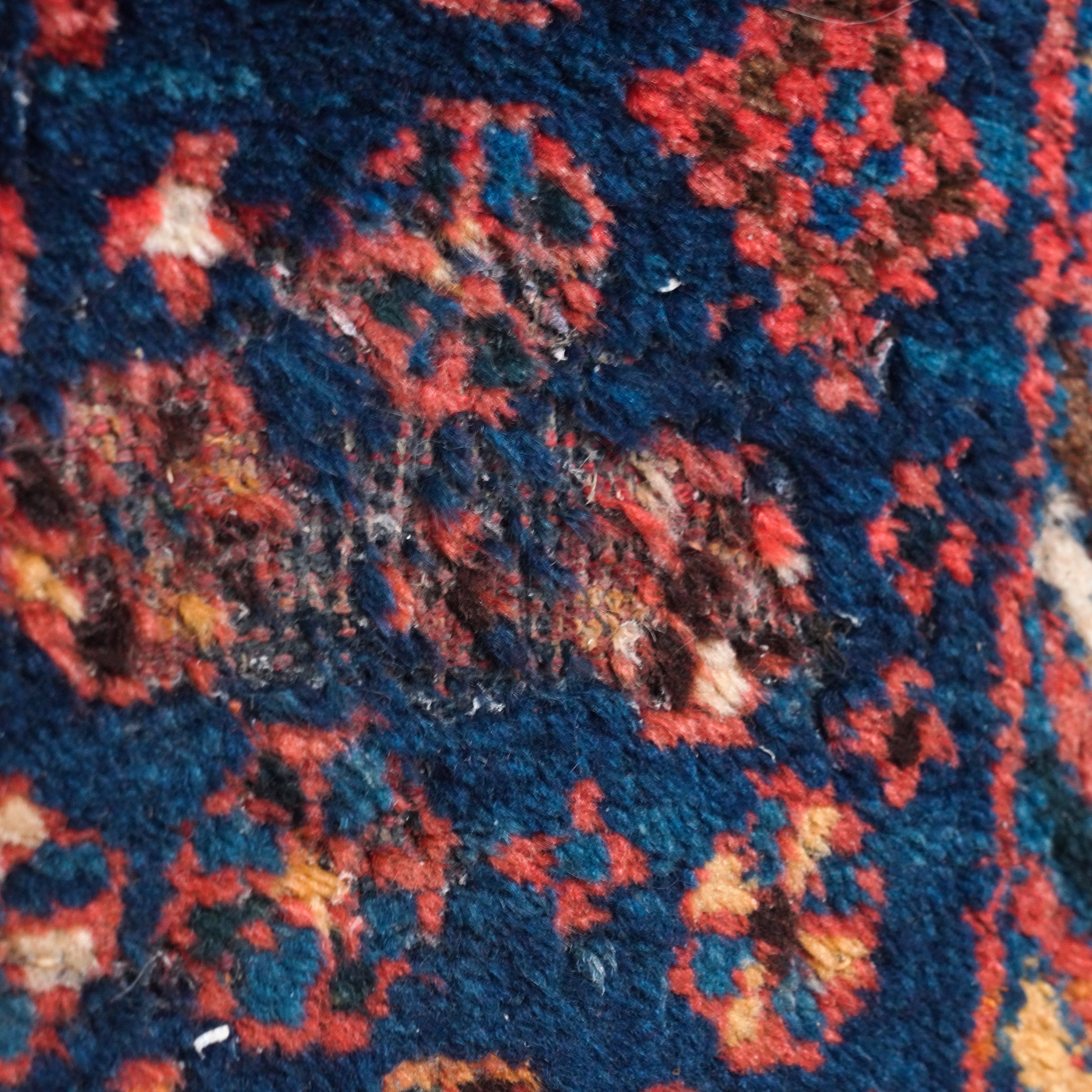 The indigo field with three-stepped diamonds, minor motifs; a madder stylised diamond border; 232cm x 170cm, circa 1950s