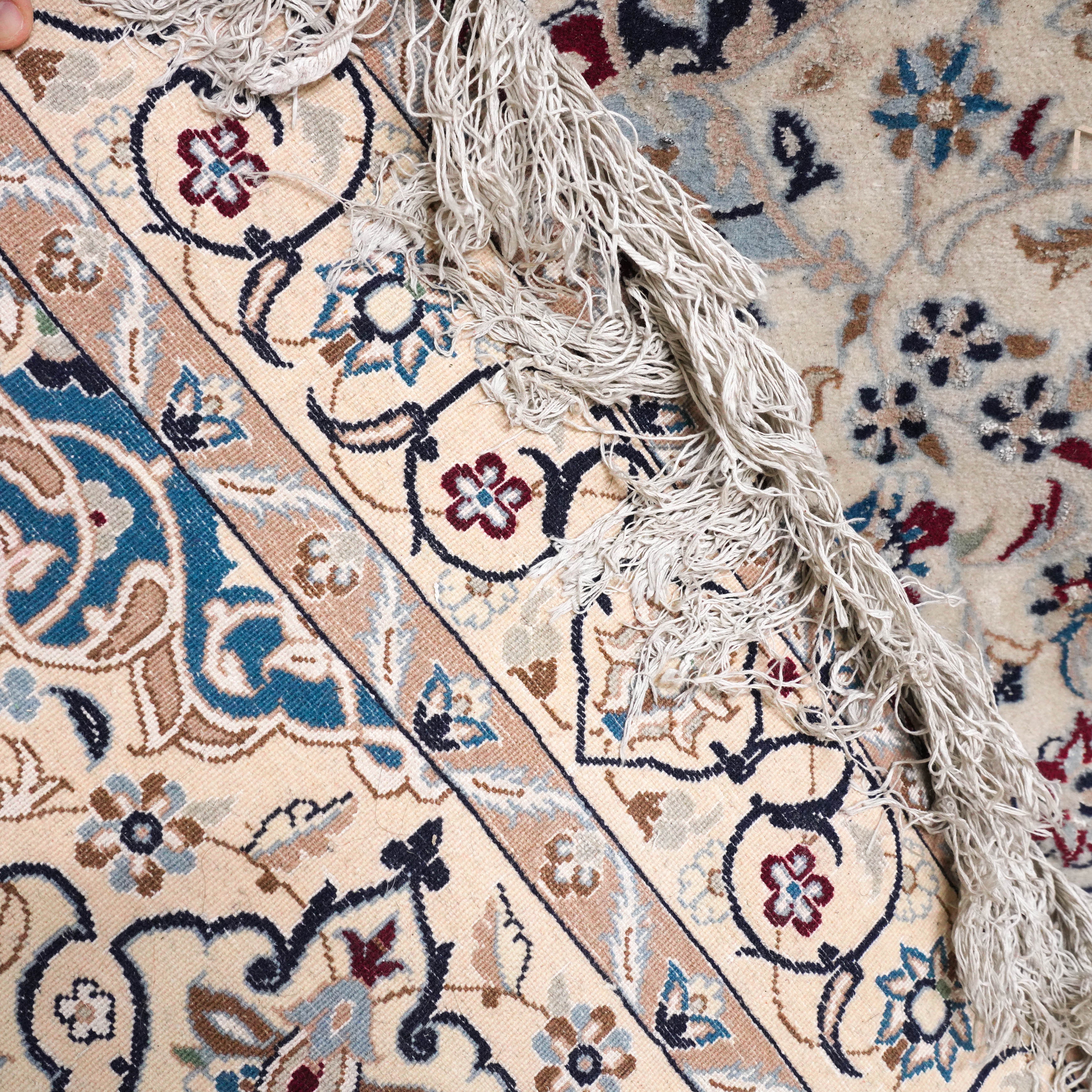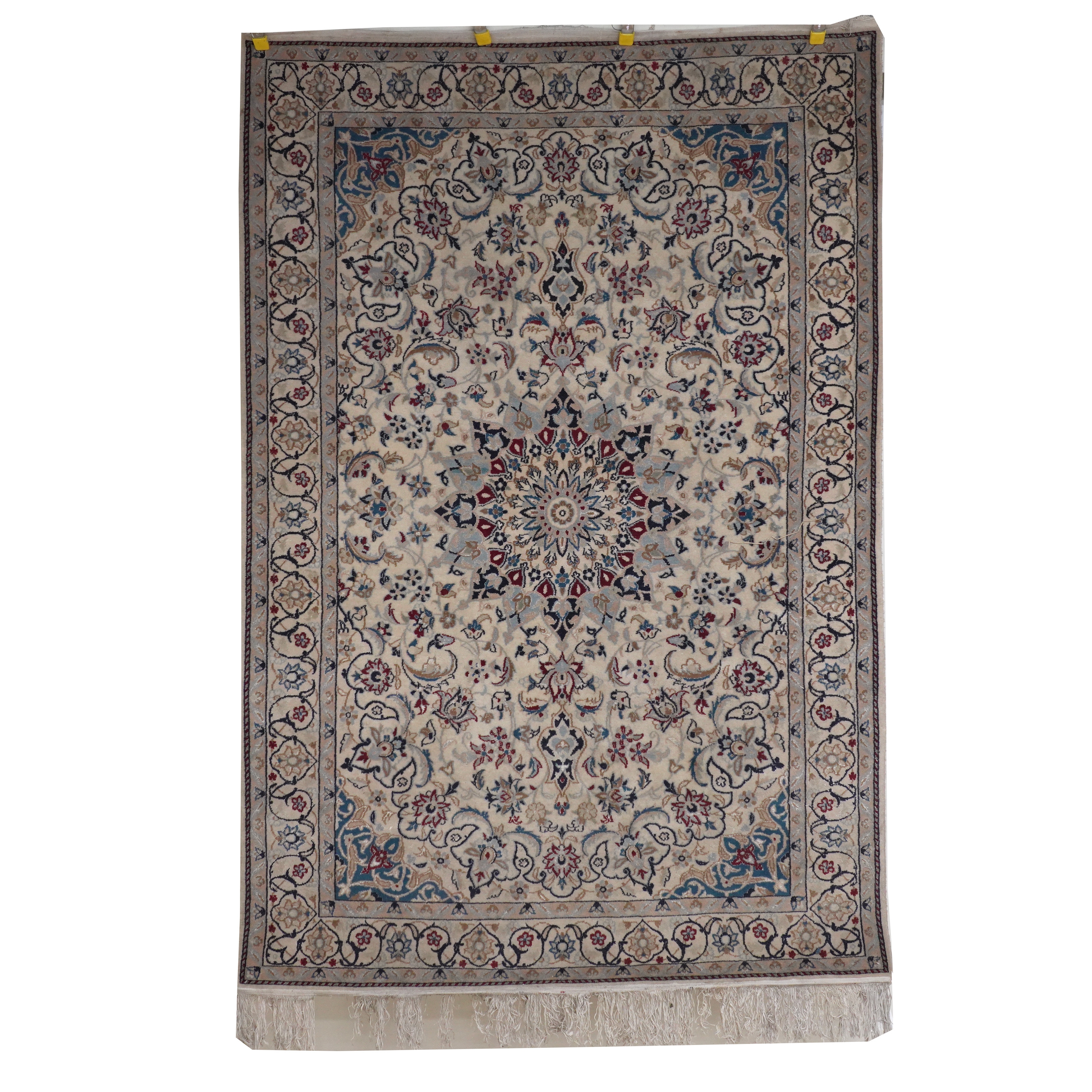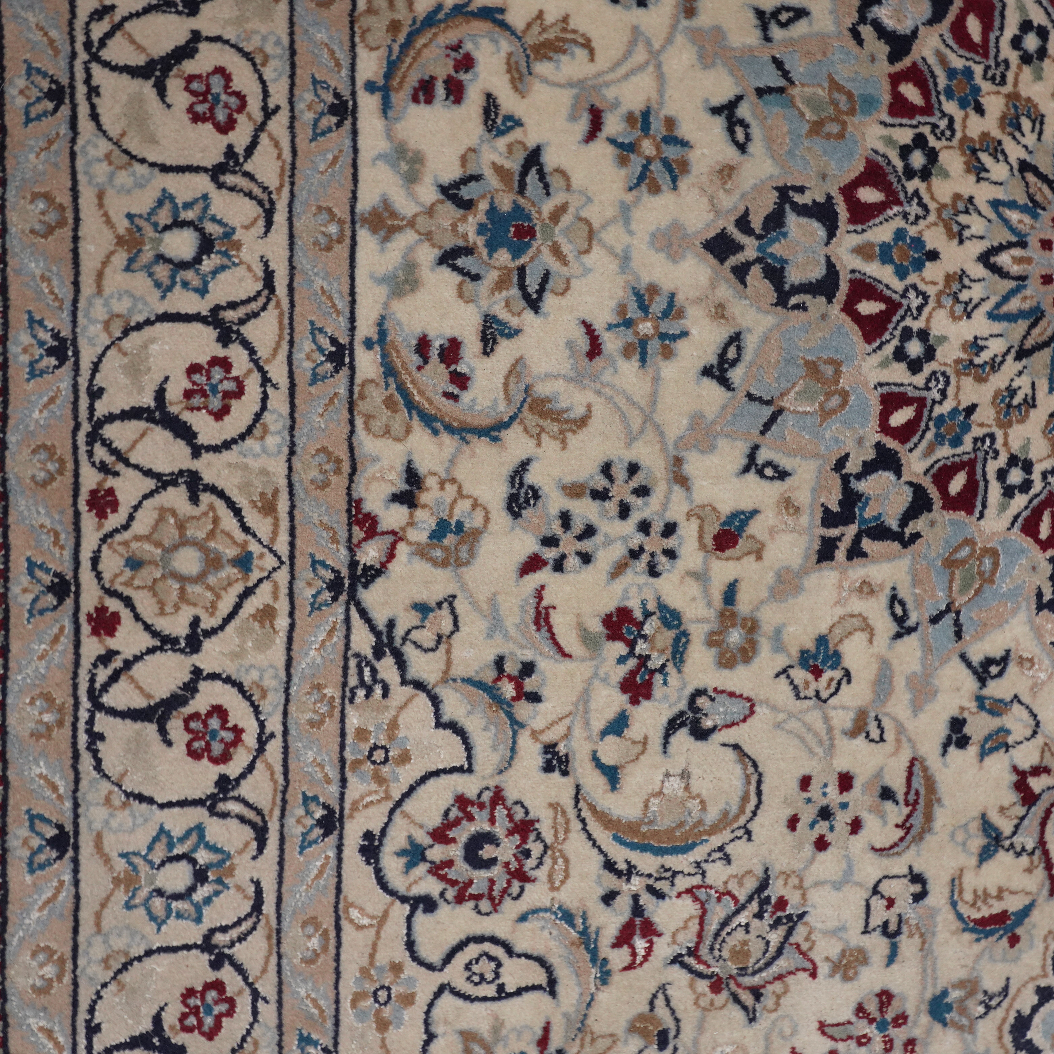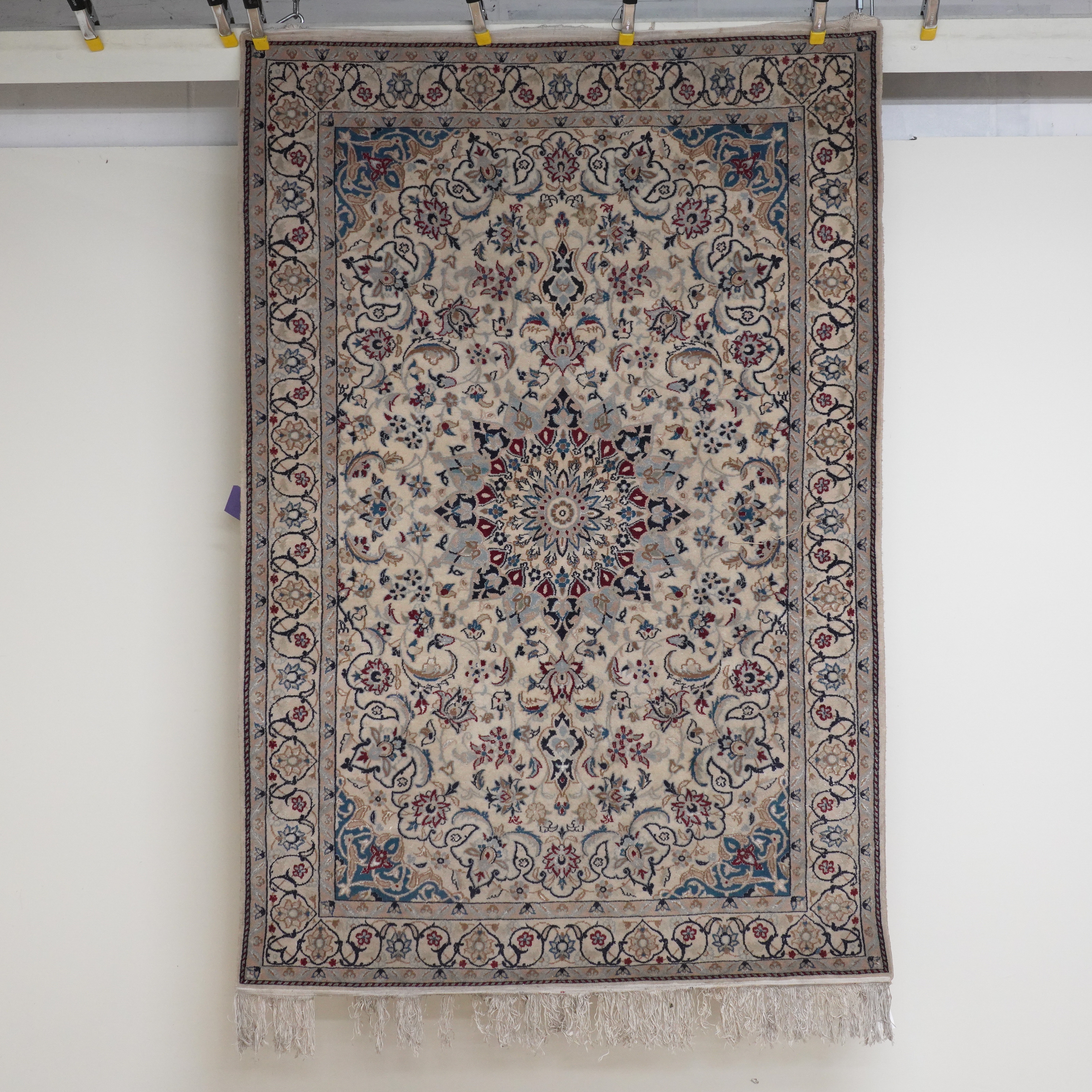 The ivory field with a faceted medallion, pale indigo spandrels all with floral sprays; an ivory palmette and scrolling vine border; 202cm x 135cm, circa 1970