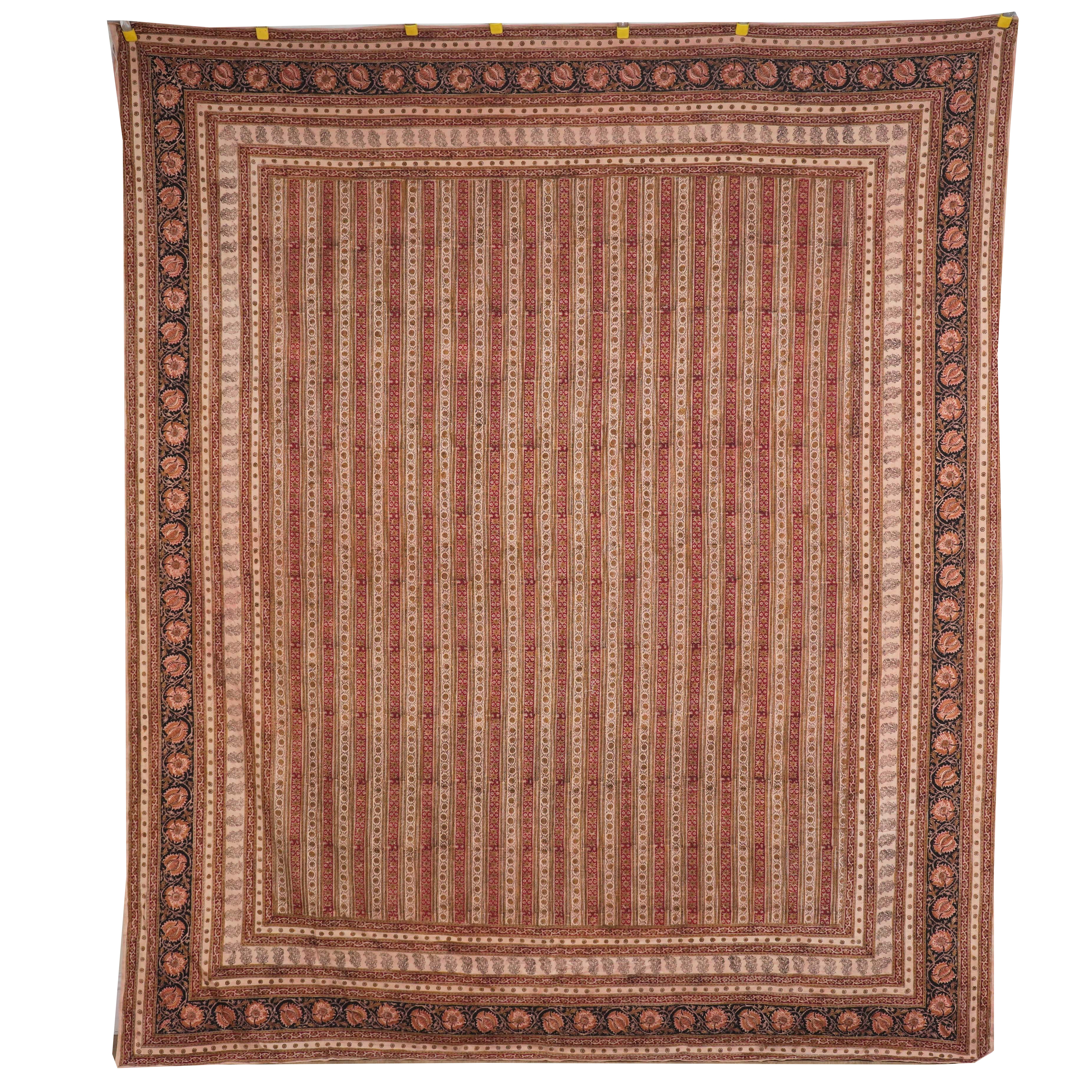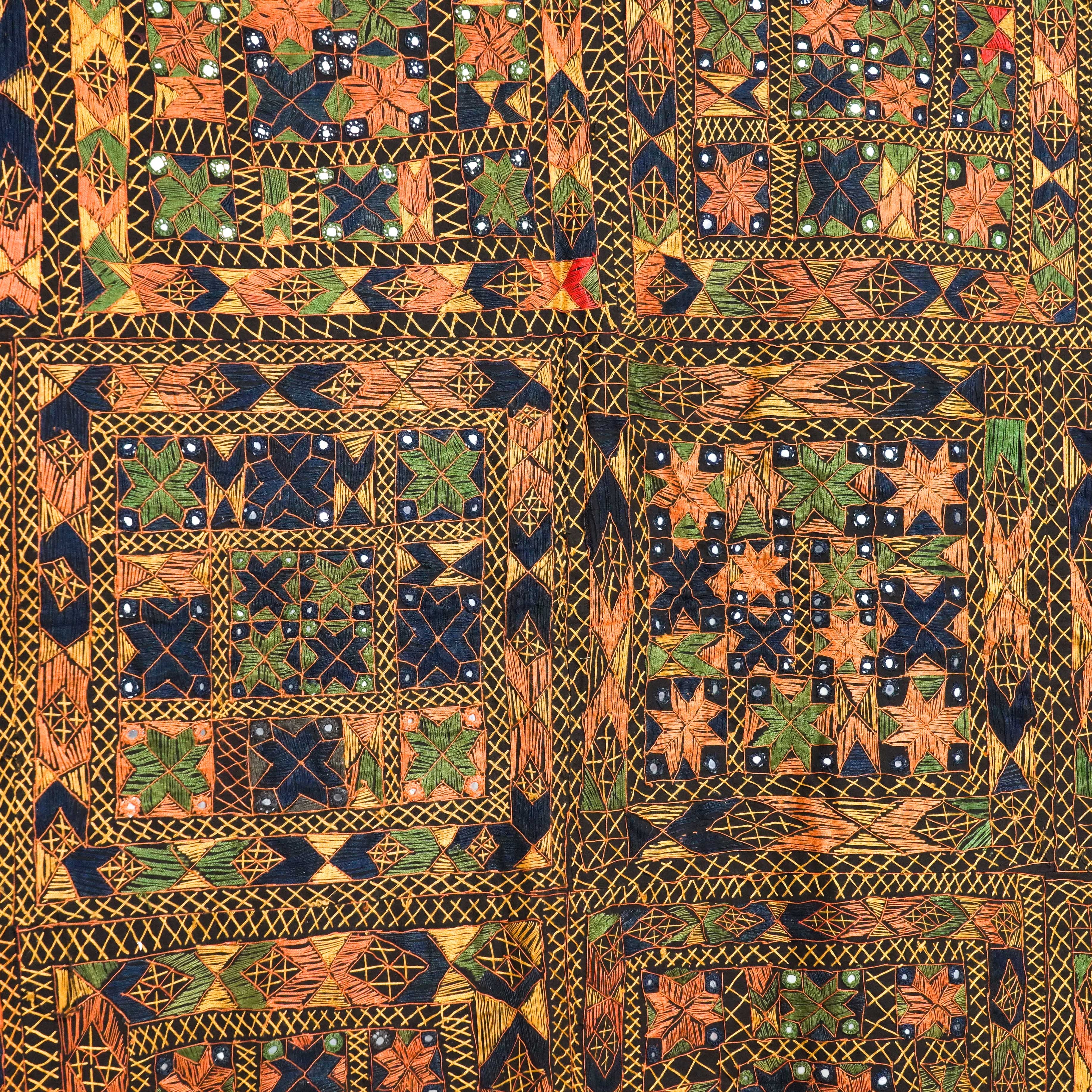 Five columns of six squares, each with star motifs, highlighted with mirror fragments in blue, orange, green and yellow; 218cm x 106cm, modern, together with an Indian block printed panel comprising madder and ivory bands of minor flowers, a black rosette border; 257cm x 223cm, modern