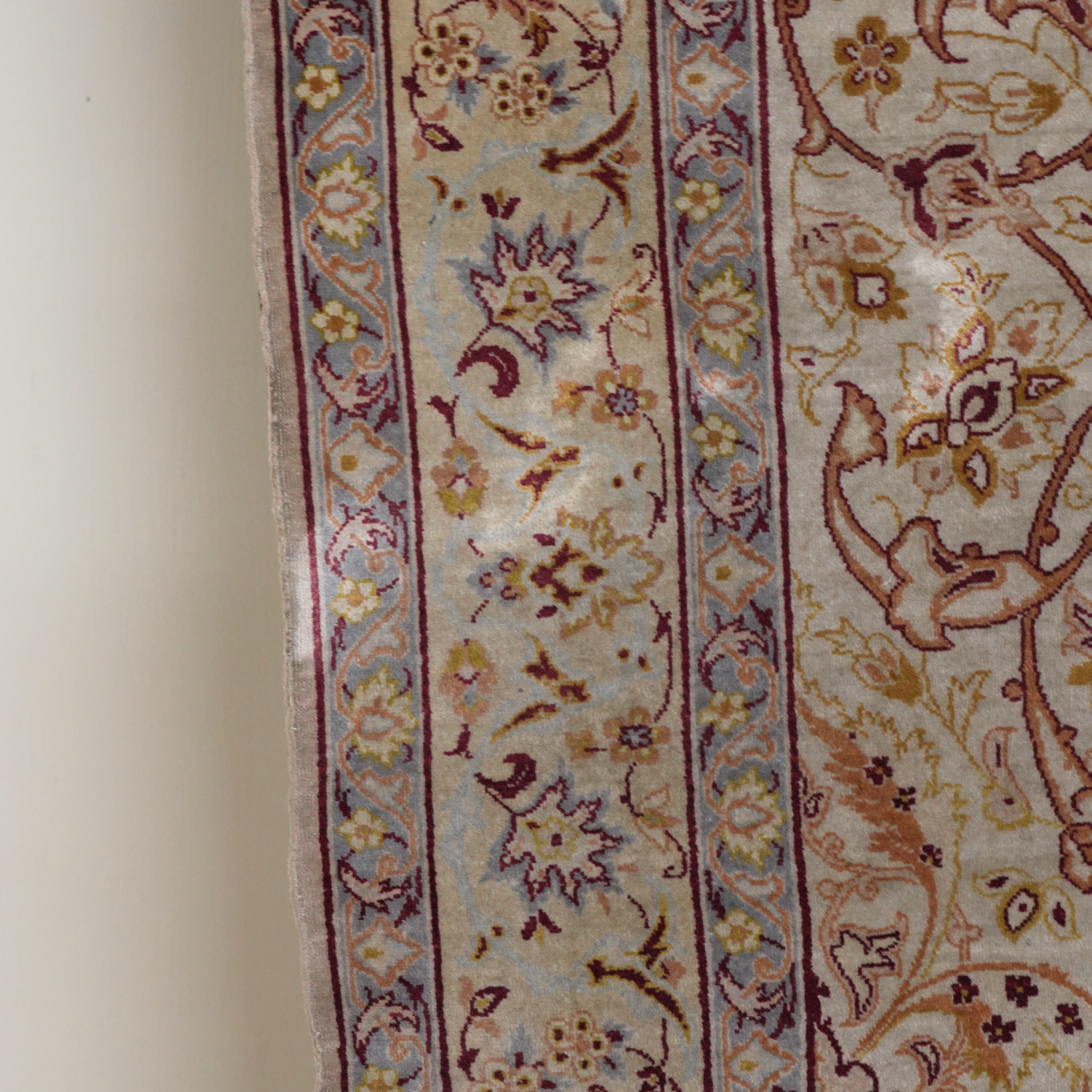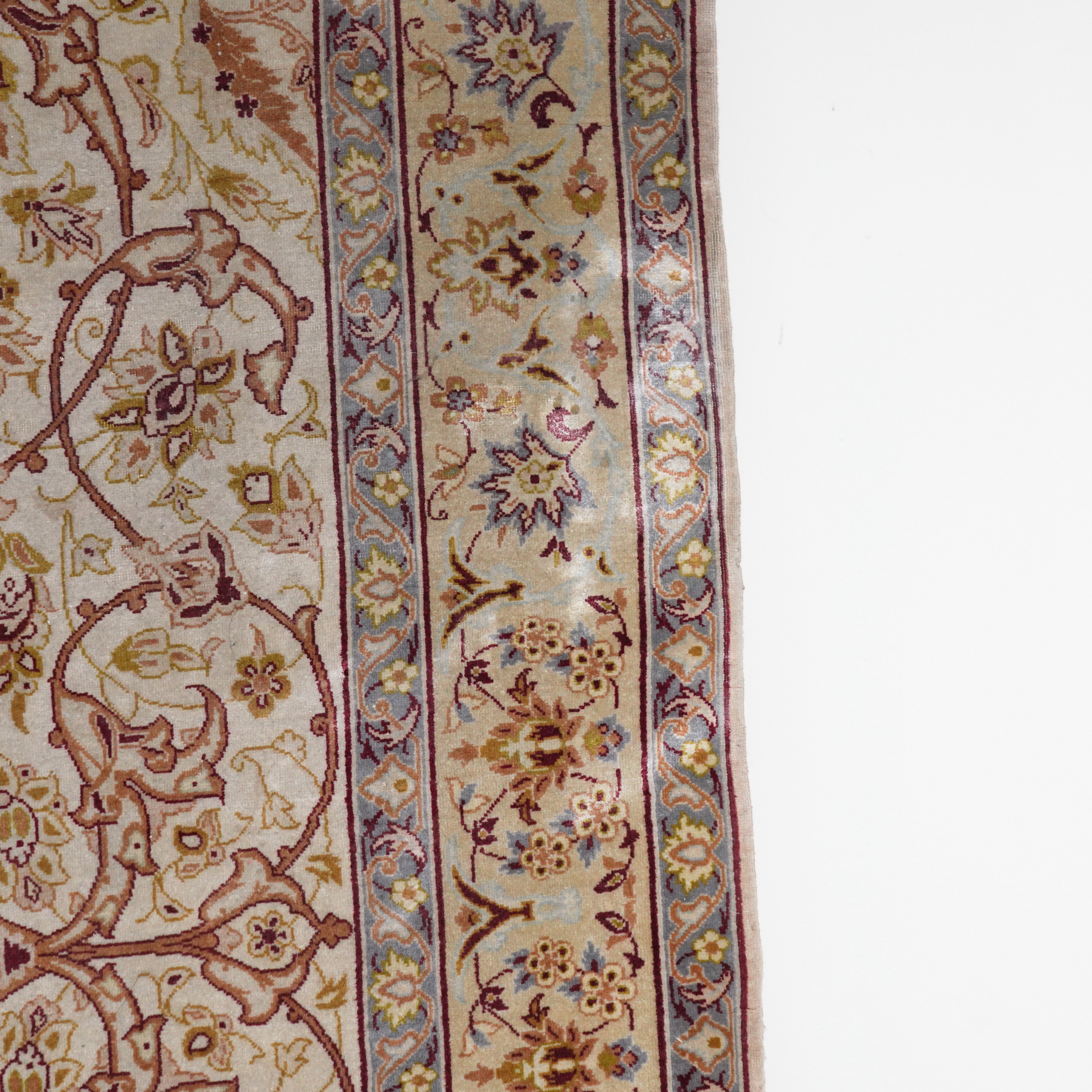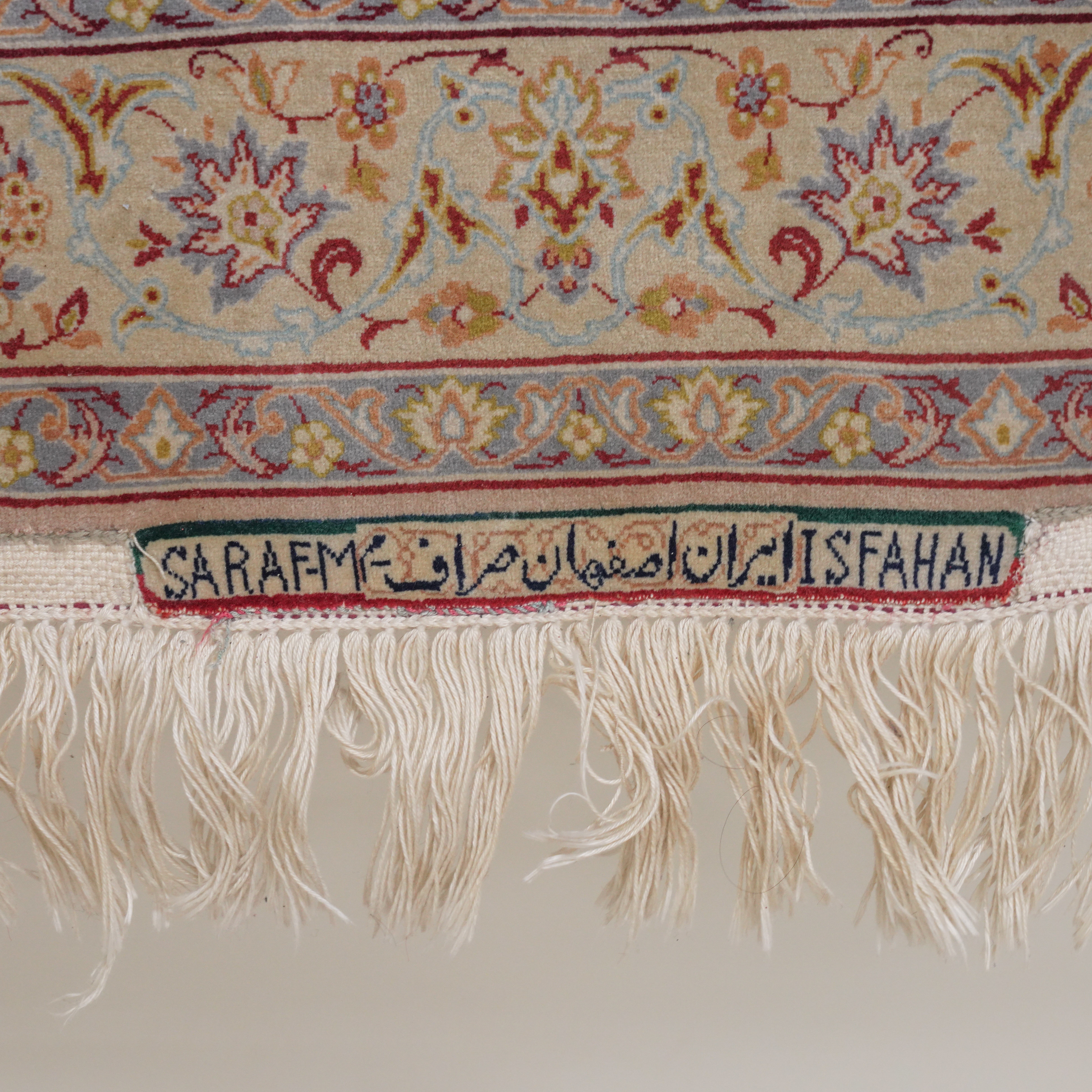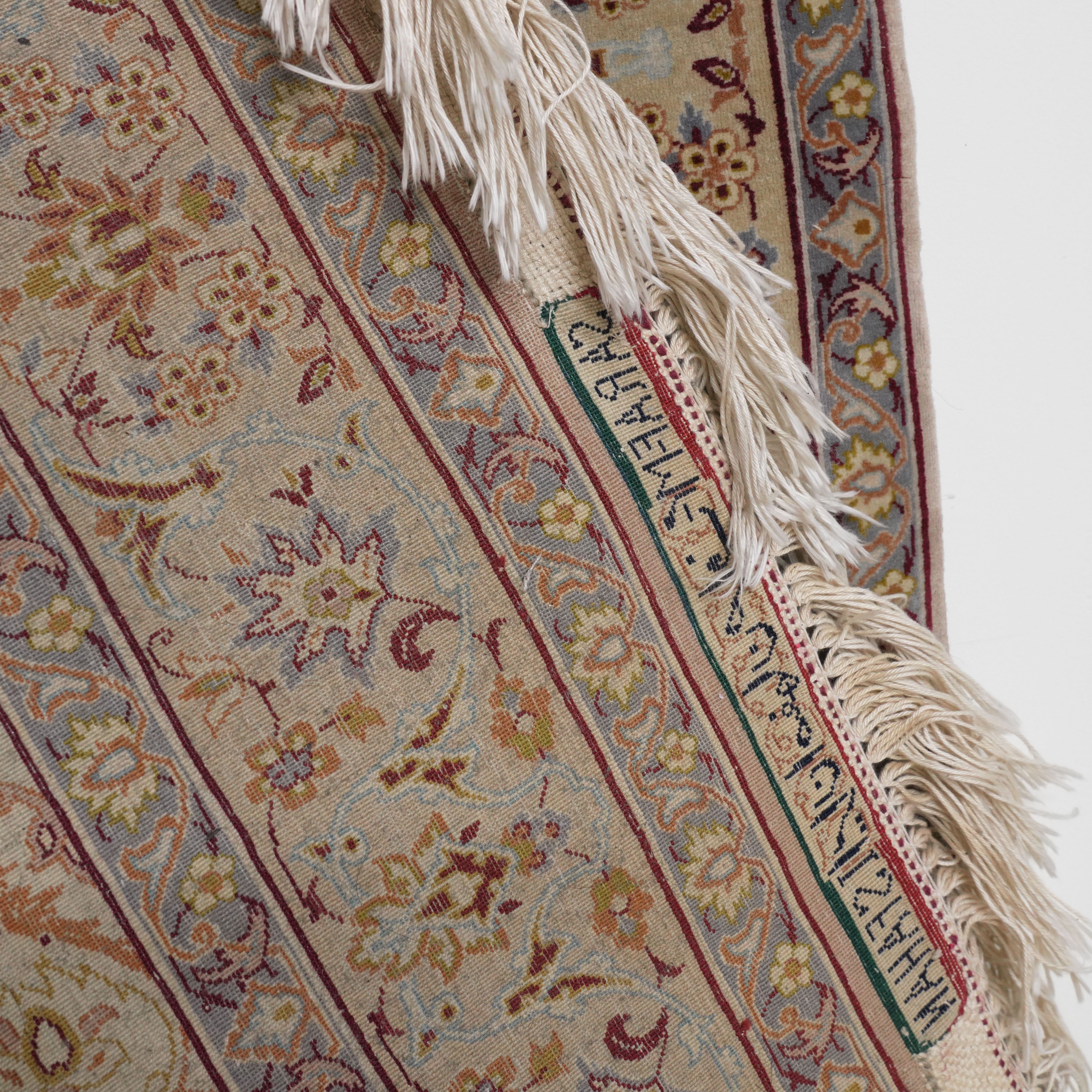 The cream field with a faceted medallion, corner spandrels all with intricate floral and curve linear sprays; a complementary border, signature panel; 166cm x 106cm, circa 1980s