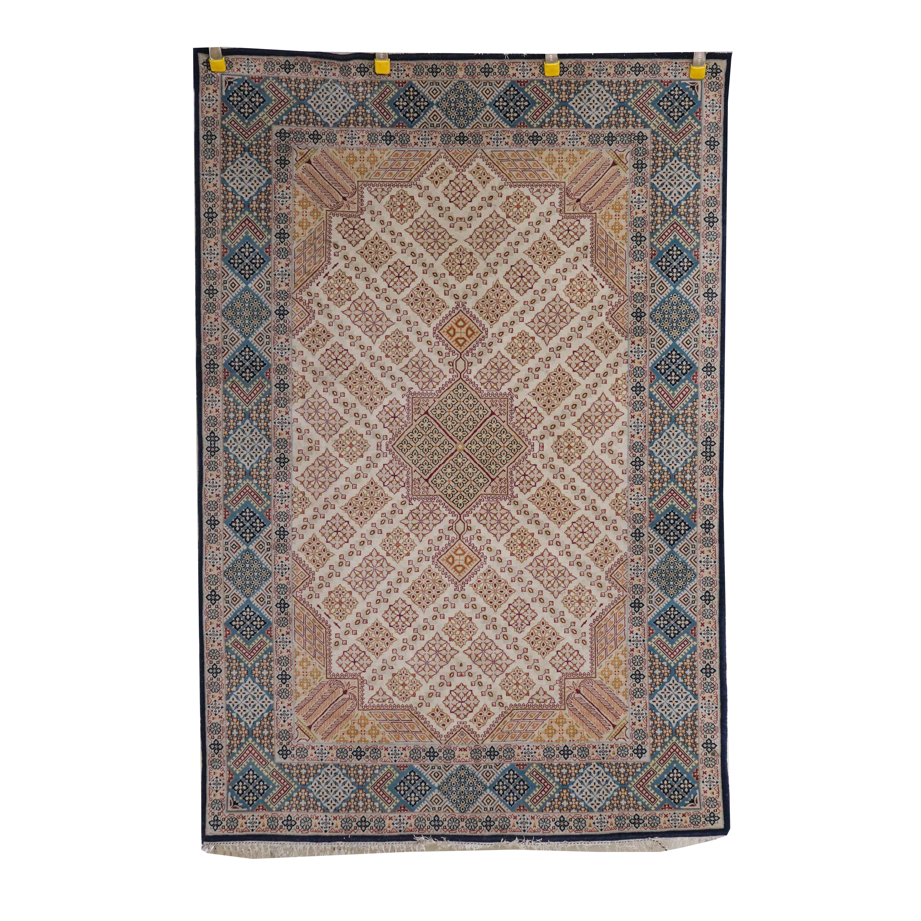 The ivory diamond flower head field with a star tiled medallion, willow tree spandrels; mid-indigo diamond flowered border; 160cm x 107cm, circa 1960
