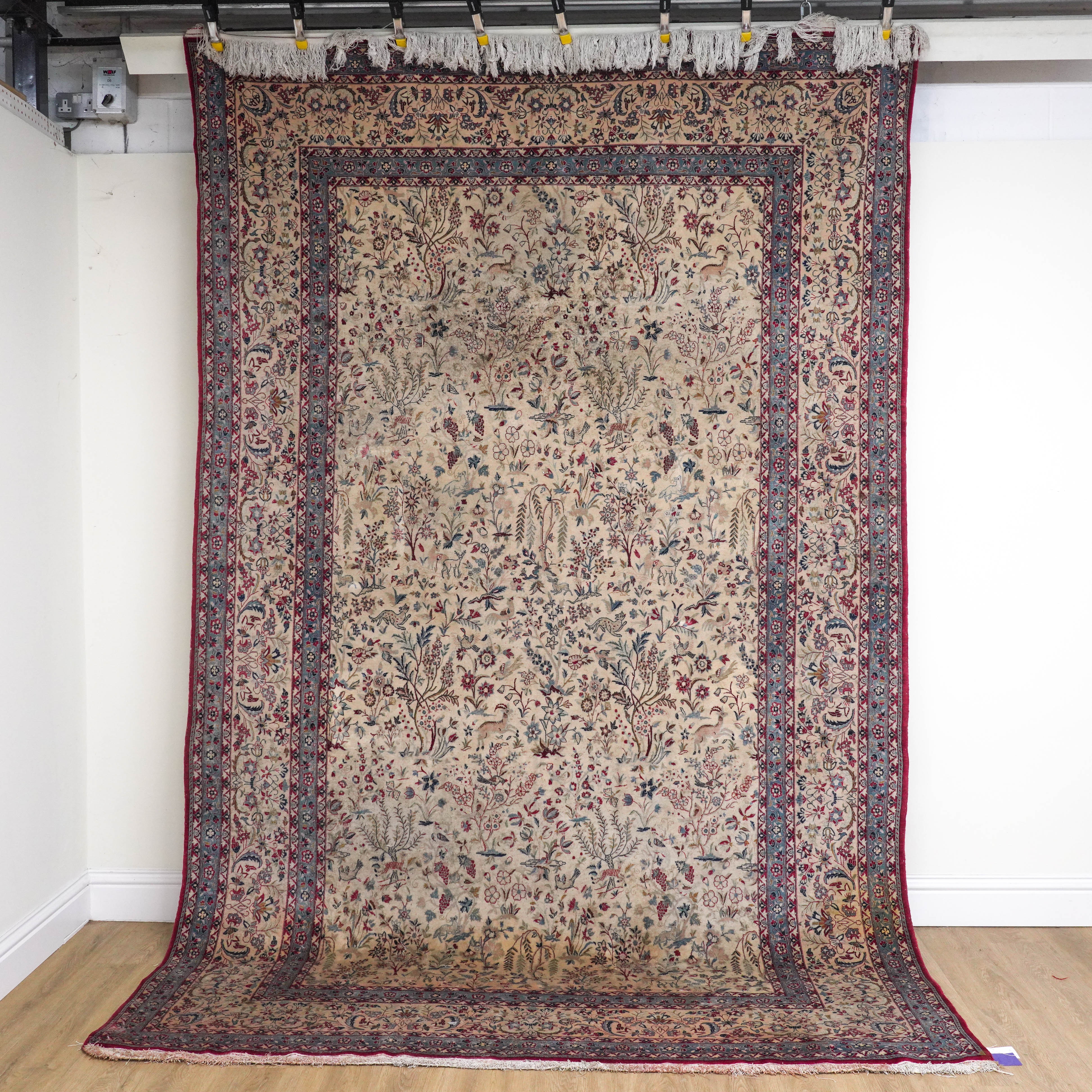 The ivory field with an all-over design of flowering trees and willows together with naturalistic animals and birds and flowering plants; a matching trailing flower border; 338cm X 218cm, circa 1950