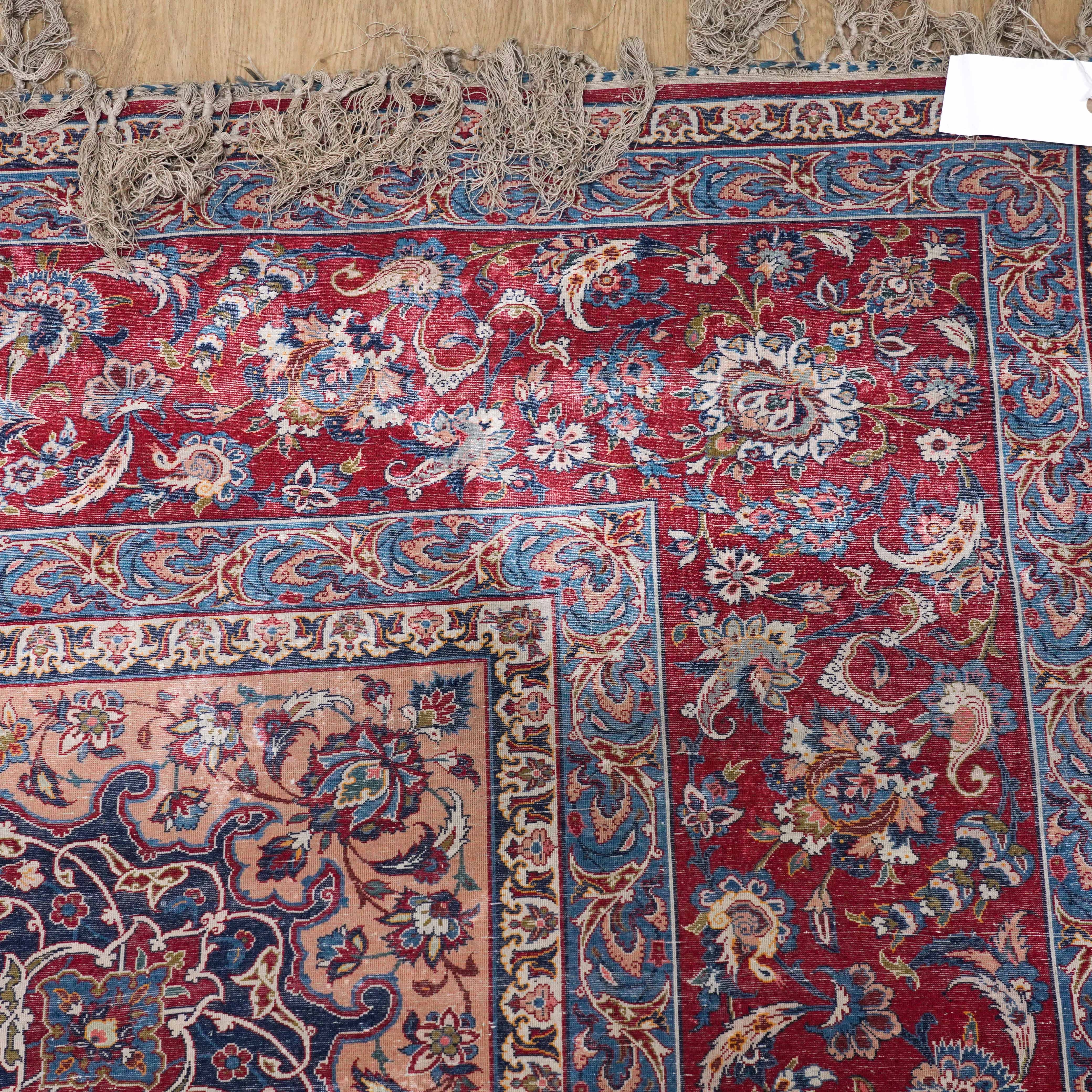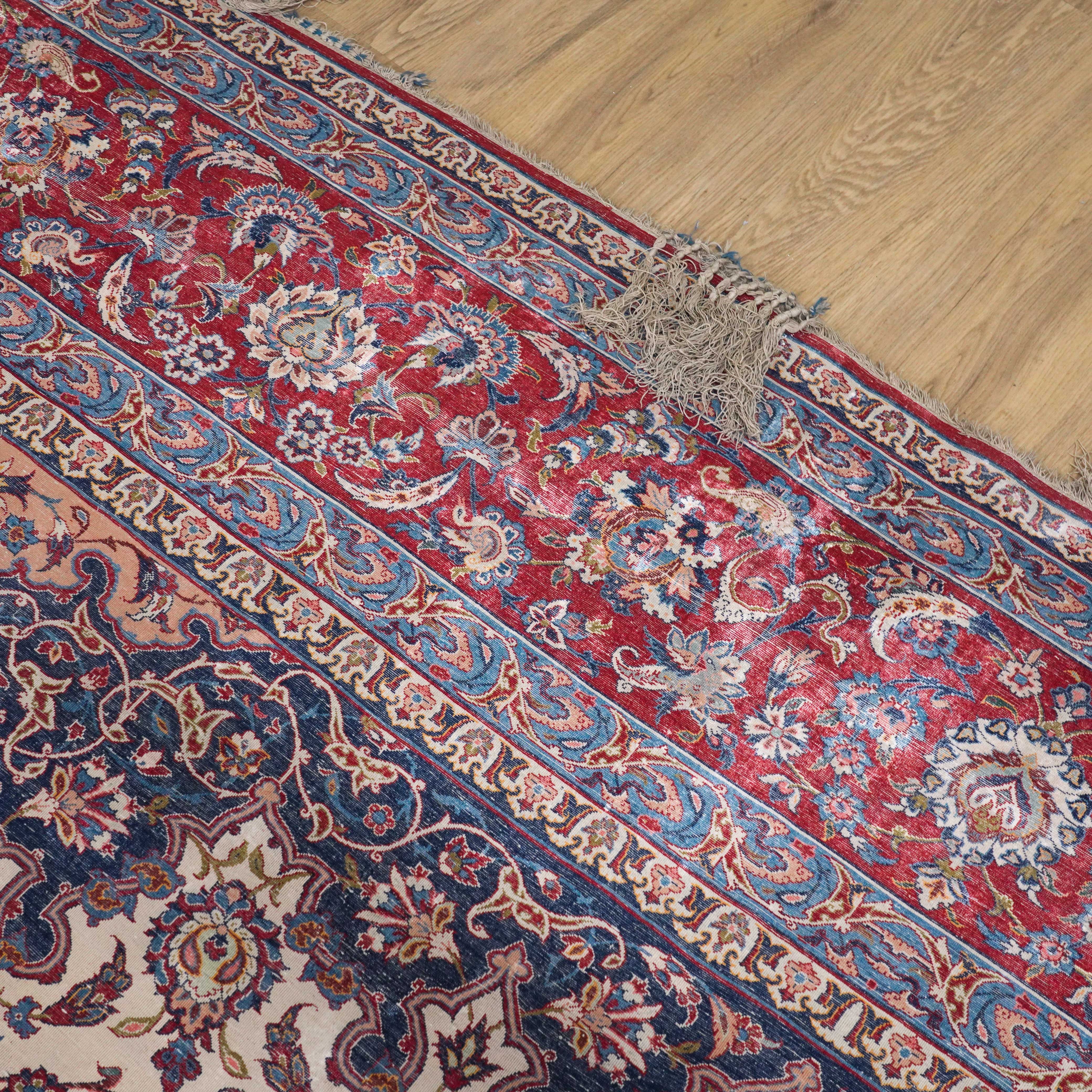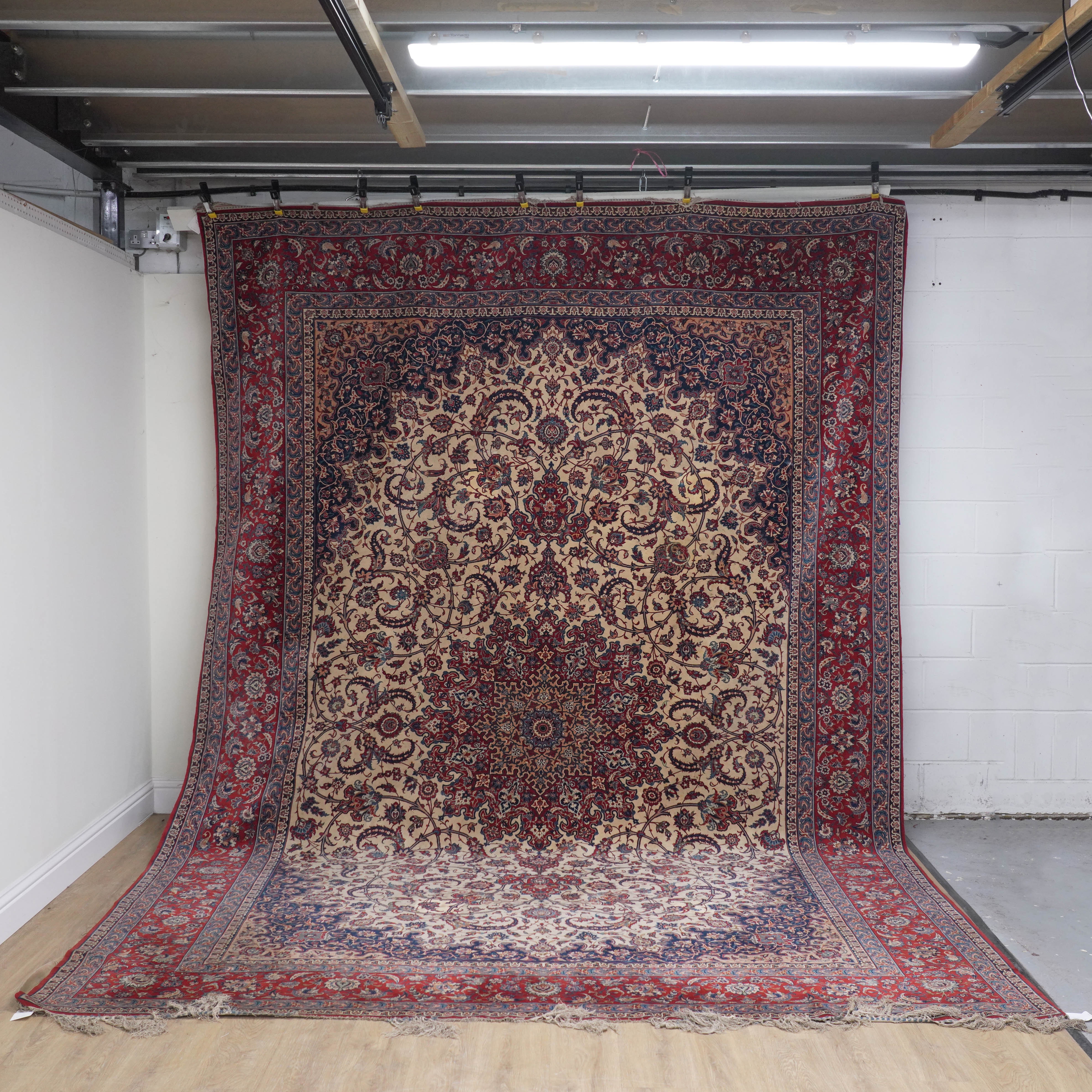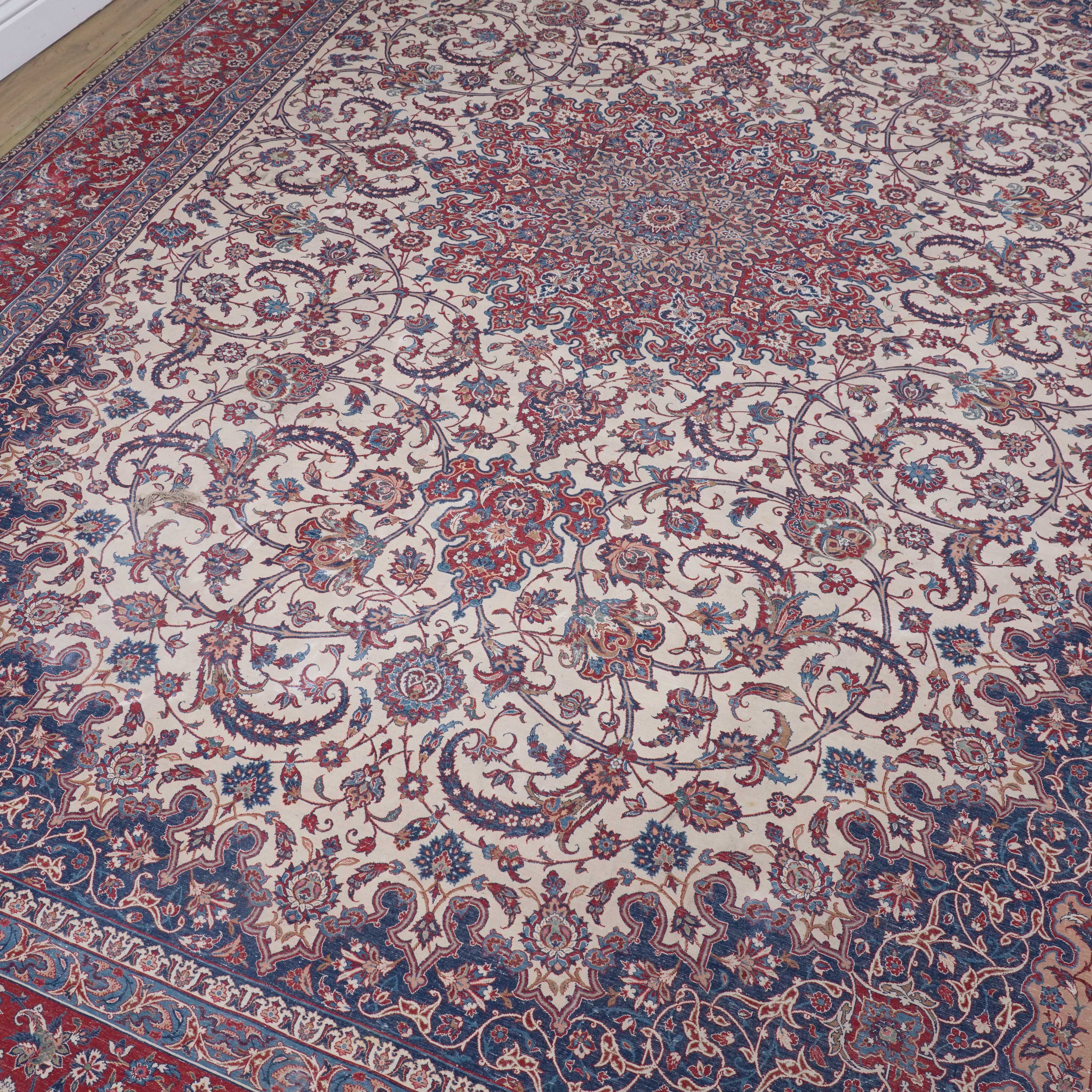 The ivory field with a bold madder faceted medallion, matching indigo spandrels, all with abundantly floral curve linear sprays; a madder palmette and floral spray border; 438cm x 310cm, circa 1940s/1950s