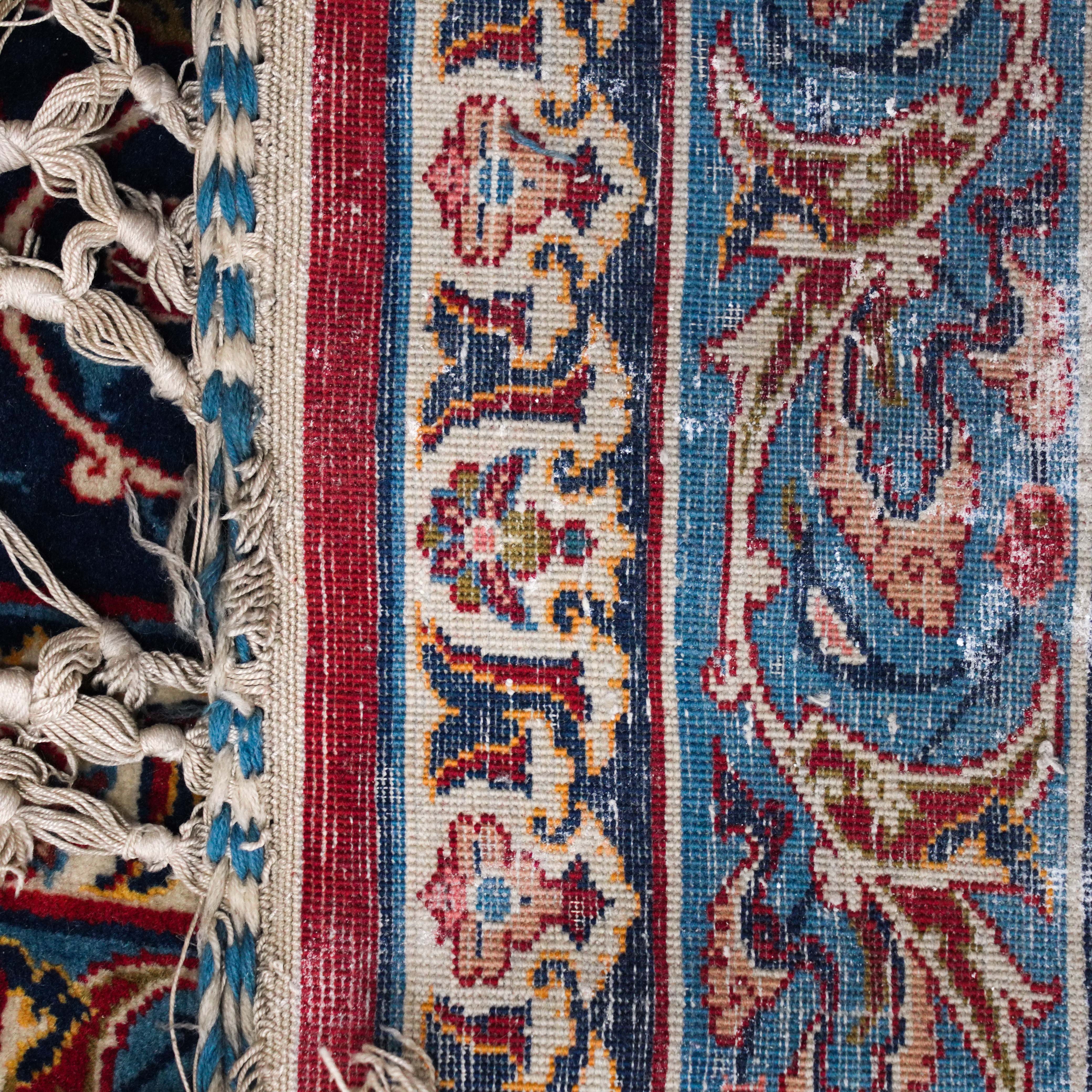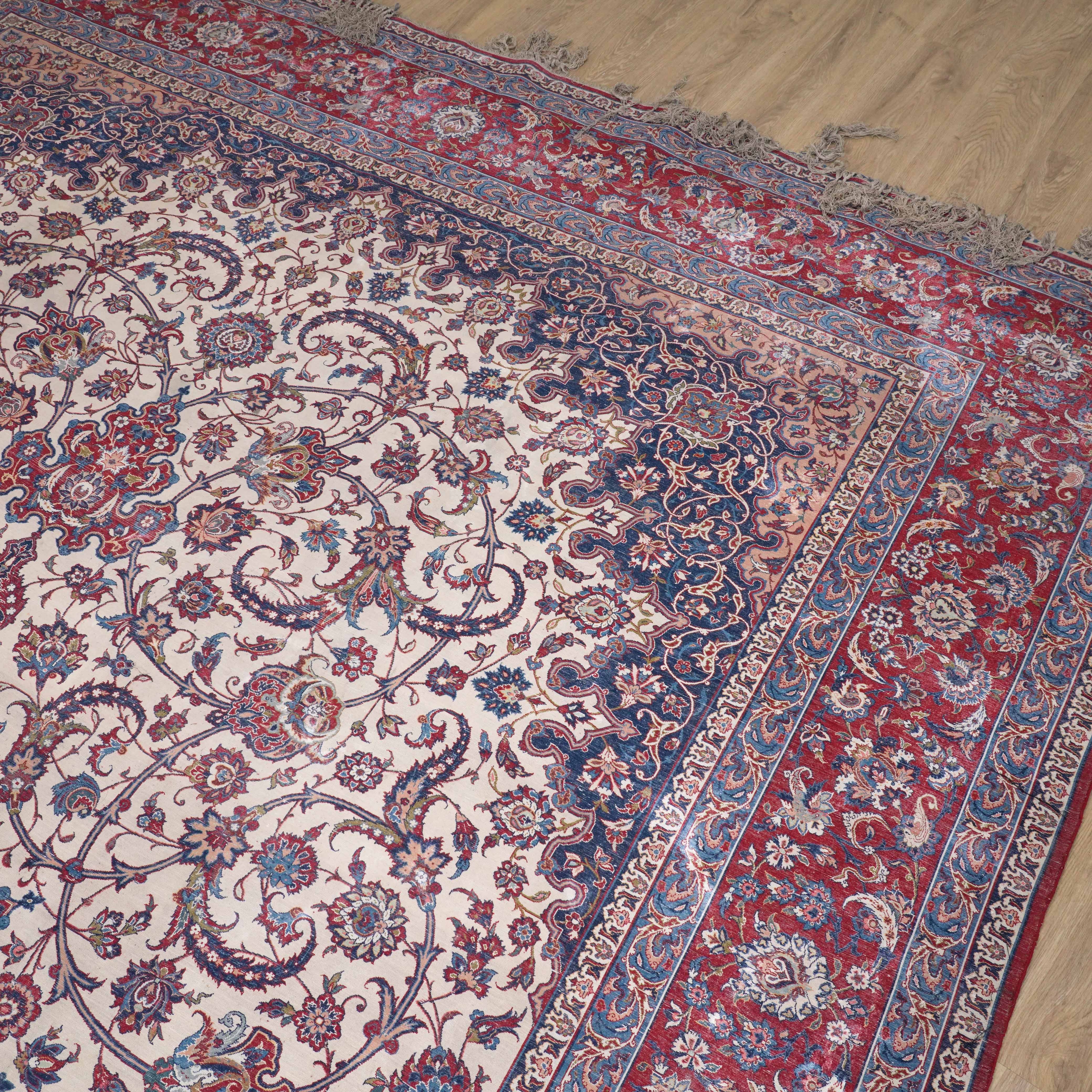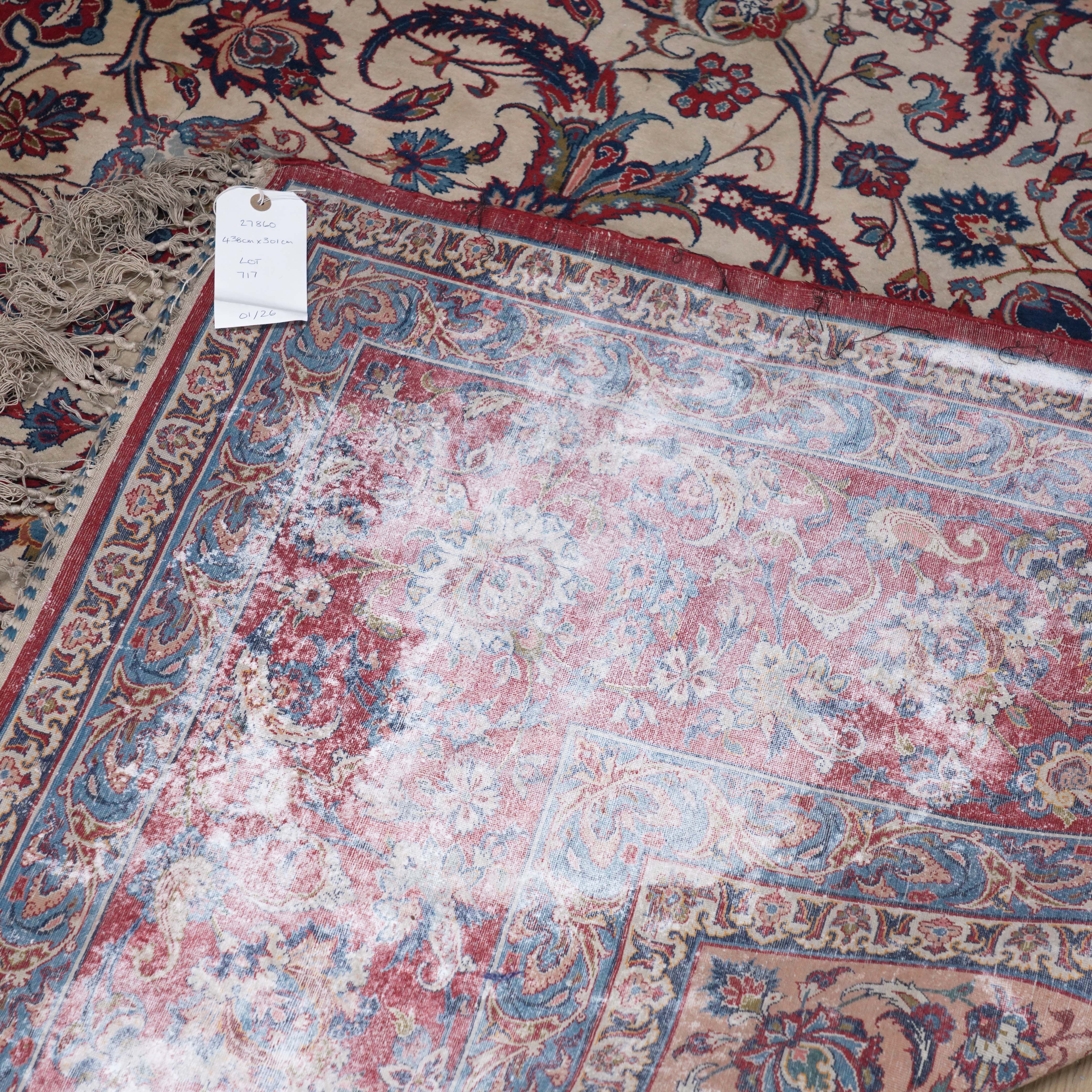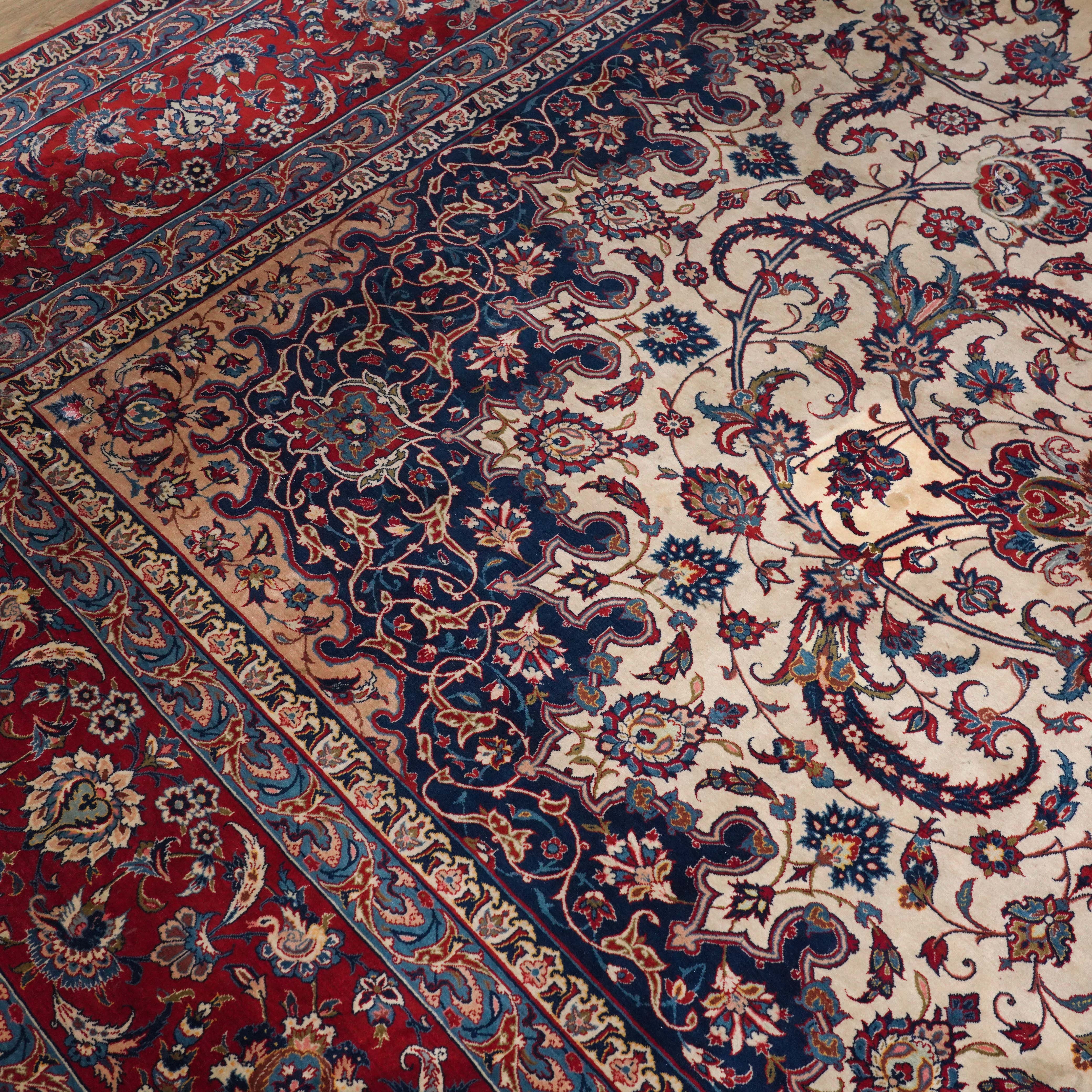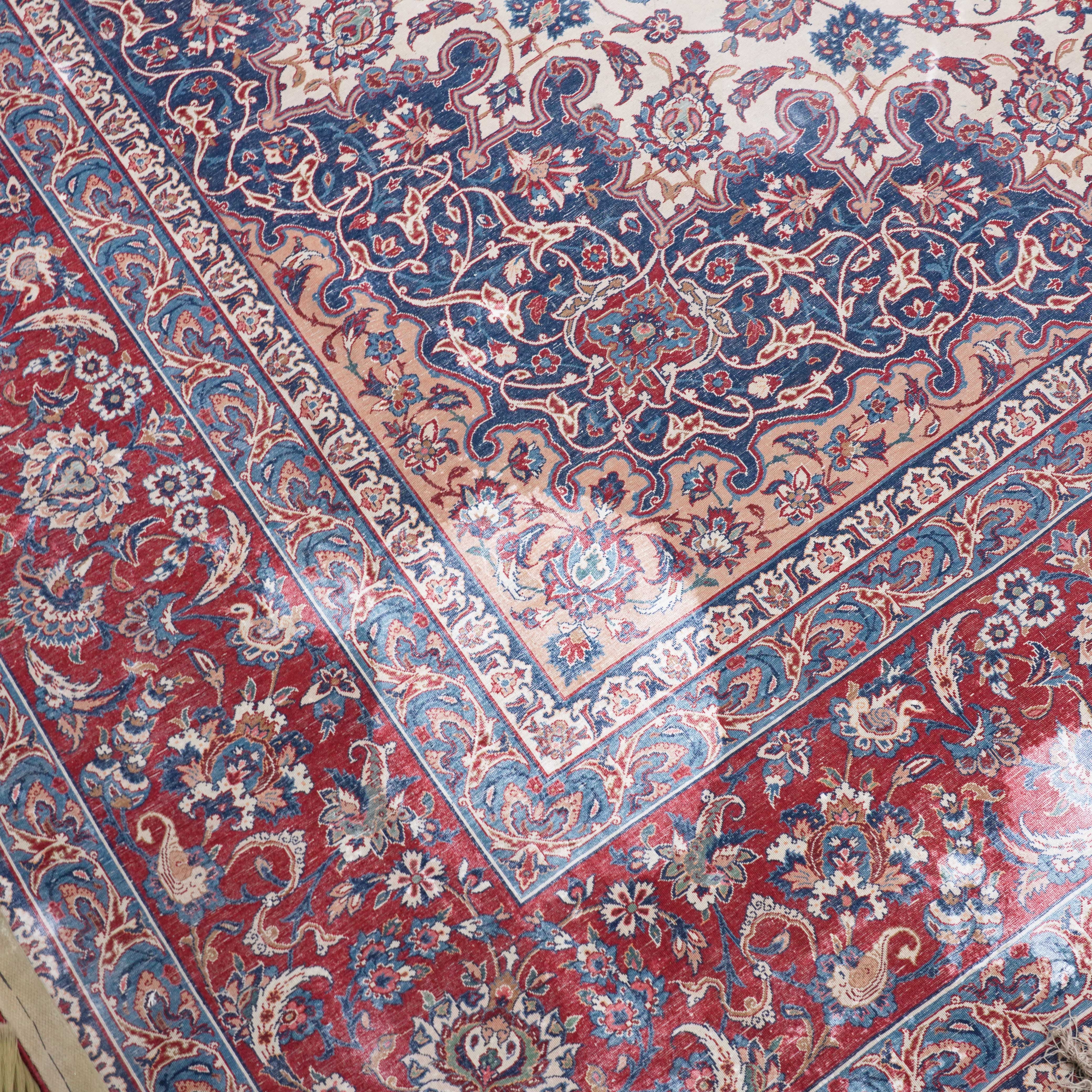 The ivory field with a bold madder faceted medallion, matching indigo spandrels, all with abundantly floral curve linear sprays; a madder palmette and floral spray border; 438cm x 310cm, circa 1940s/1950s