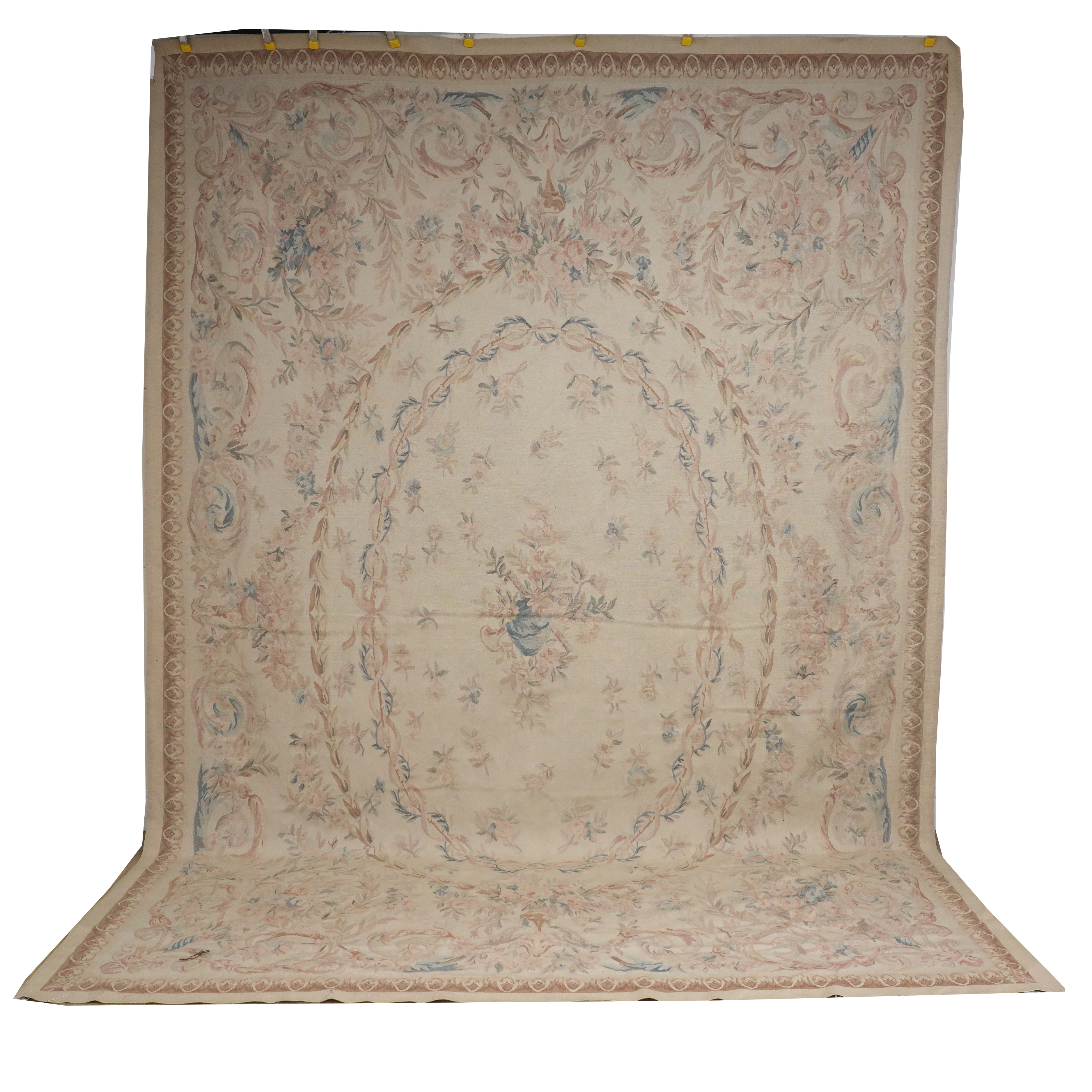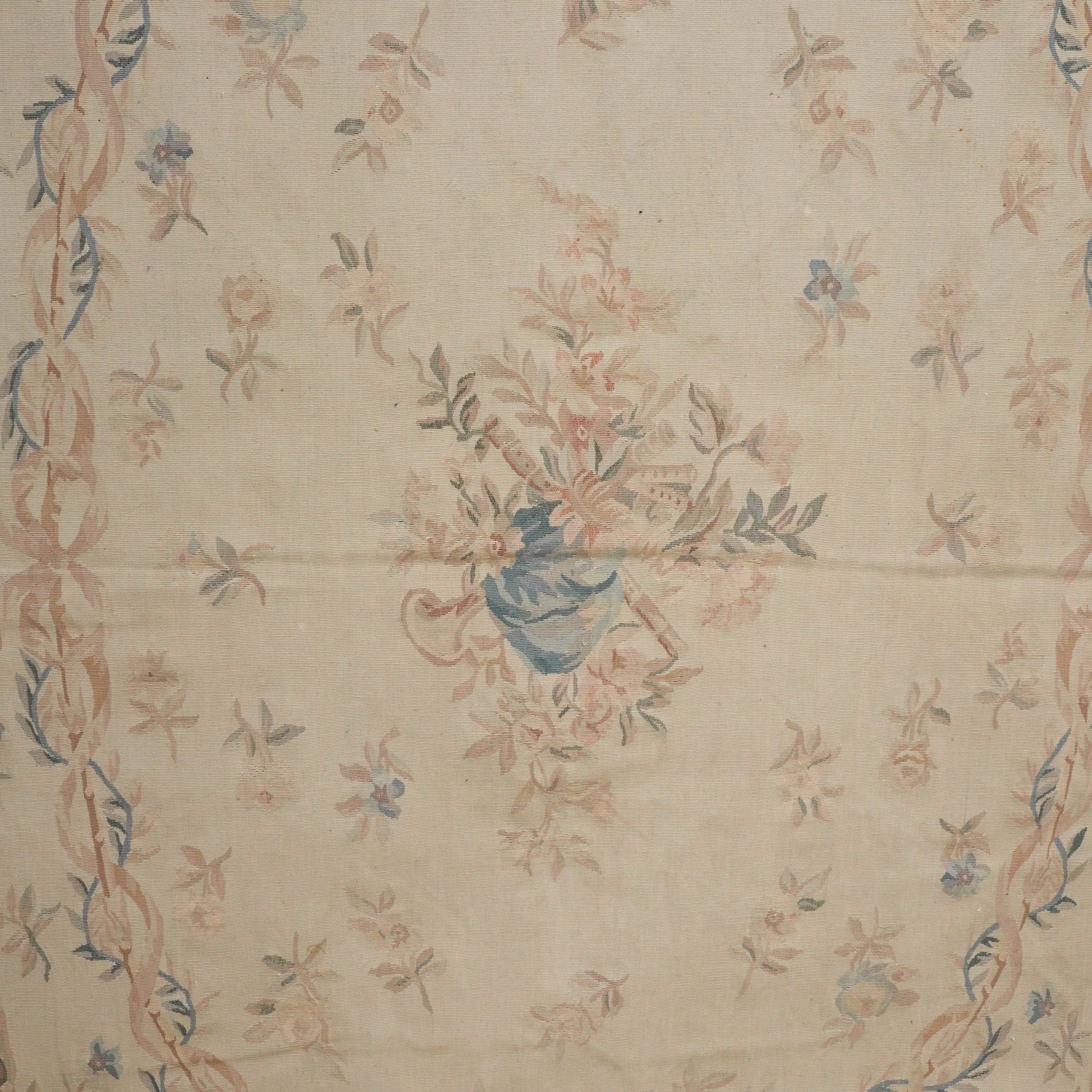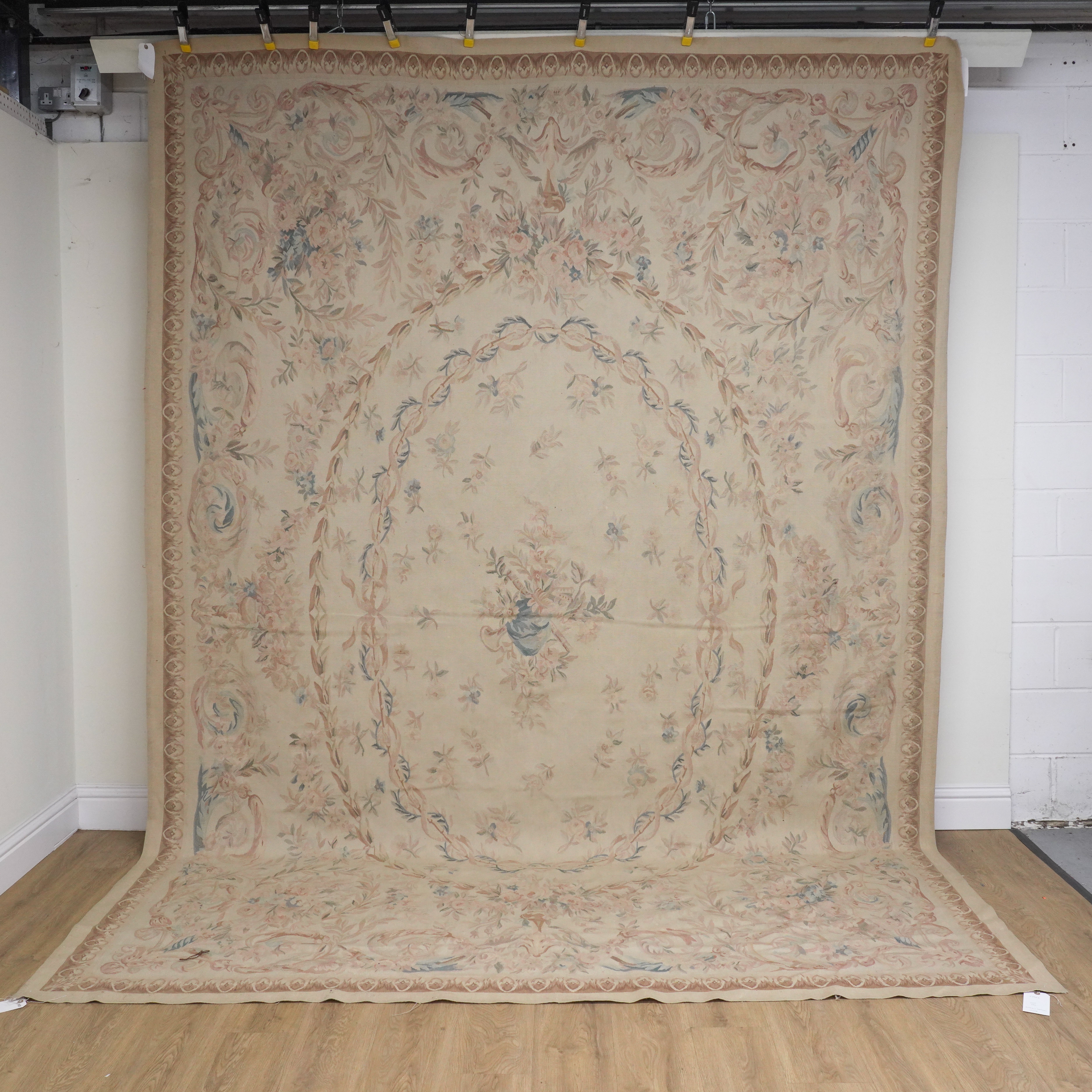 The carpet is of Aubusson design. The pale brown field with a central design of flowers and instruments, two sets of garlands and other naturalistic floral sprays; an outer surround of leaf sprays; 373cm x 265cm, circa late 20th century