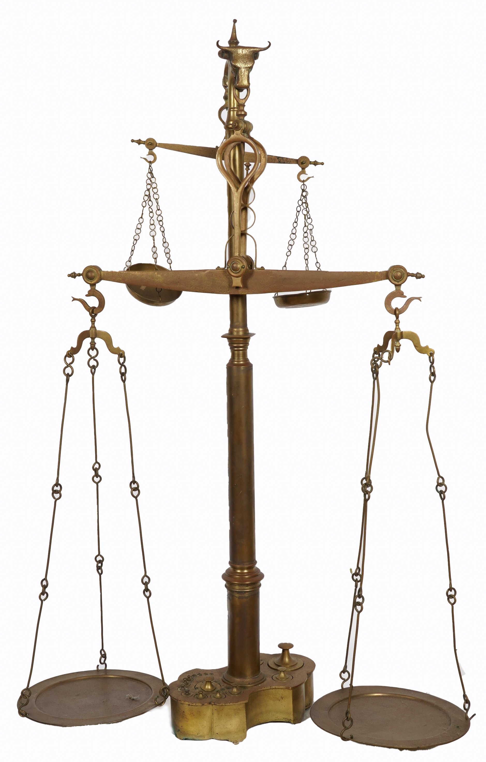 A SET OF PORTUGUESE BRASS BUTCHER'S FLOOR-STANDING SCALES AND WEIGHTS