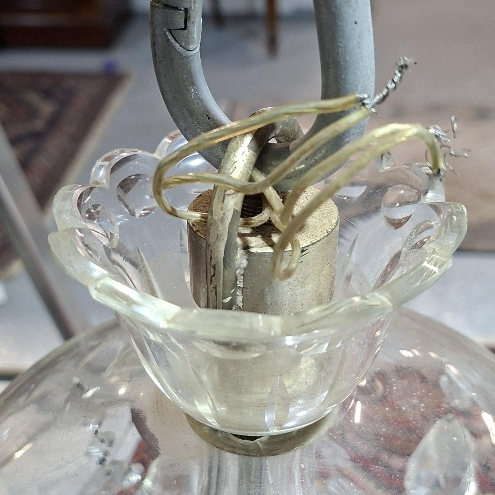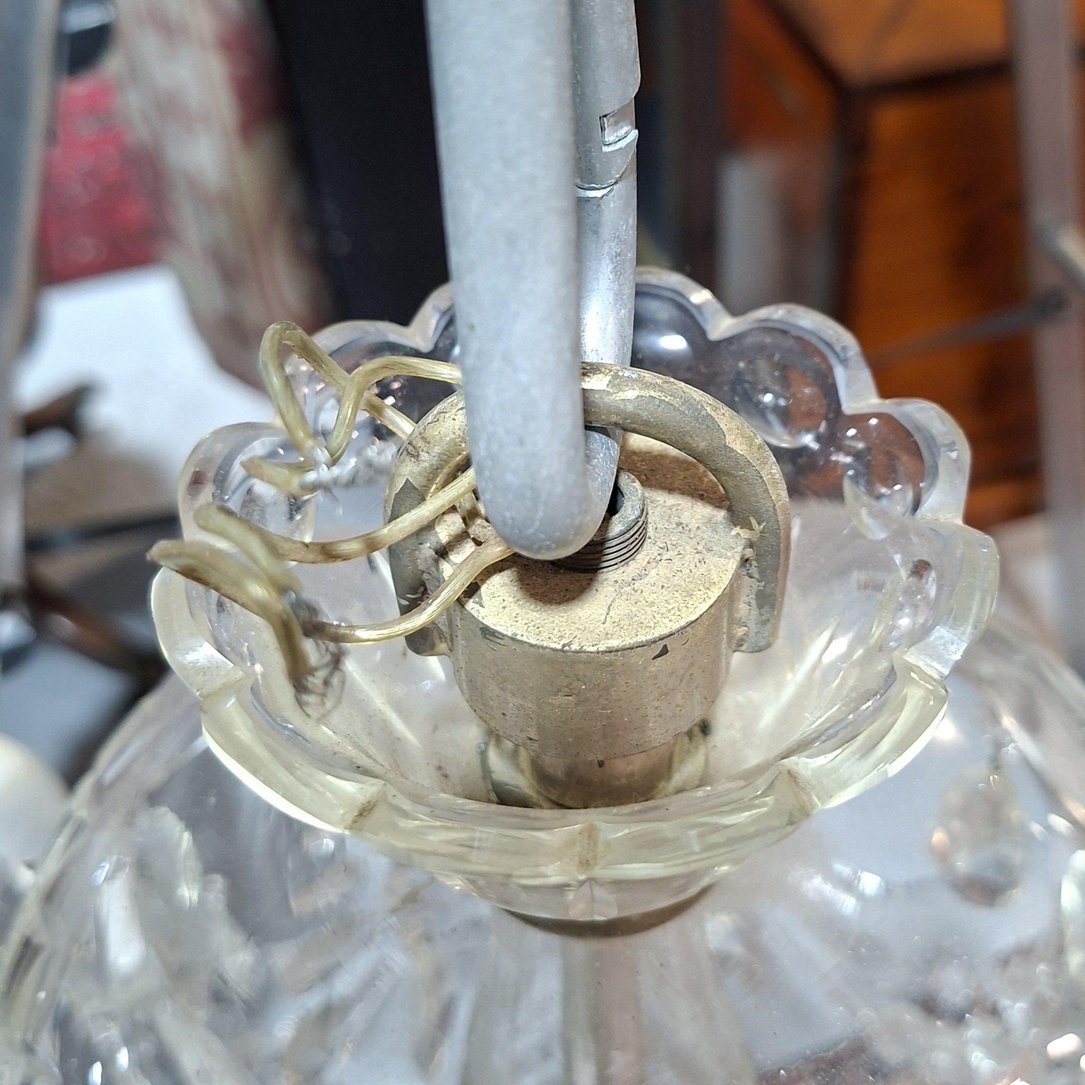With canopy hung with pendant drops, S-scroll arms above tiered descending drops with faceted ball finial, 68cm wide approx. x 90cm high