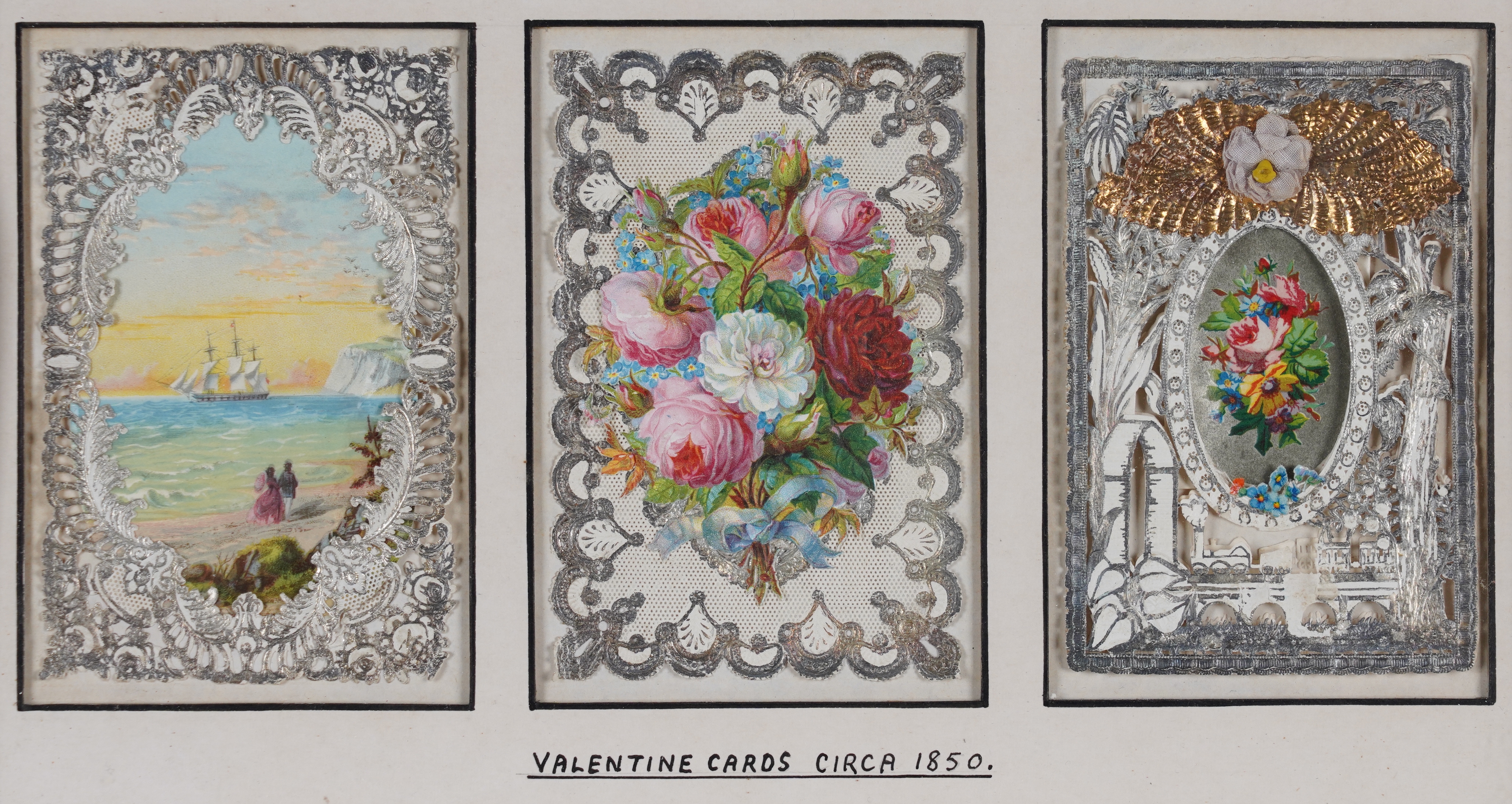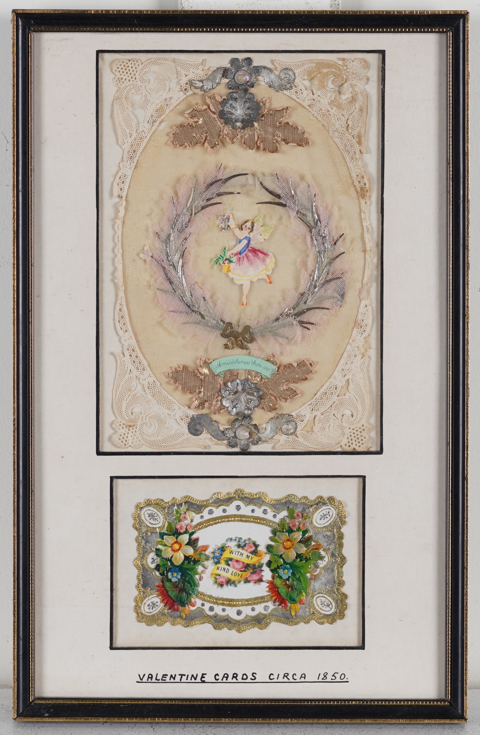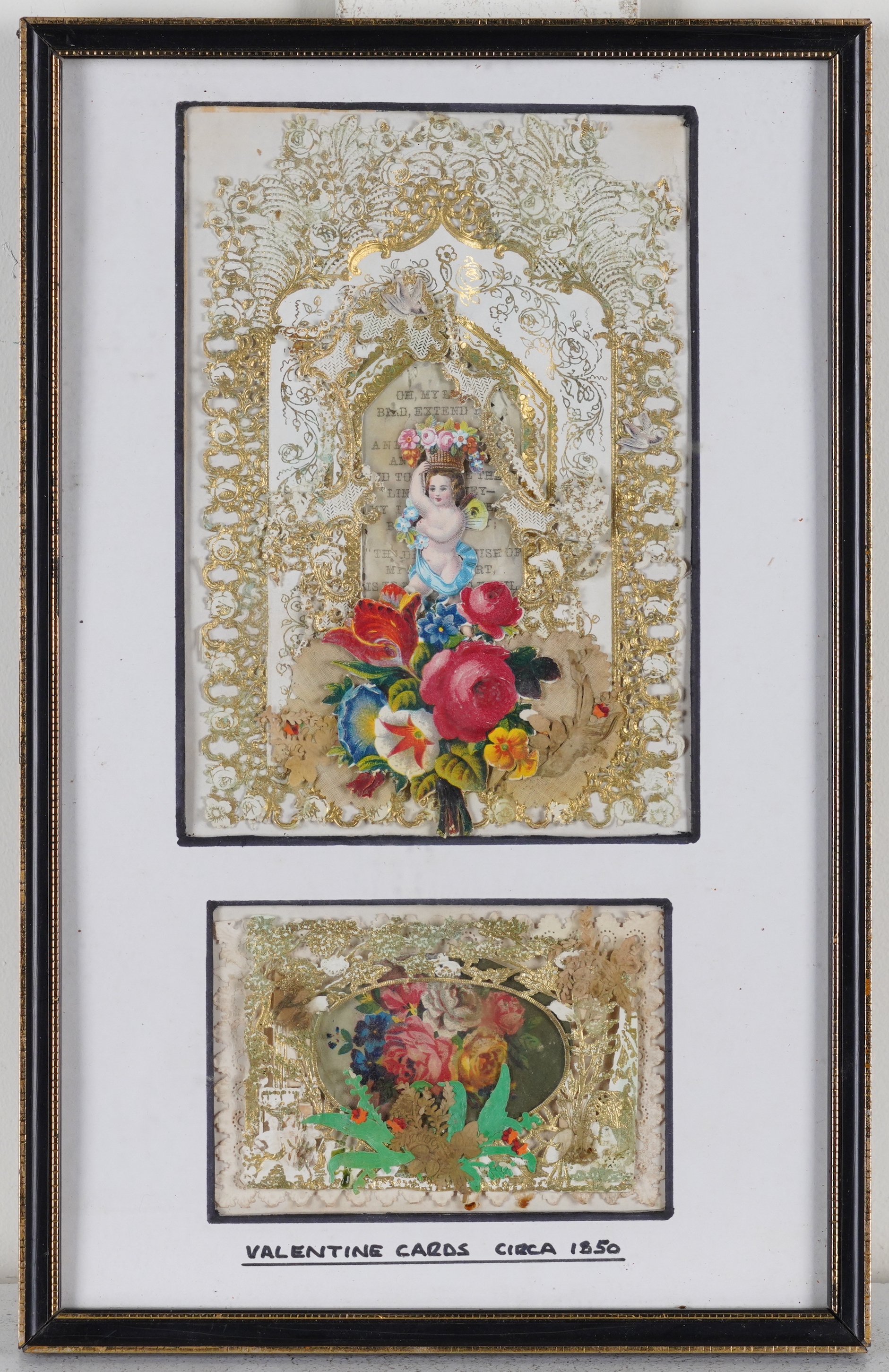 The cards variously constructed using paper lace, painted panels, cutwork details, decoupage and gold-leaf decoration, attributed verso to Mansell, Meek, Windsor and Mullord Brothers, each frame 32cm x 20cm