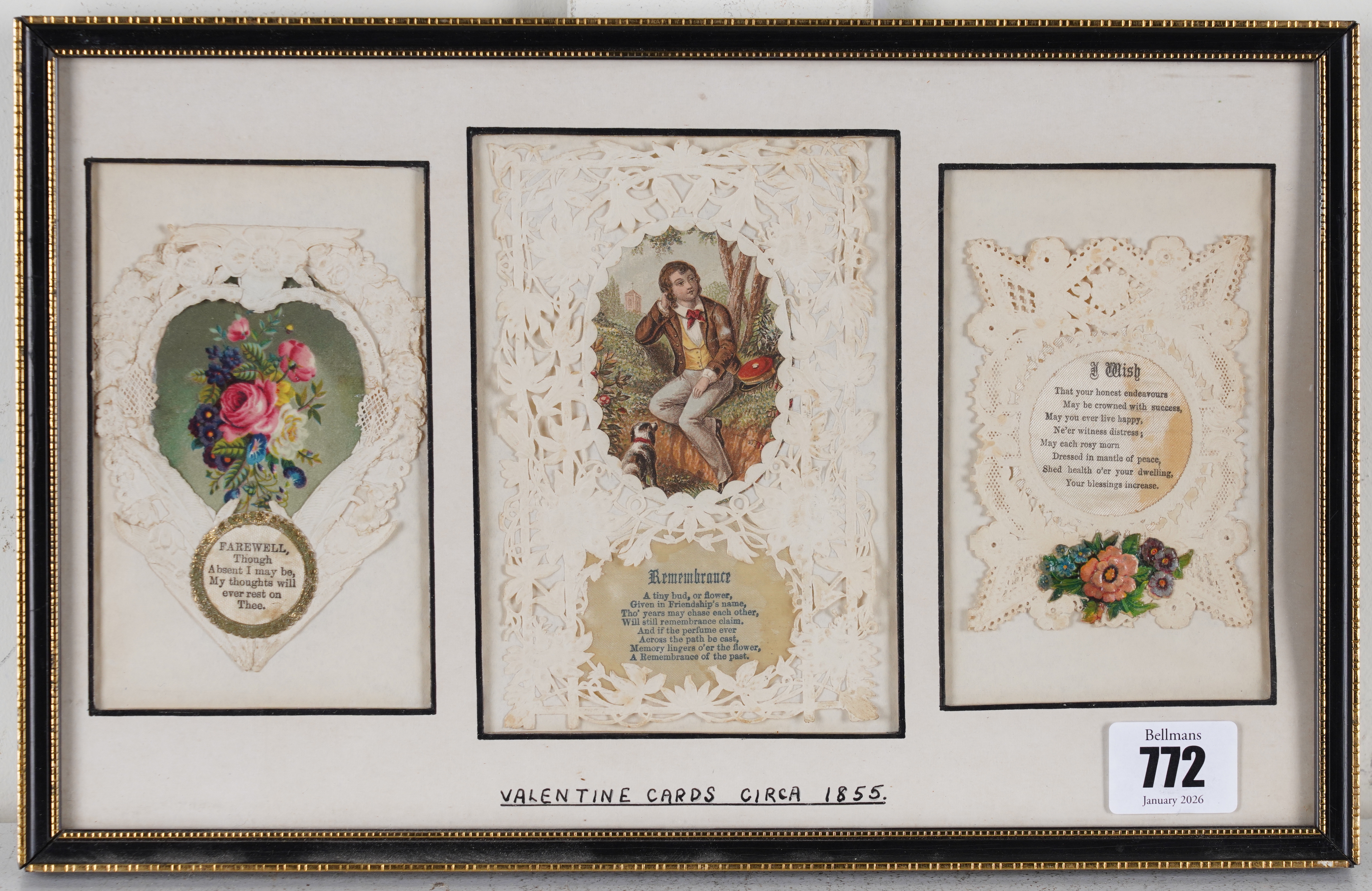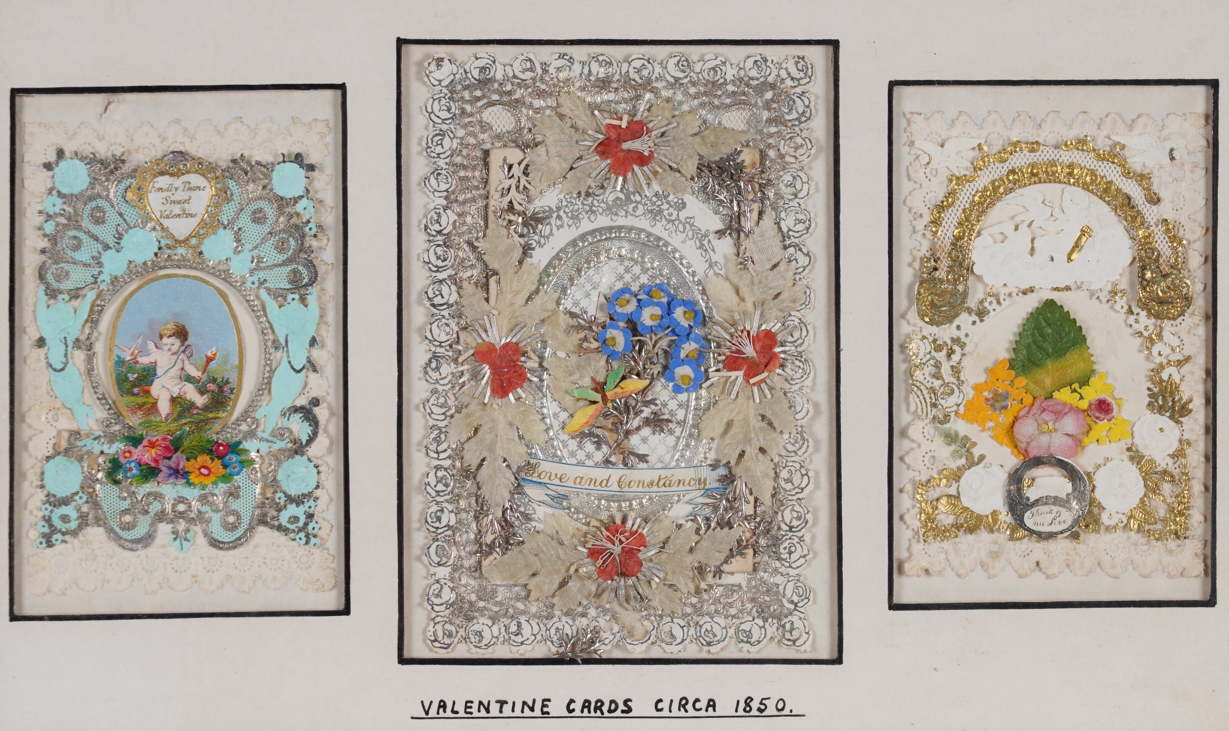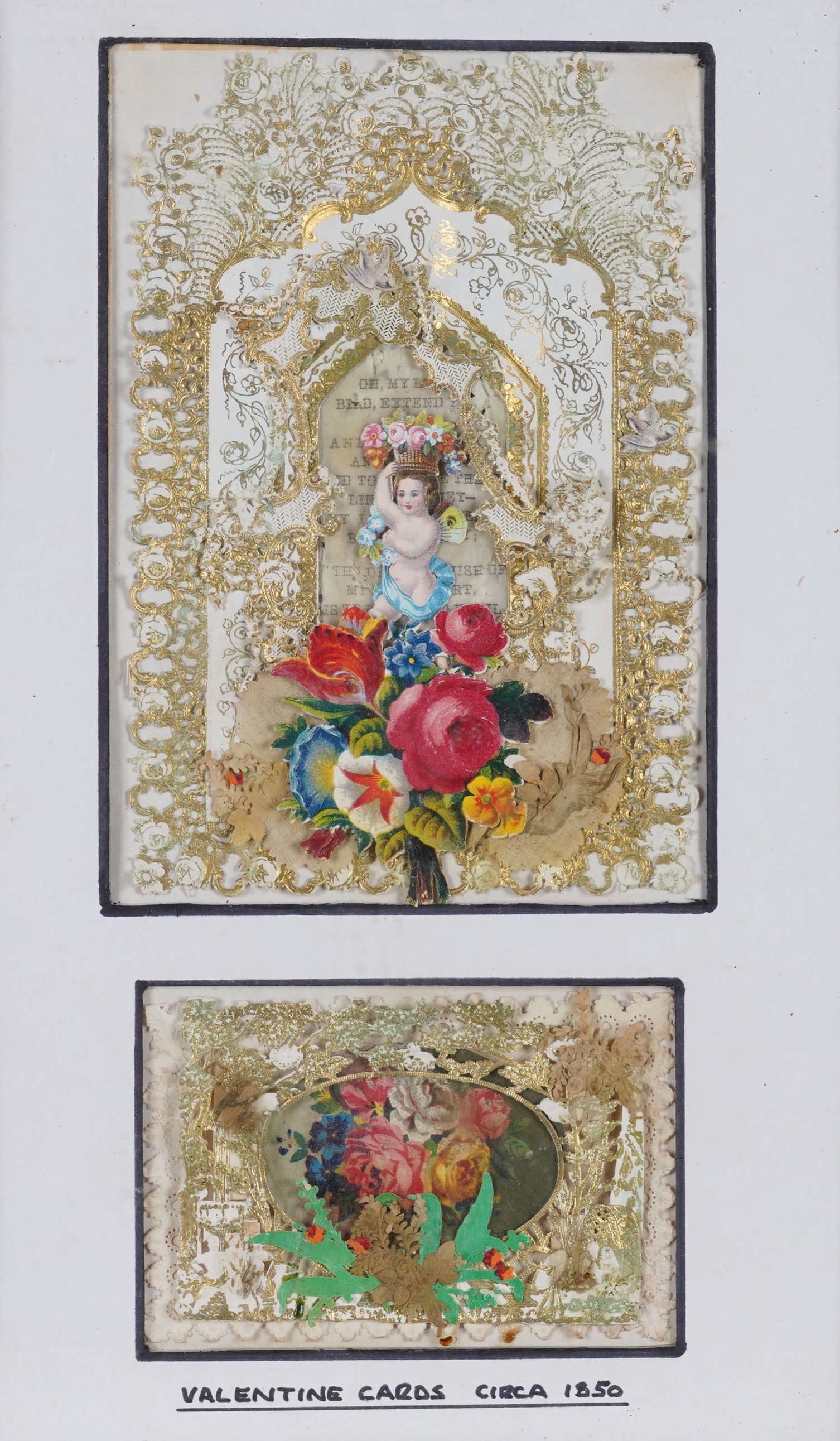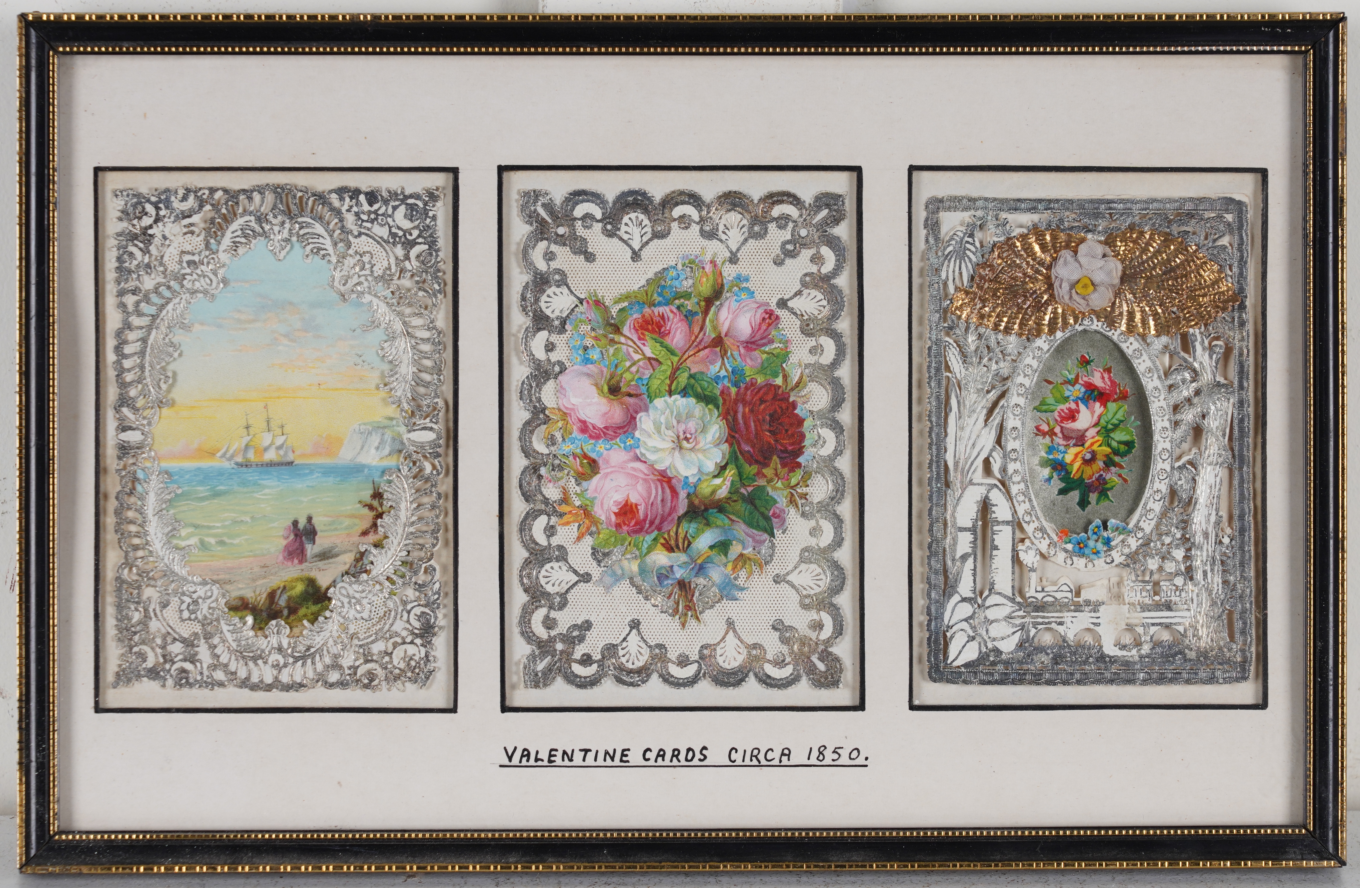 The cards variously constructed using paper lace, painted panels, cutwork details, decoupage and gold-leaf decoration, attributed verso to Mansell, Meek, Windsor and Mullord Brothers, each frame 32cm x 20cm