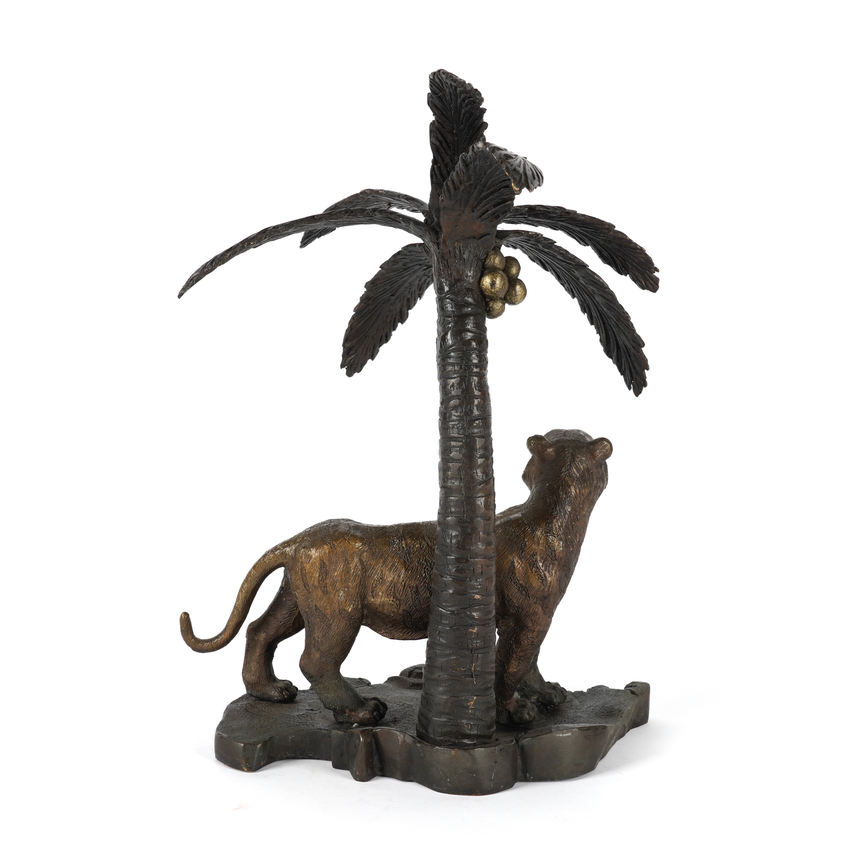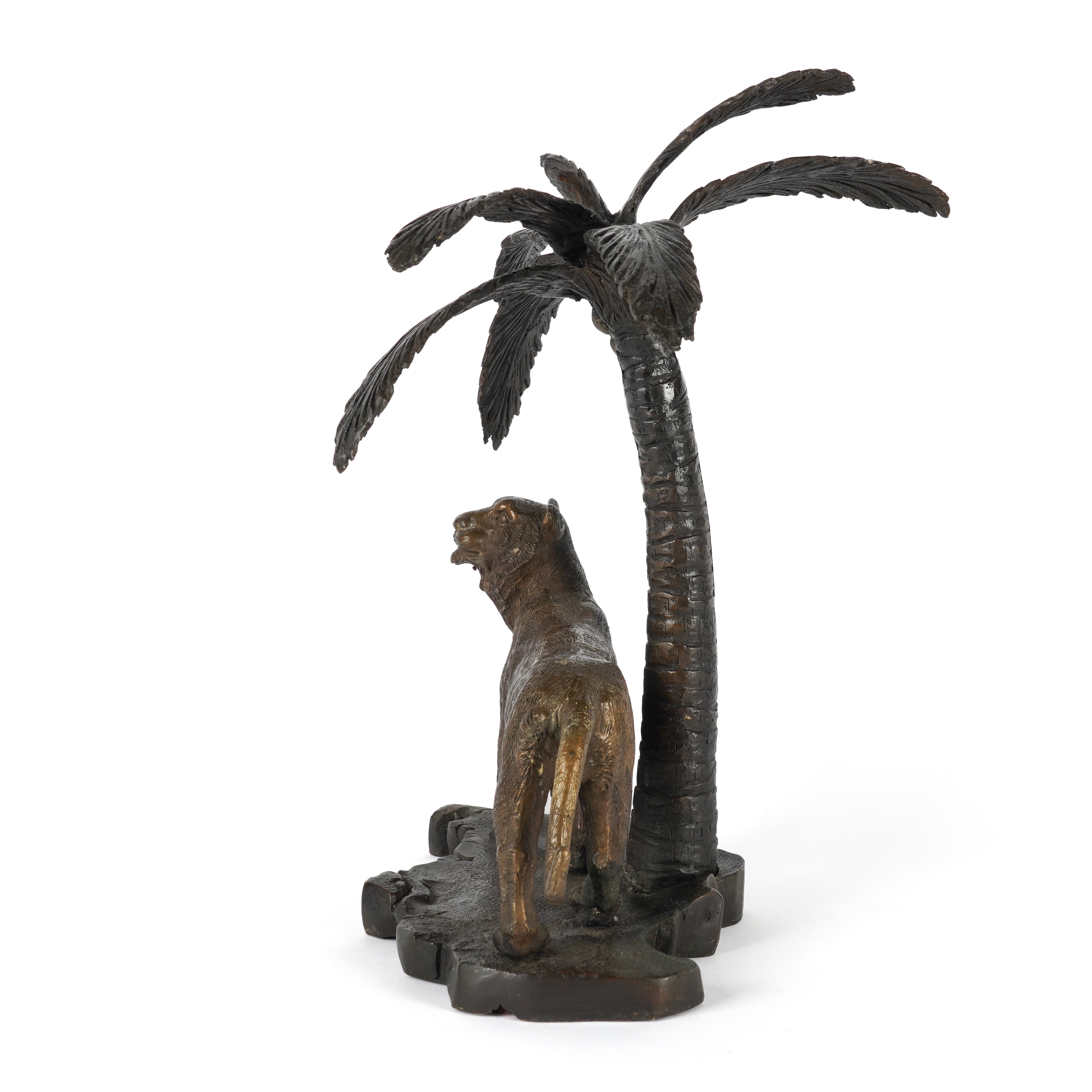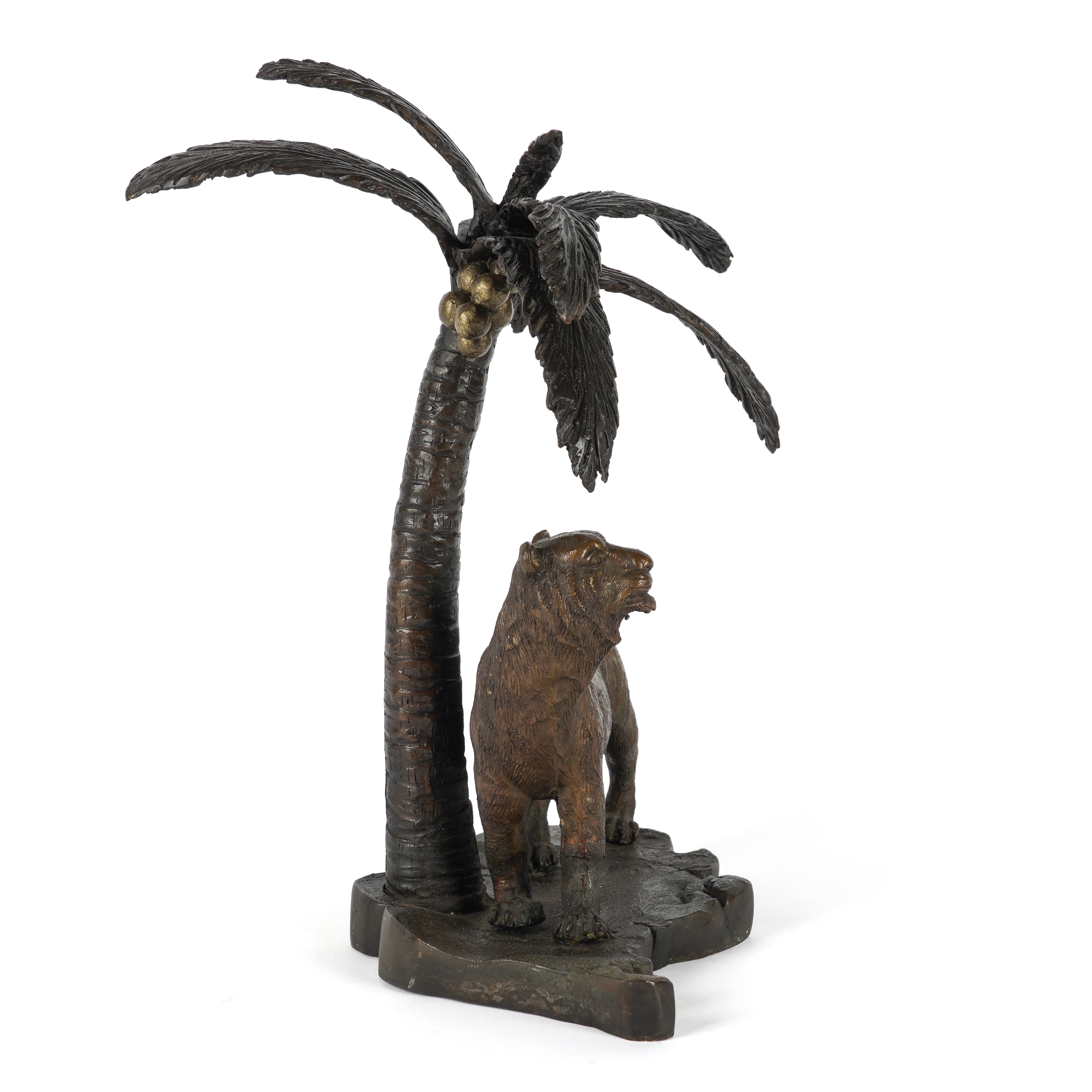 A PATINATED BRONZE MODEL OF A TIGER UNDER A PALM TREE