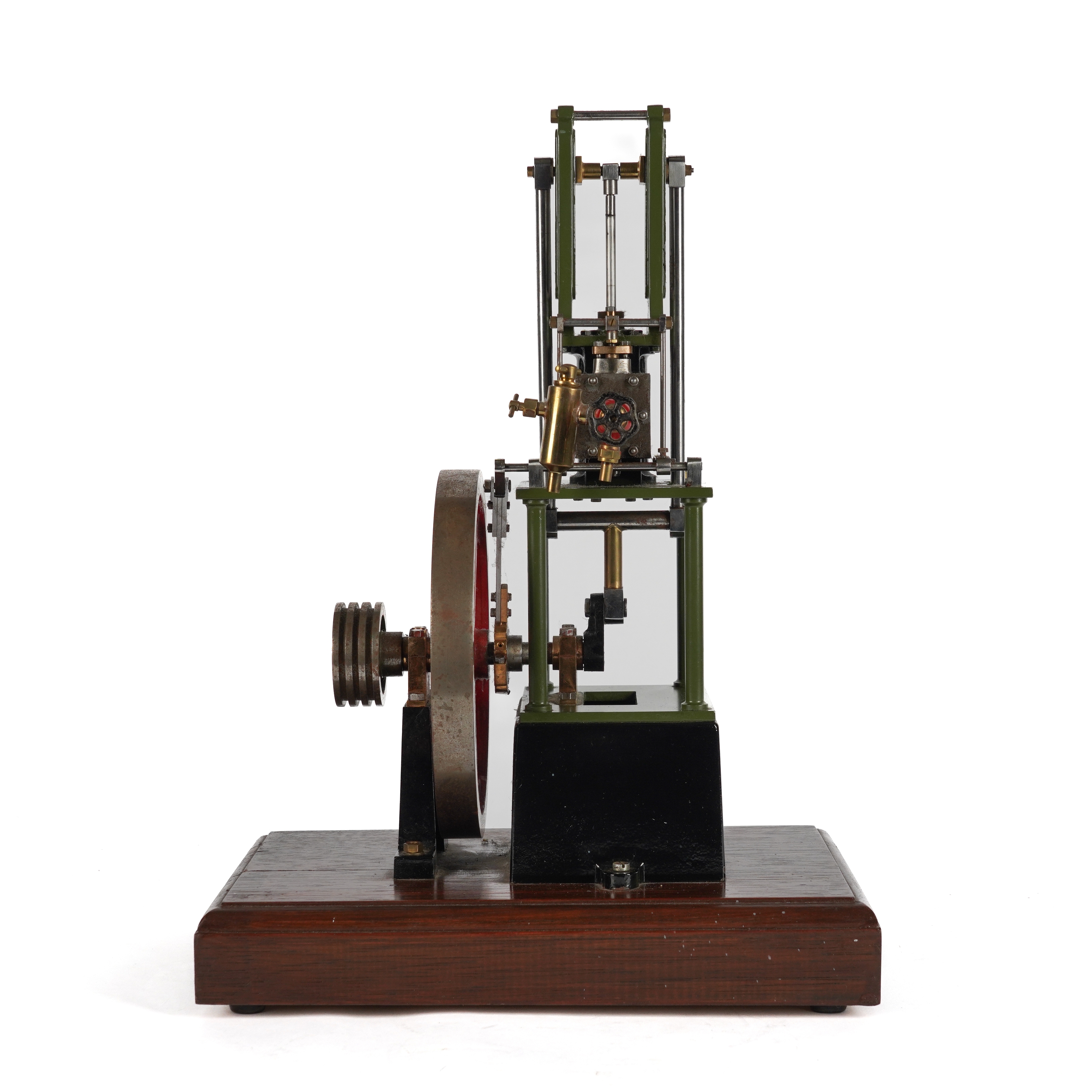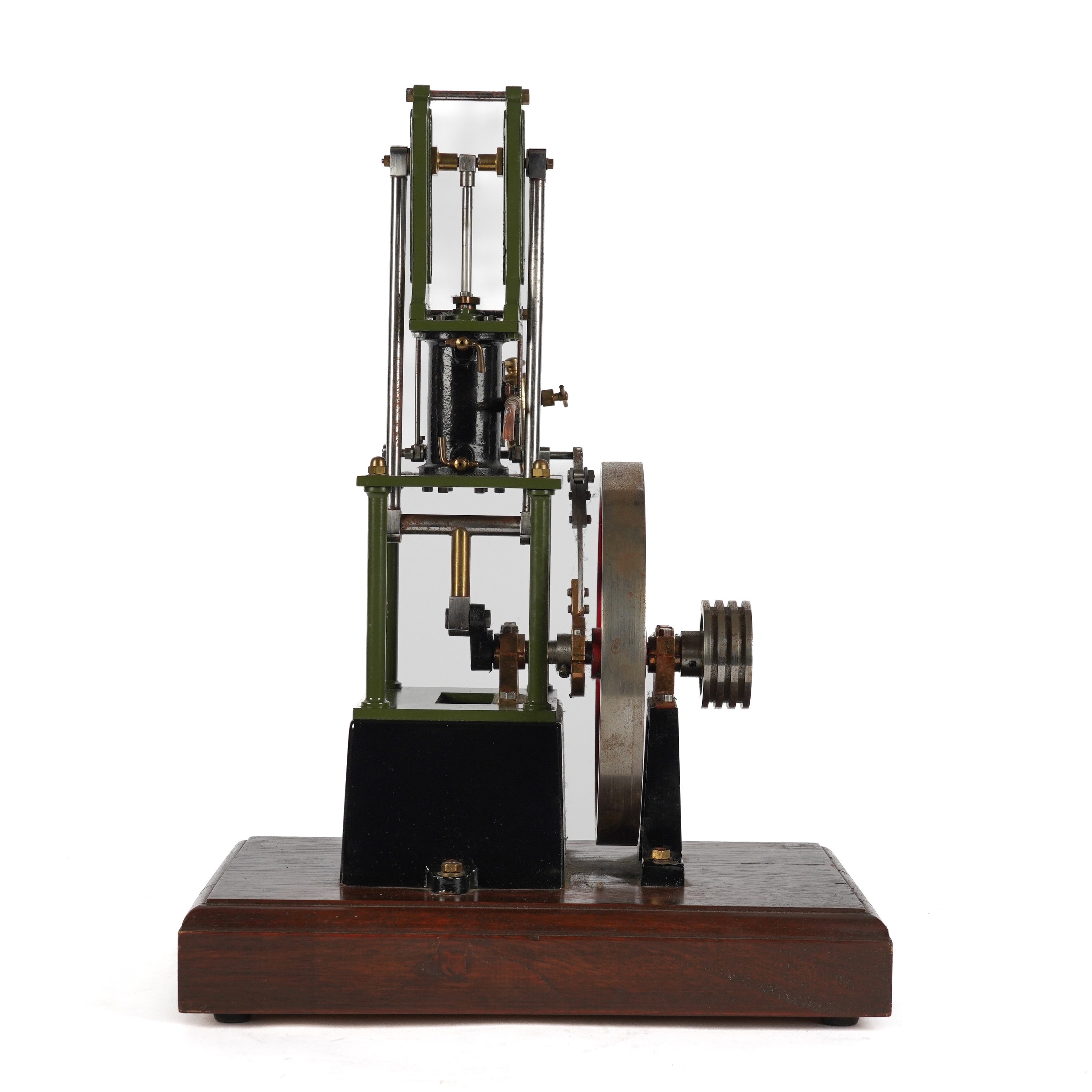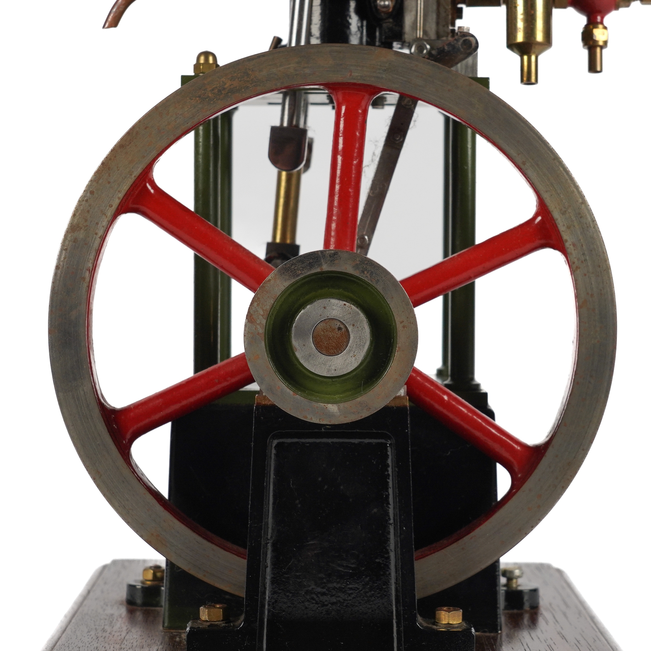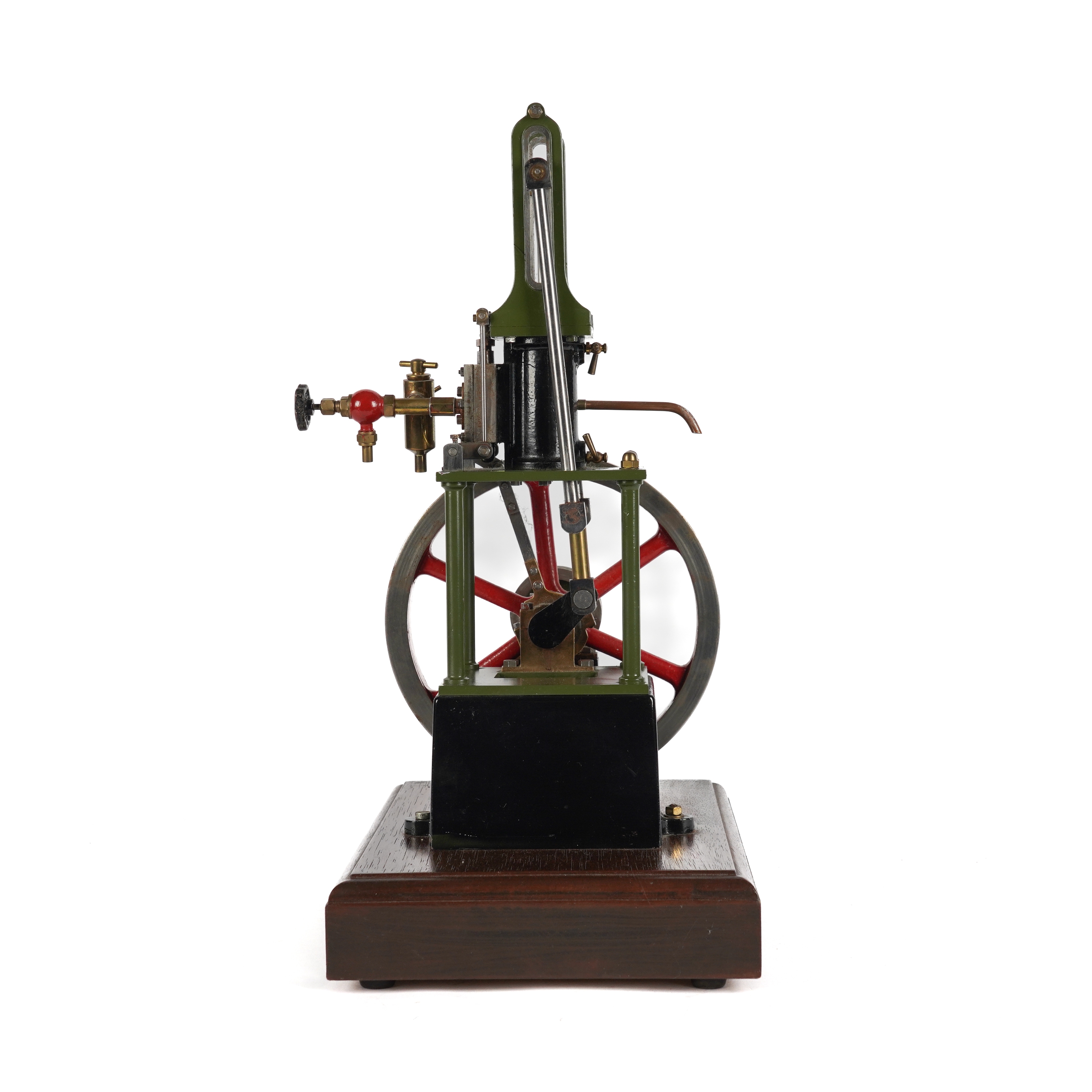 The model of a Stuart Turner 'James Coombe' table engine, with a single cylinder, a 7 inch diameter spoked flywheel. finished in green and red paintwork with polished bright-work, mounted on a wooden base, the model 36cm high, 42cm high including base